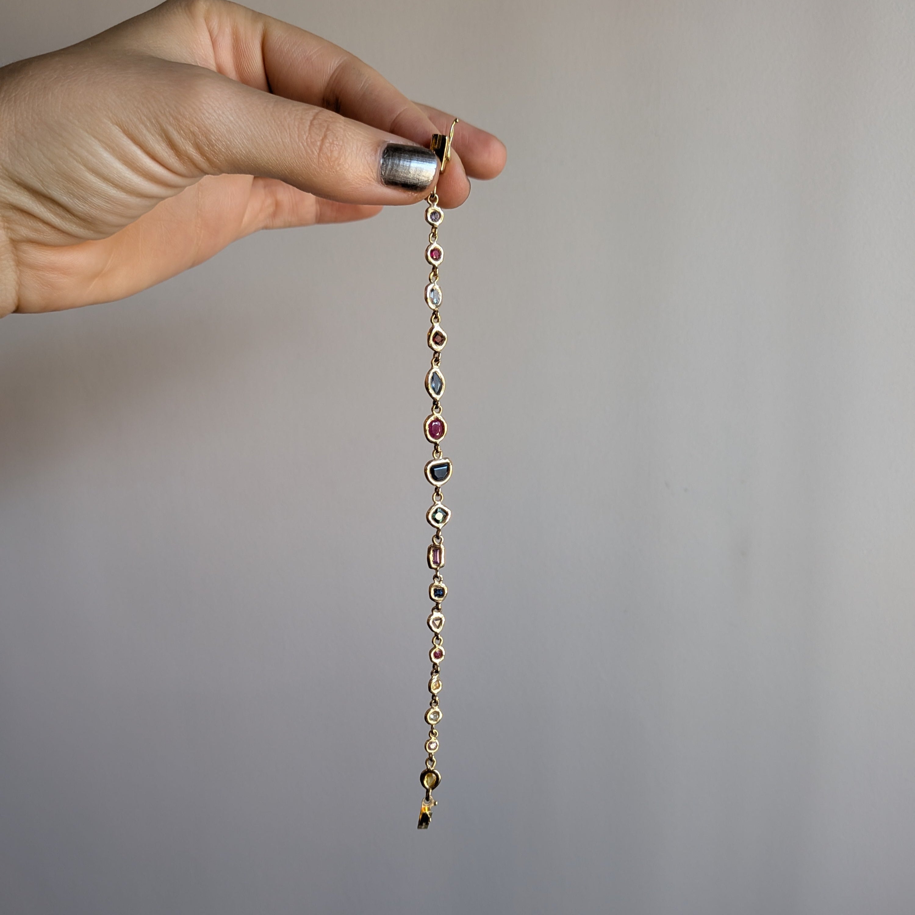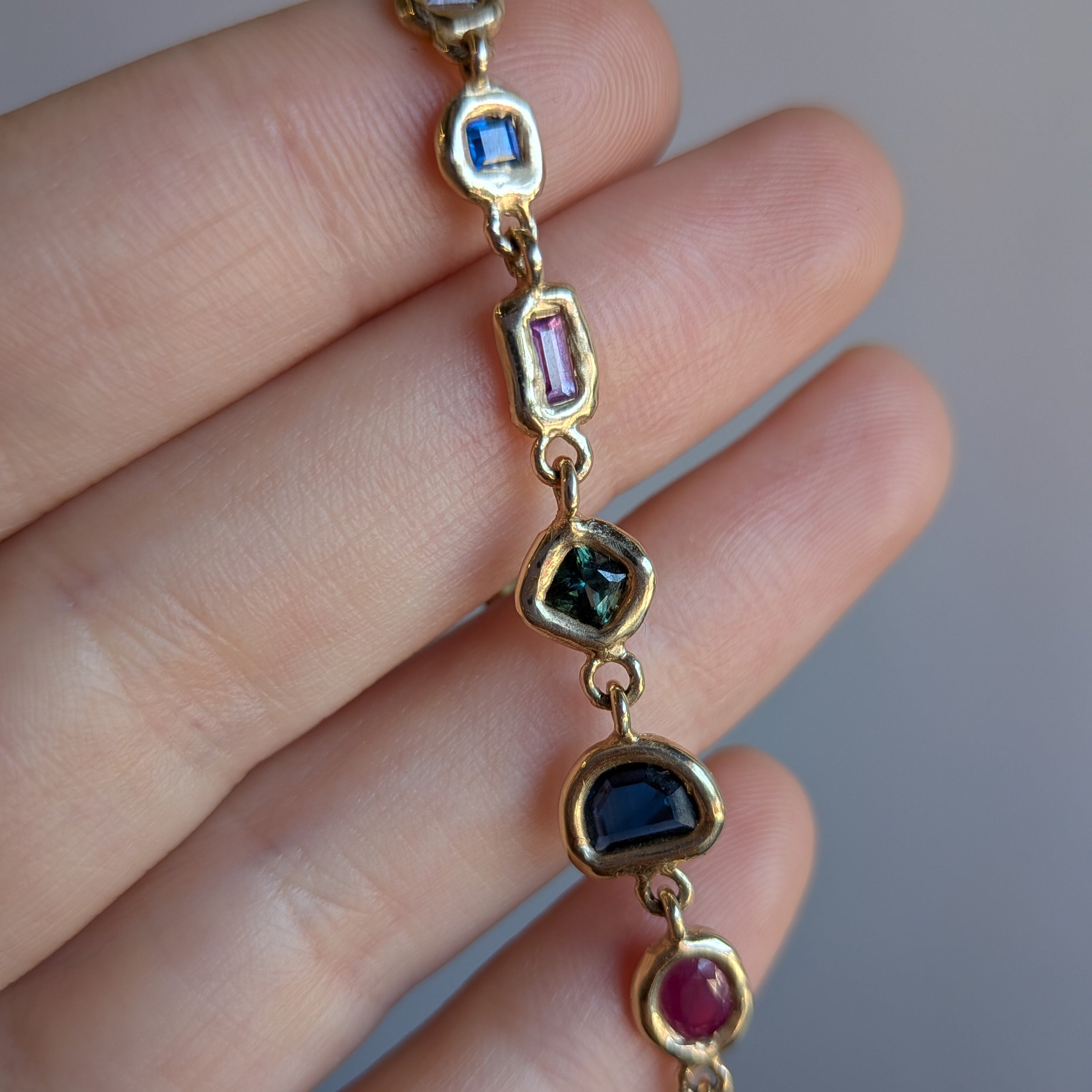 A colorful tennis bracelet with this unusual design from Adeline. Sapphires, garnet, spinel, and ruby are wrapped in gold and linked together to form a sparkling, kinetic chain.
