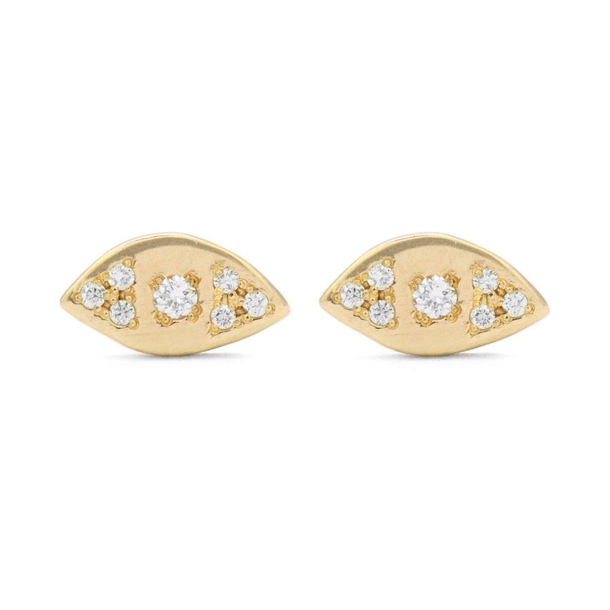 Gold marquise shaped stud earrings with bead-set diamonds.