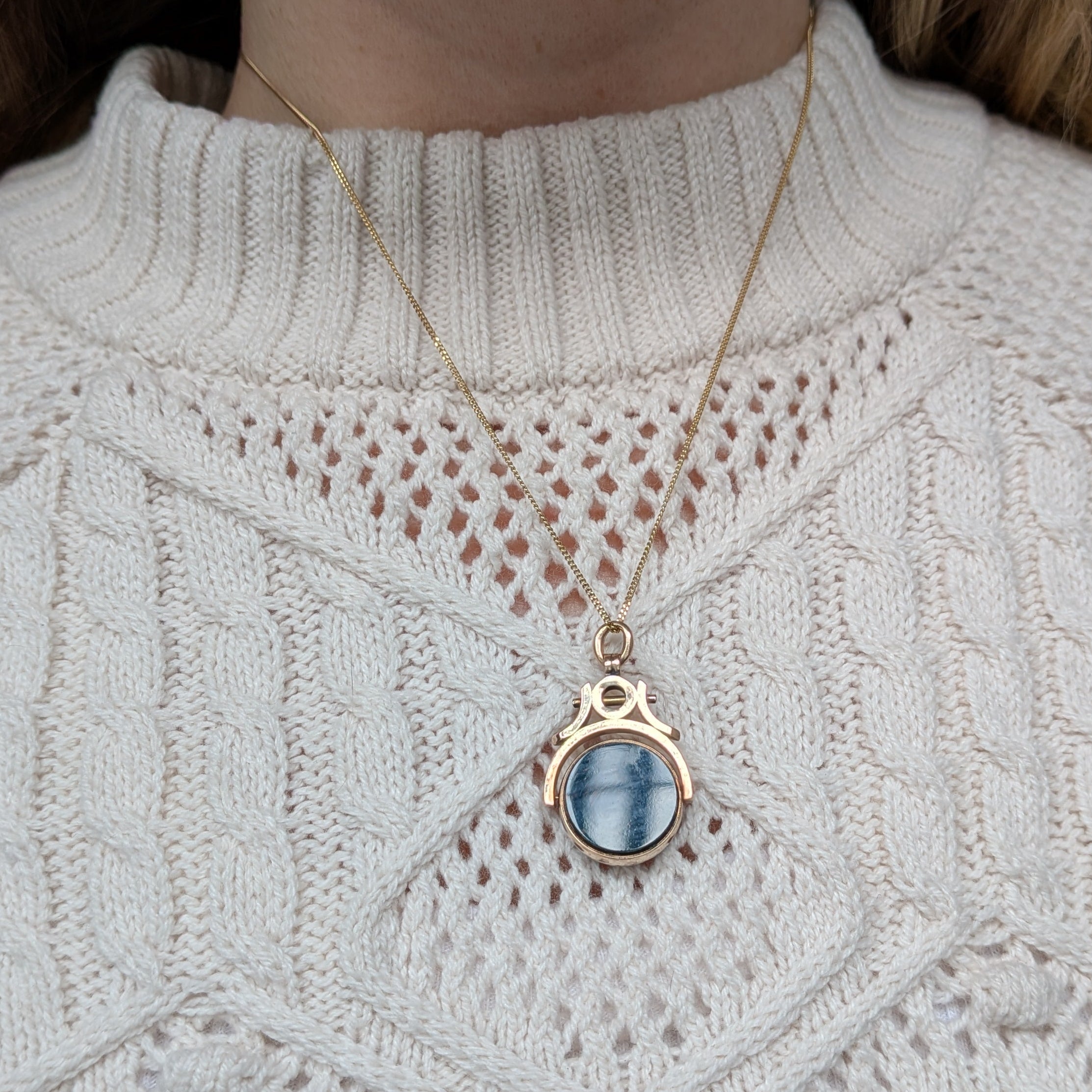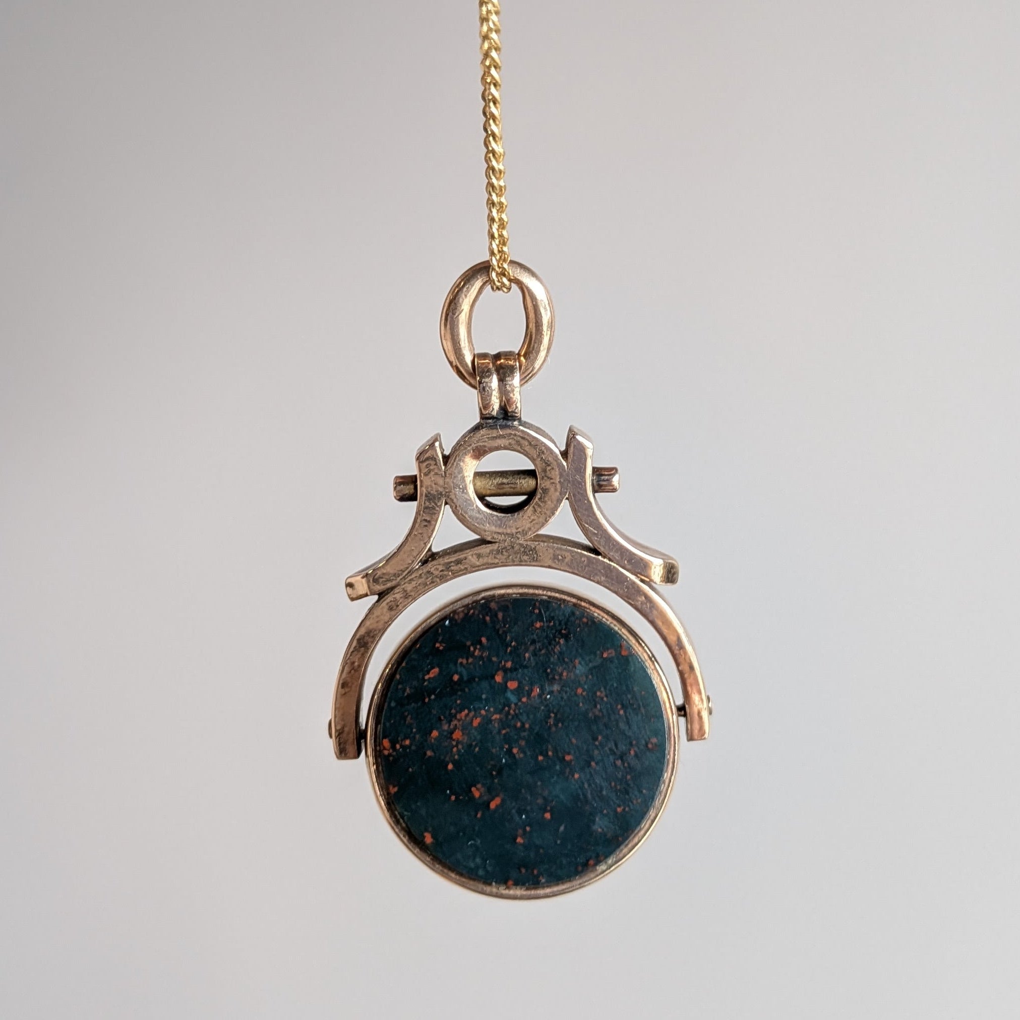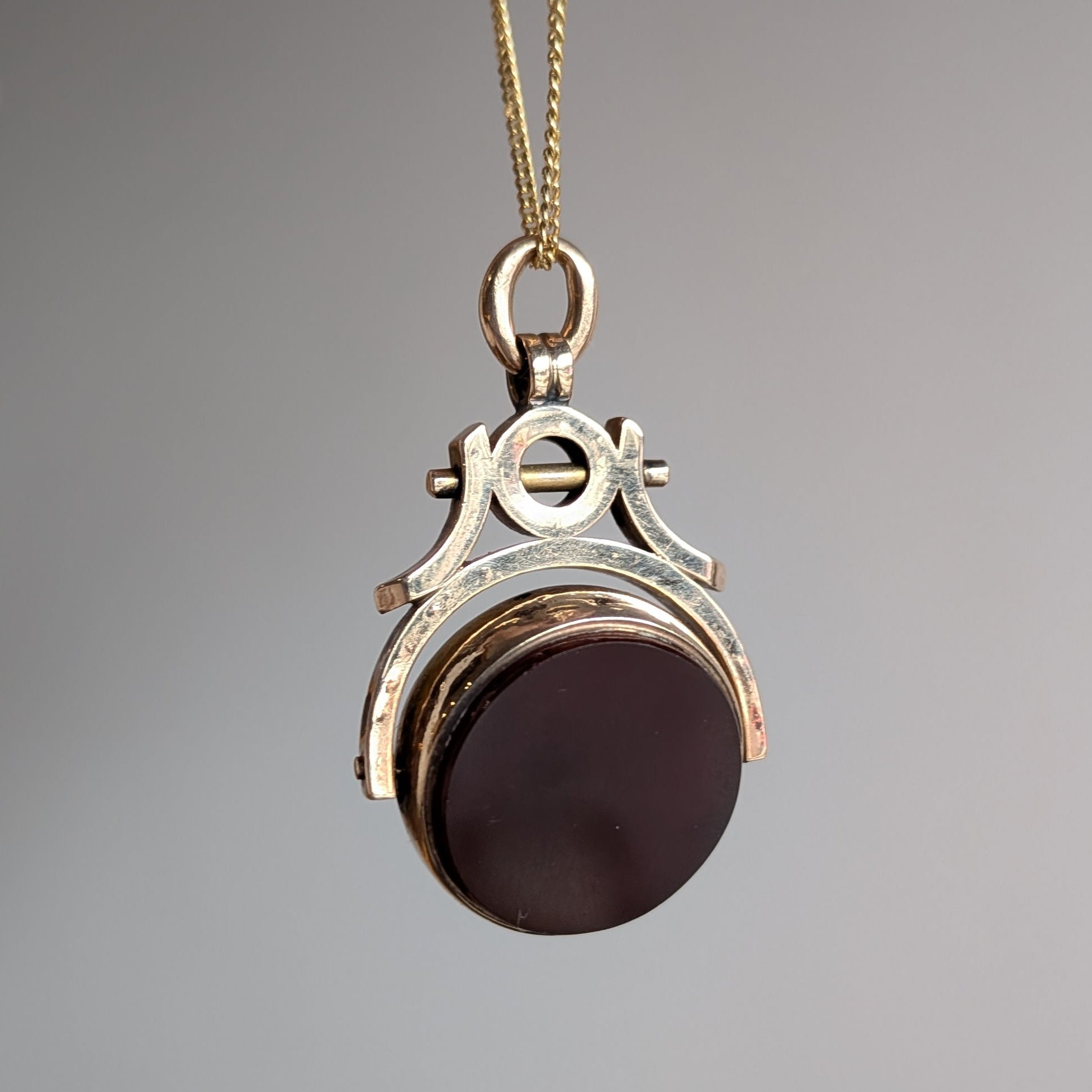 A classic spinner pendant in luscious, rosy Victorian 9 ct gold. The reversible fob swivels to reveal a slab of bloodstone on one side and carnelian on the other side. A true collector's piece!