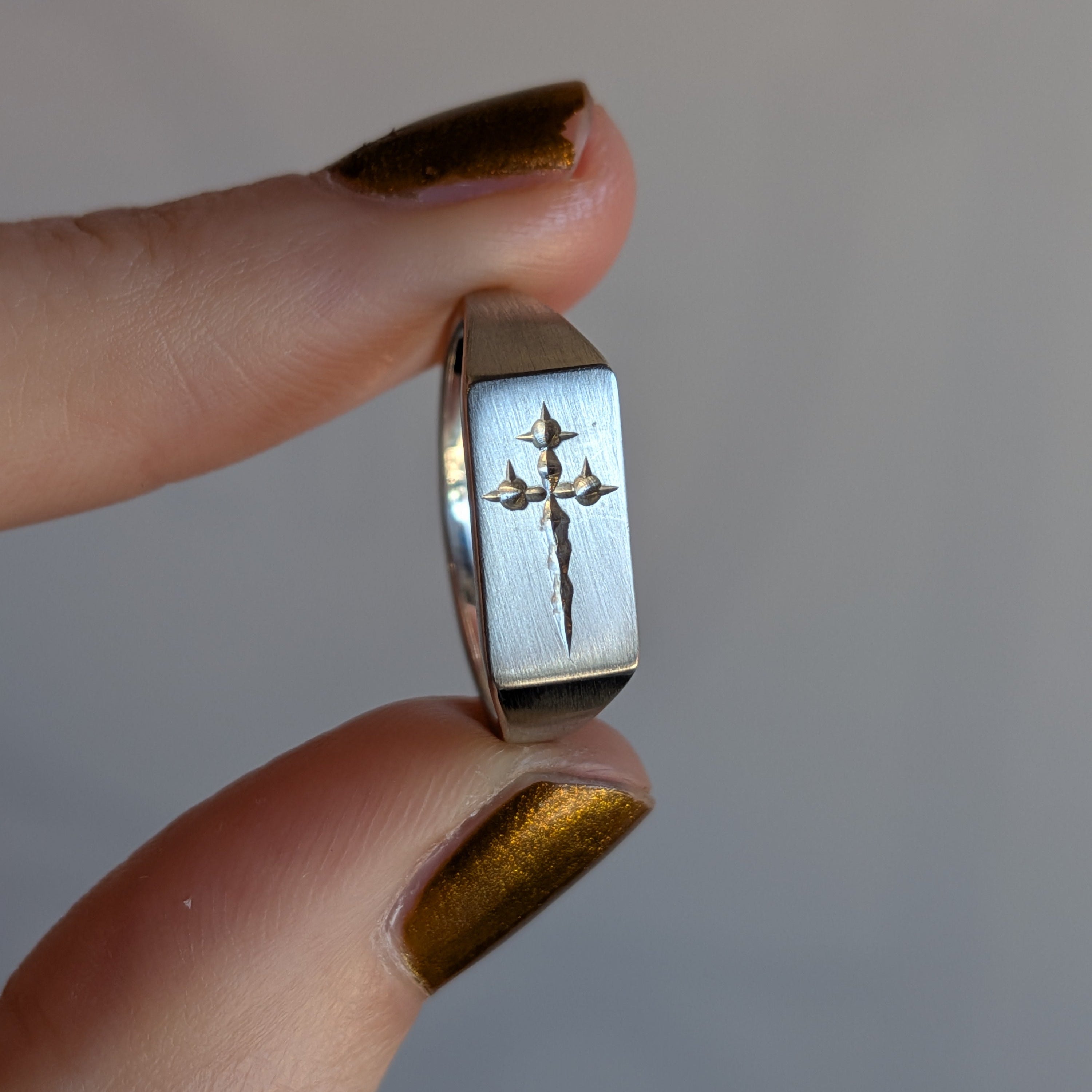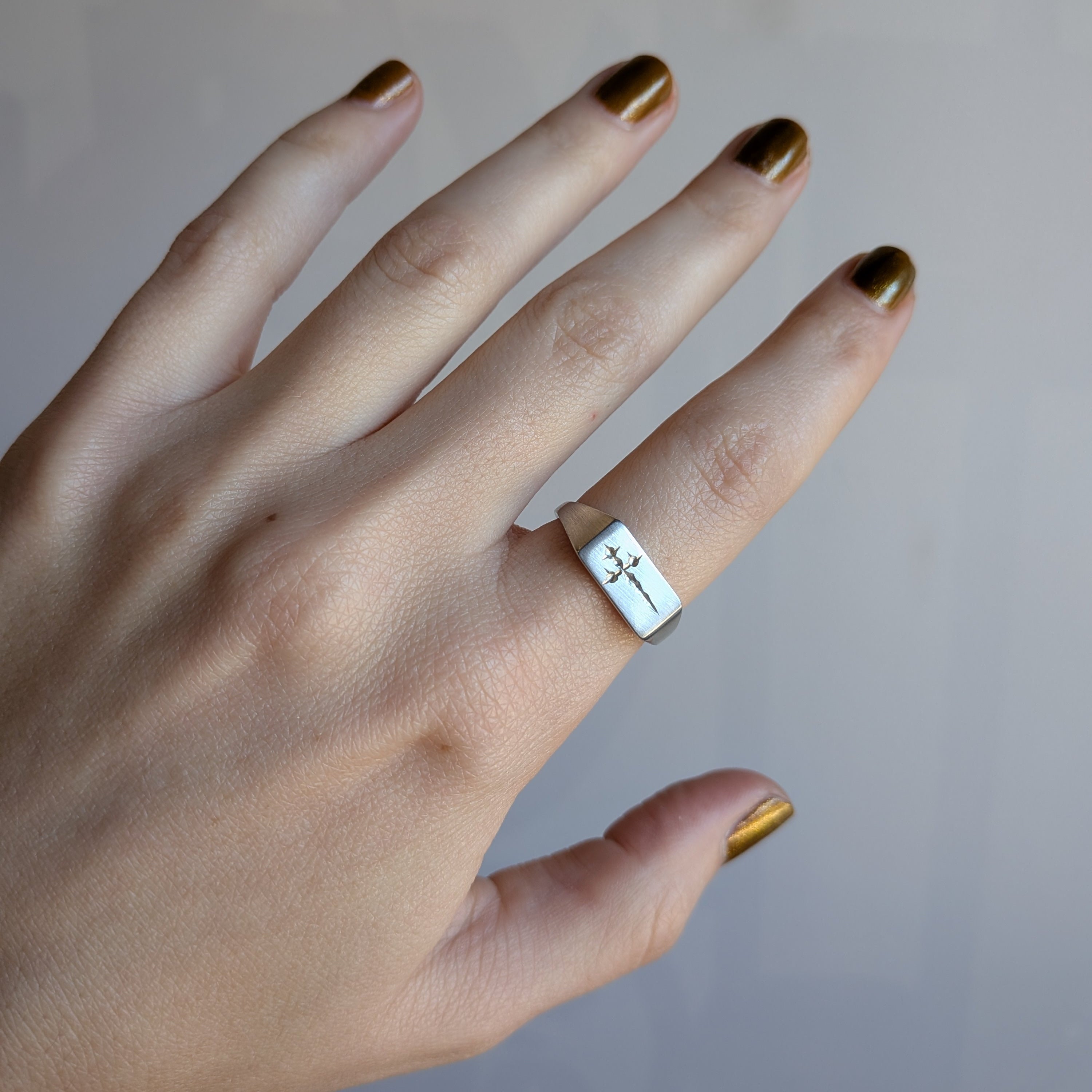 These sterling silver signet rings feature a bright cut hand engraved wavy dagger weapon in the center. Due to the handmade nature, each weapon will vary slightly and have unique details.