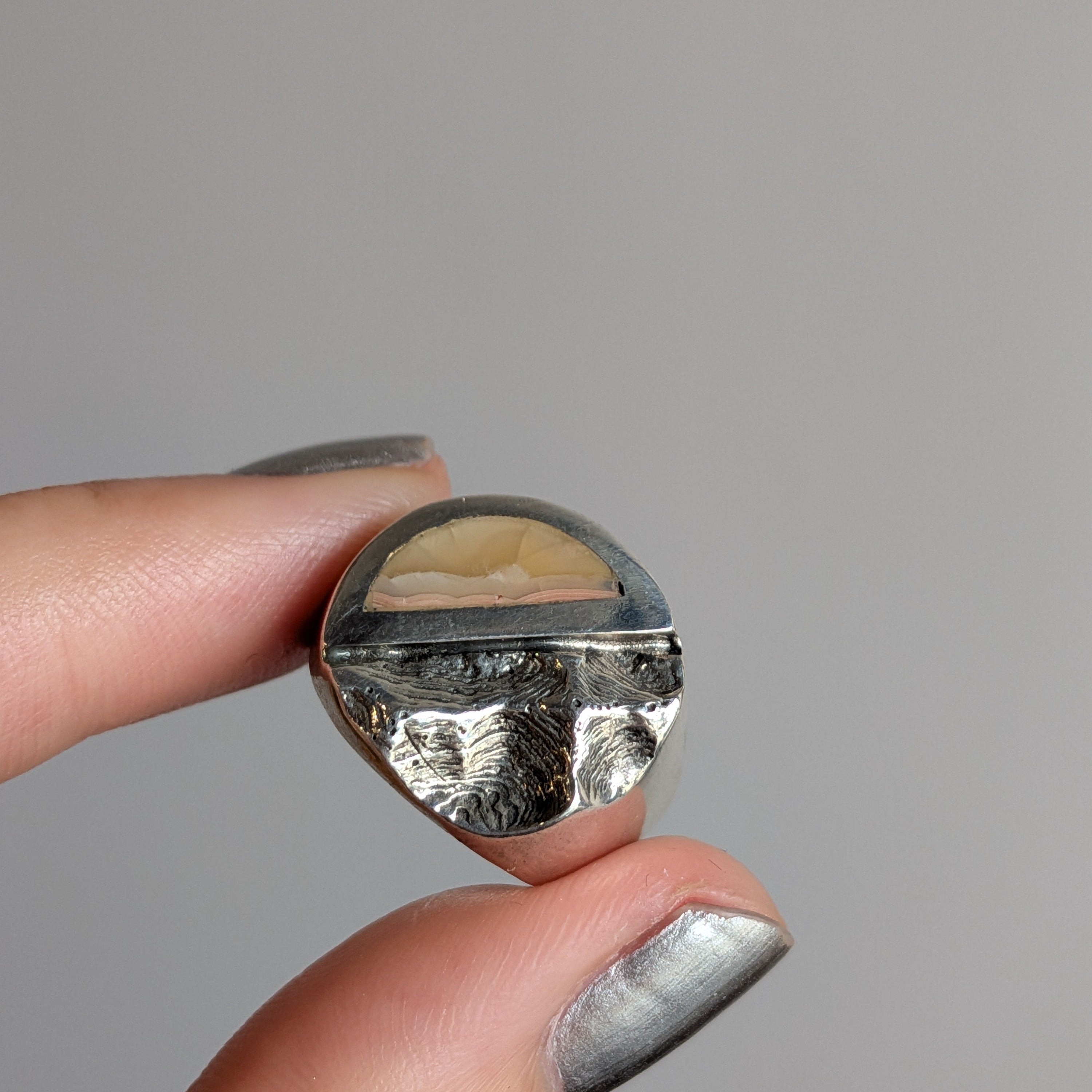Sterling silver round signet ring with topographically accurate details of Brekenridge, CO (peaks 9 and 10) and agate inlay.