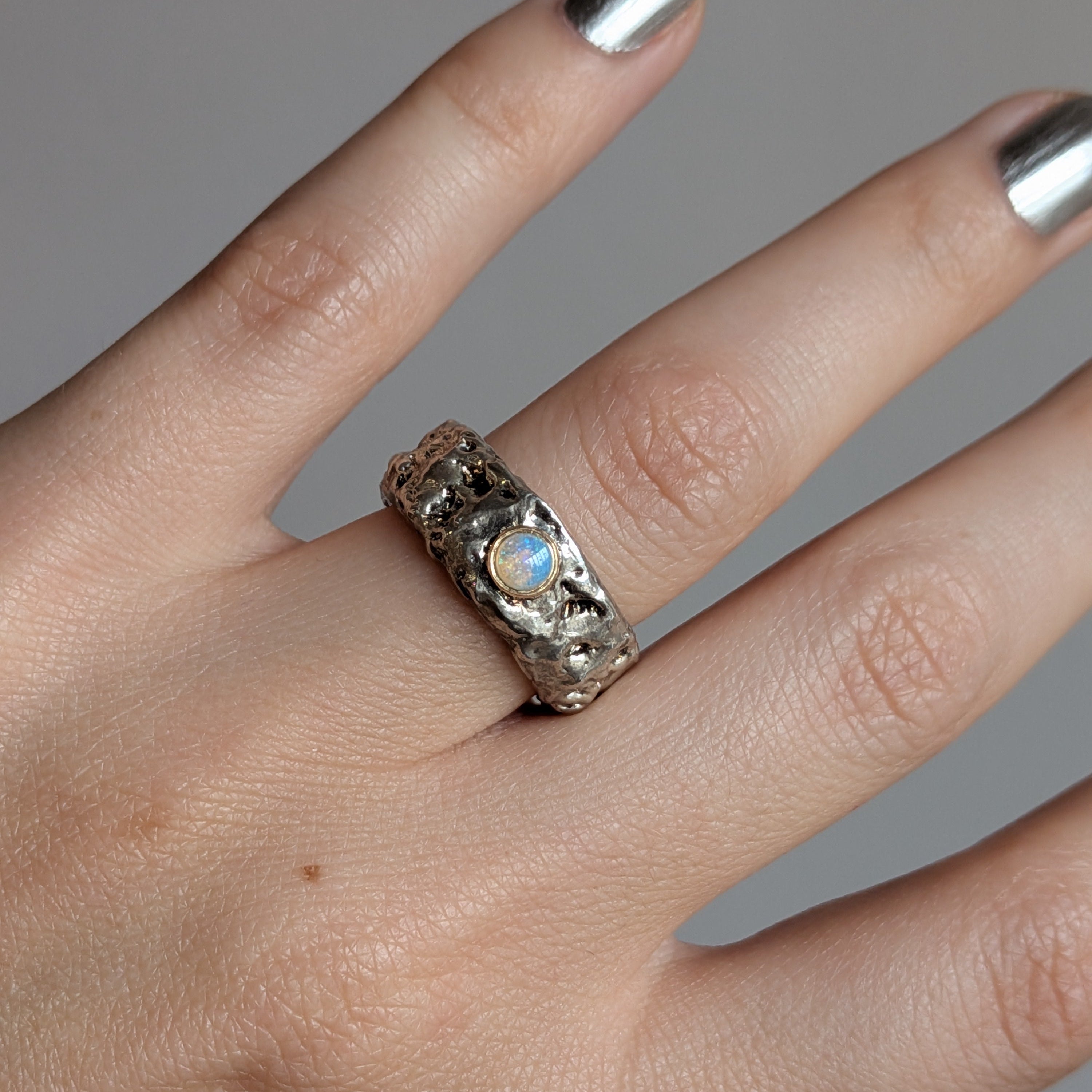Brutalist-style sterling silver organic texture band with opal cabochon set in 14k yellow gold.