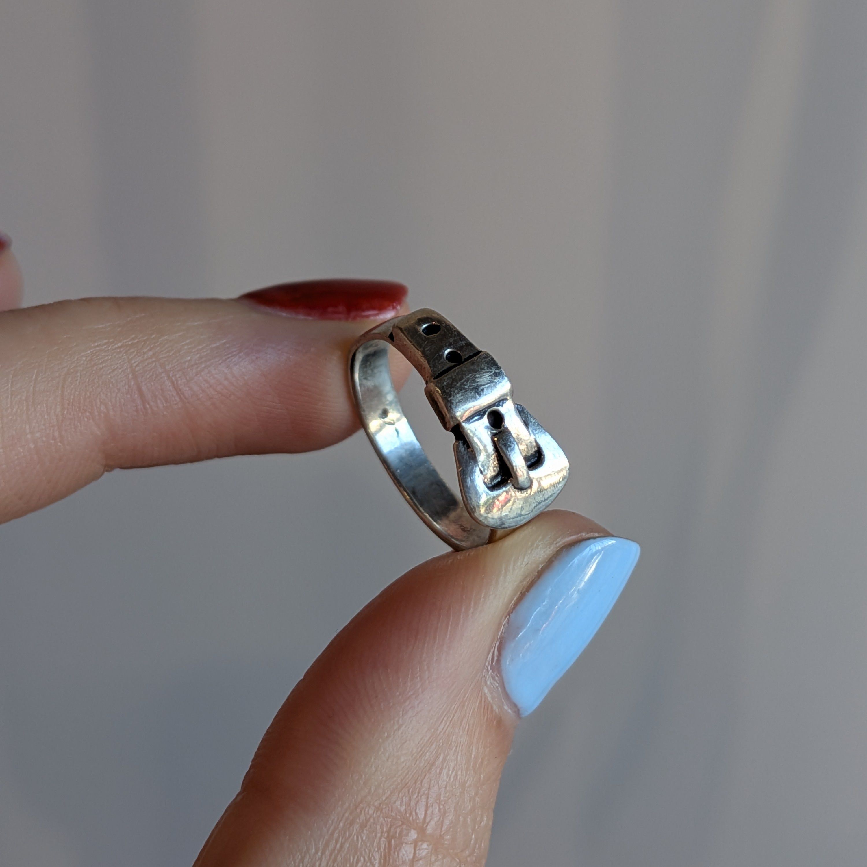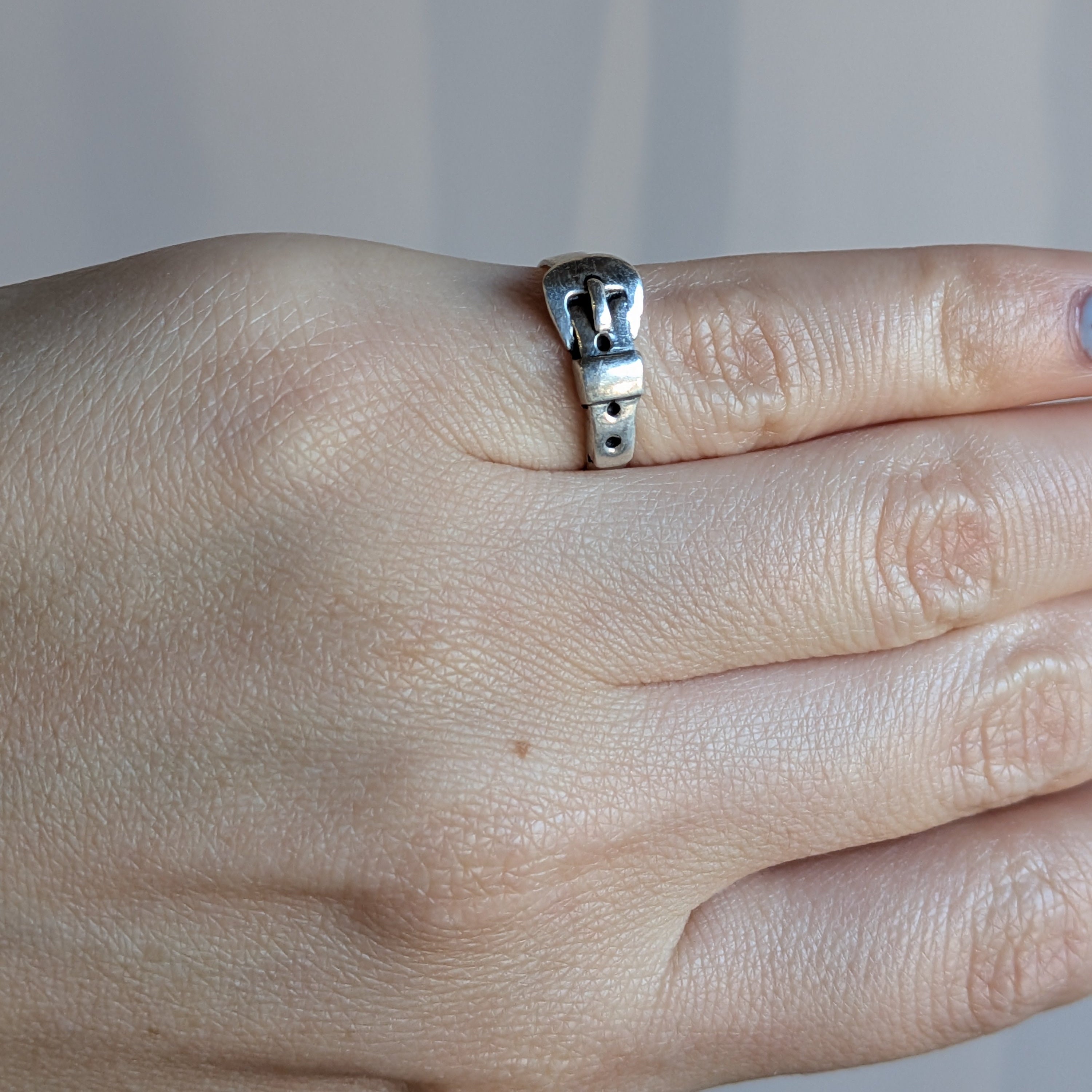 Sterling silver cast ring with buckle details.