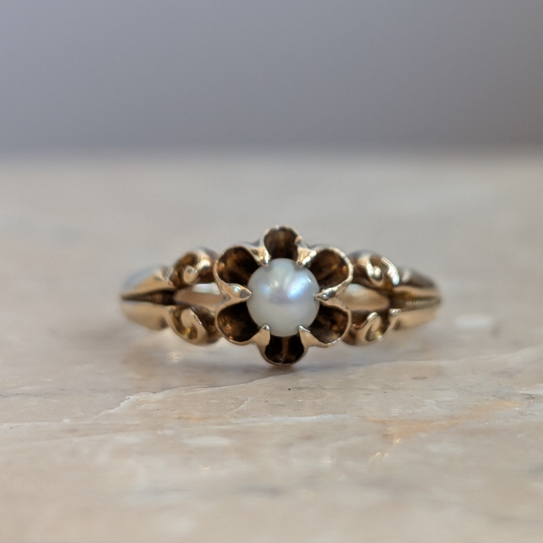 Curlicues and scrolls wind their way up the shoulders of this ring to form a little buttercup-like flower setting holding a small white pearl.