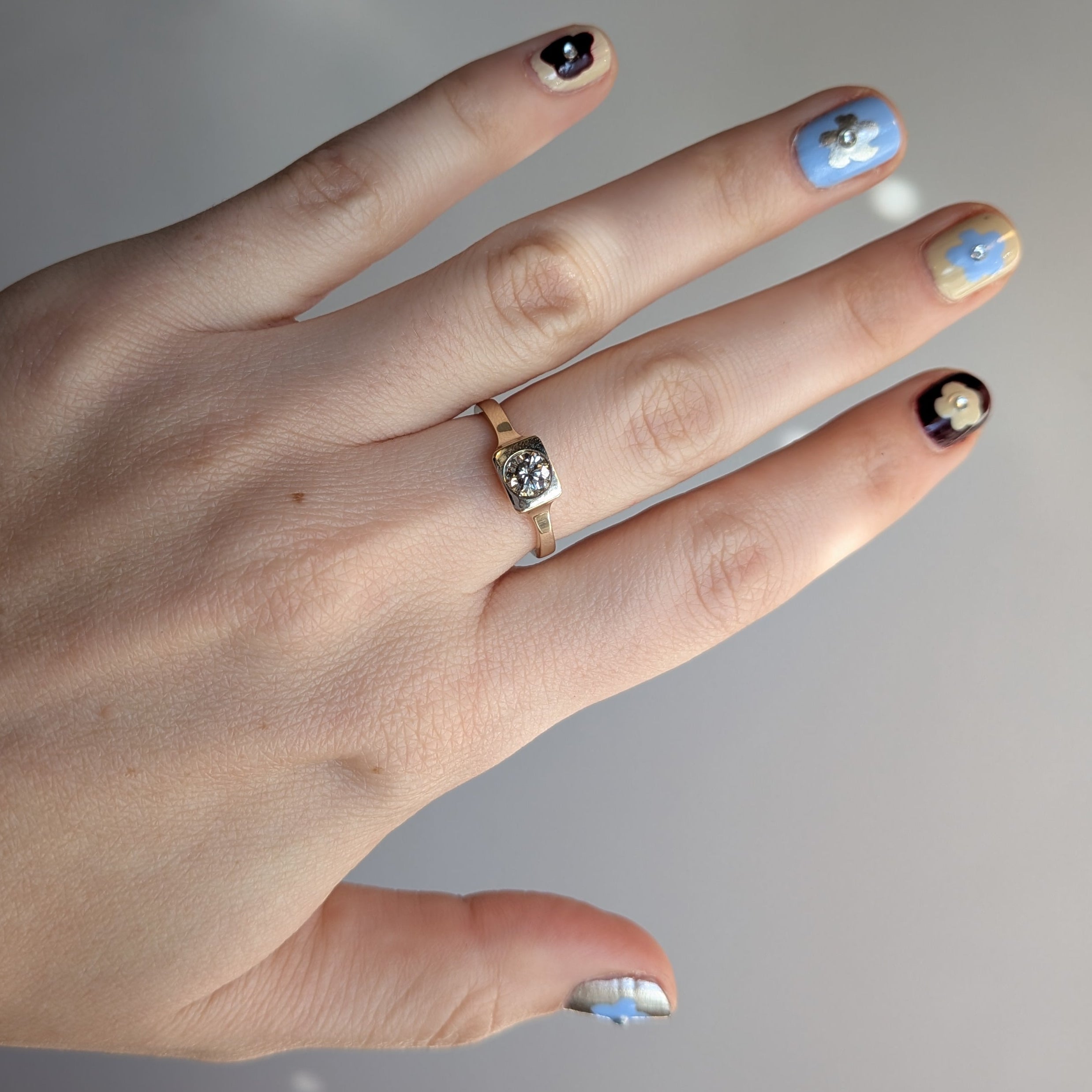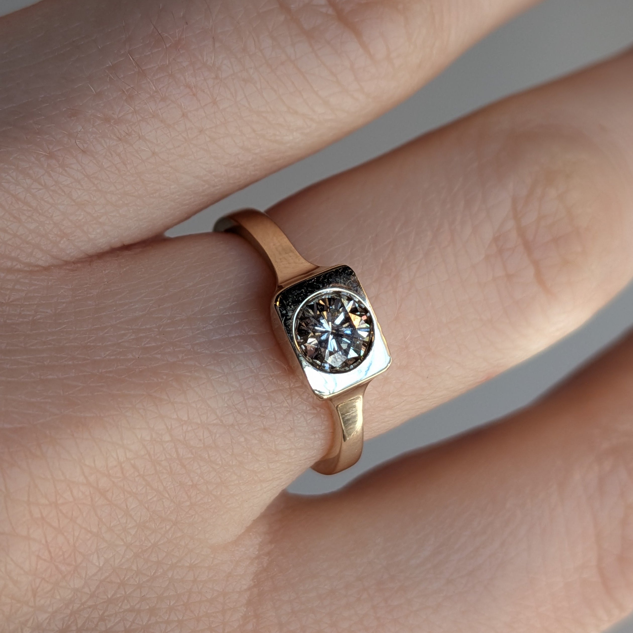 A play on form, shape, and negative space, the Capsule Solitaires are deceptively simple. A delicious champagne diamond nestles encapsulated within a rounded square setting in 14k gold.