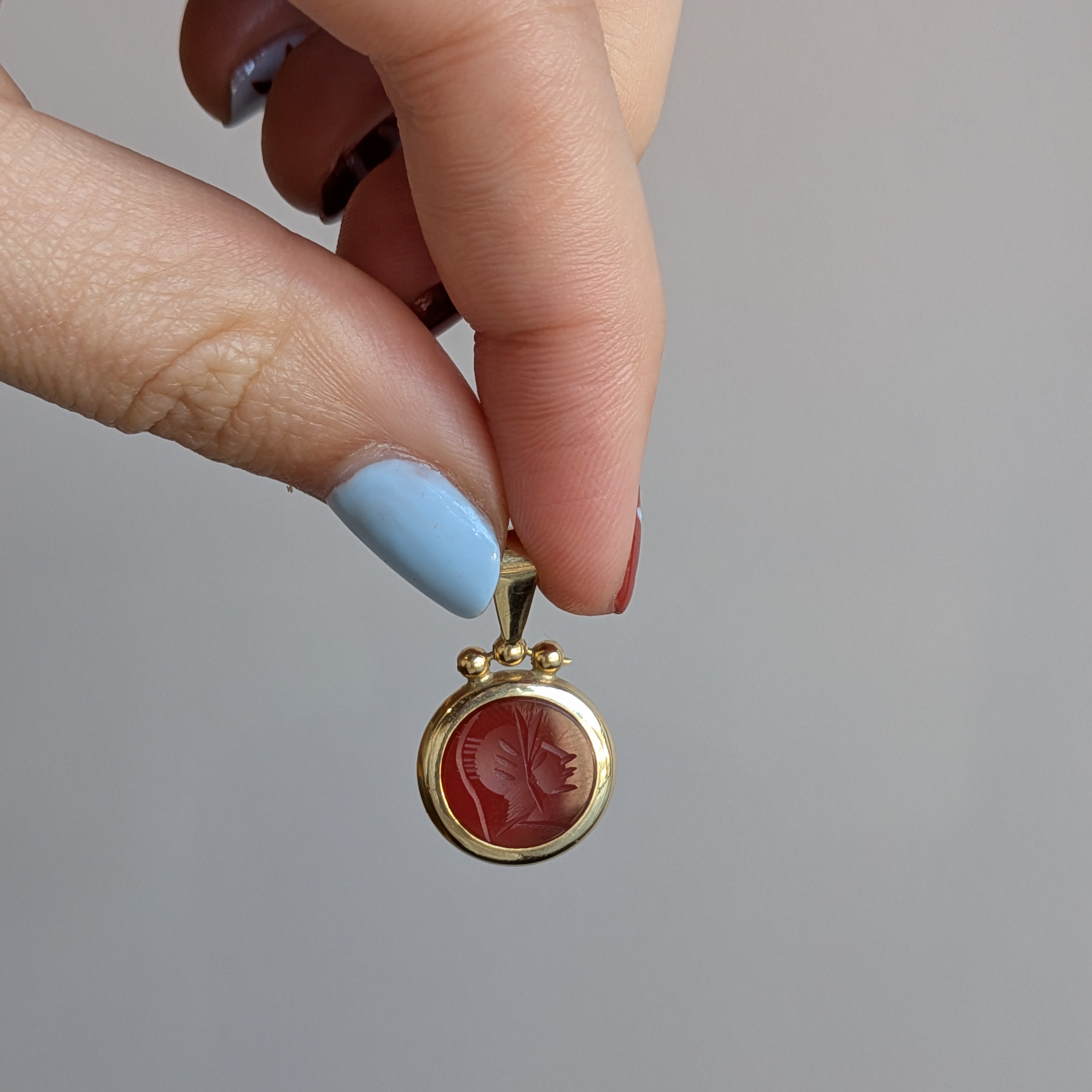 Beautiful 14k yellow gold carnelian intaglio pendant with articulated hinge at the bail.