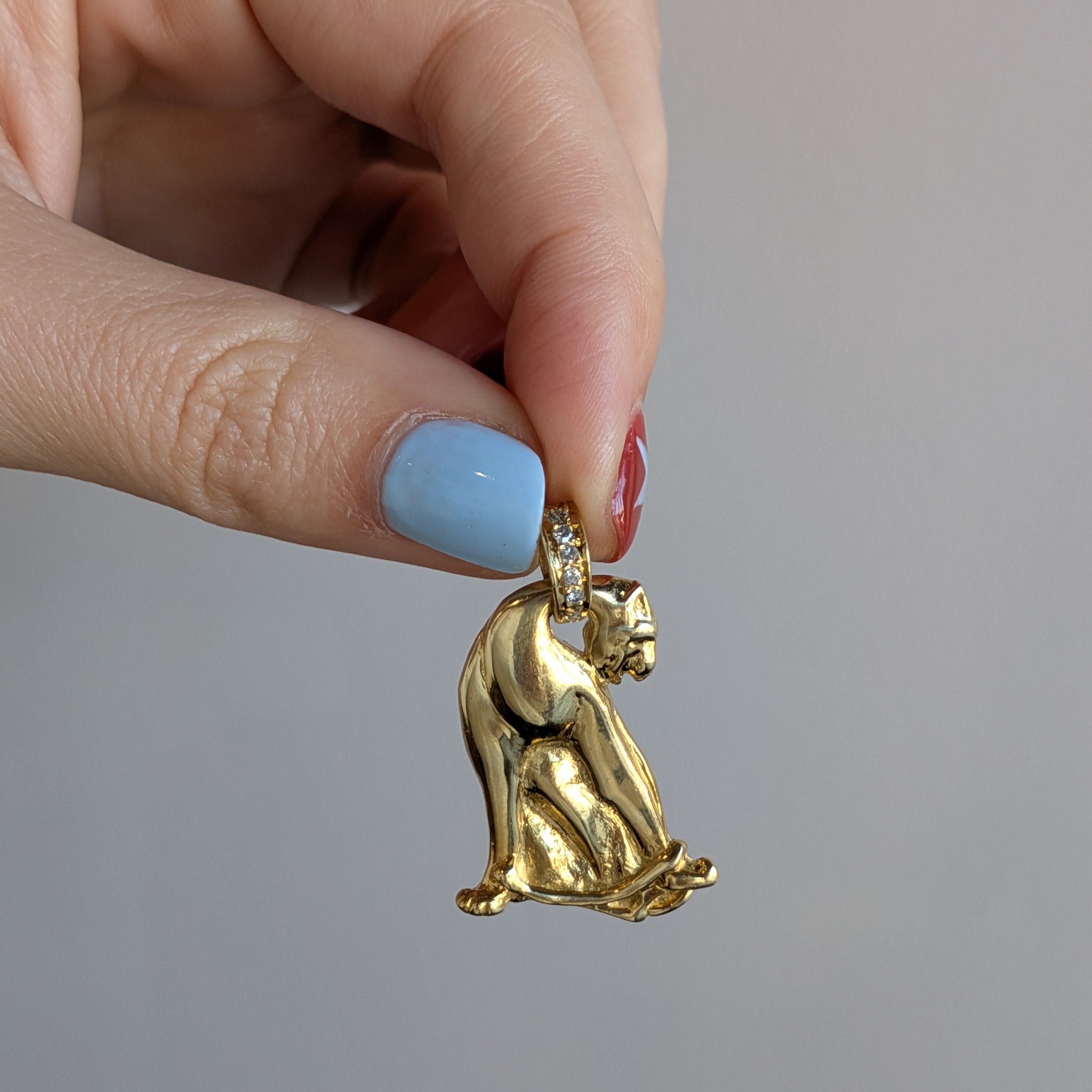 Slinky but substantial panther pendant in high karat (over 18k) yellow gold with diamond accents on bail.