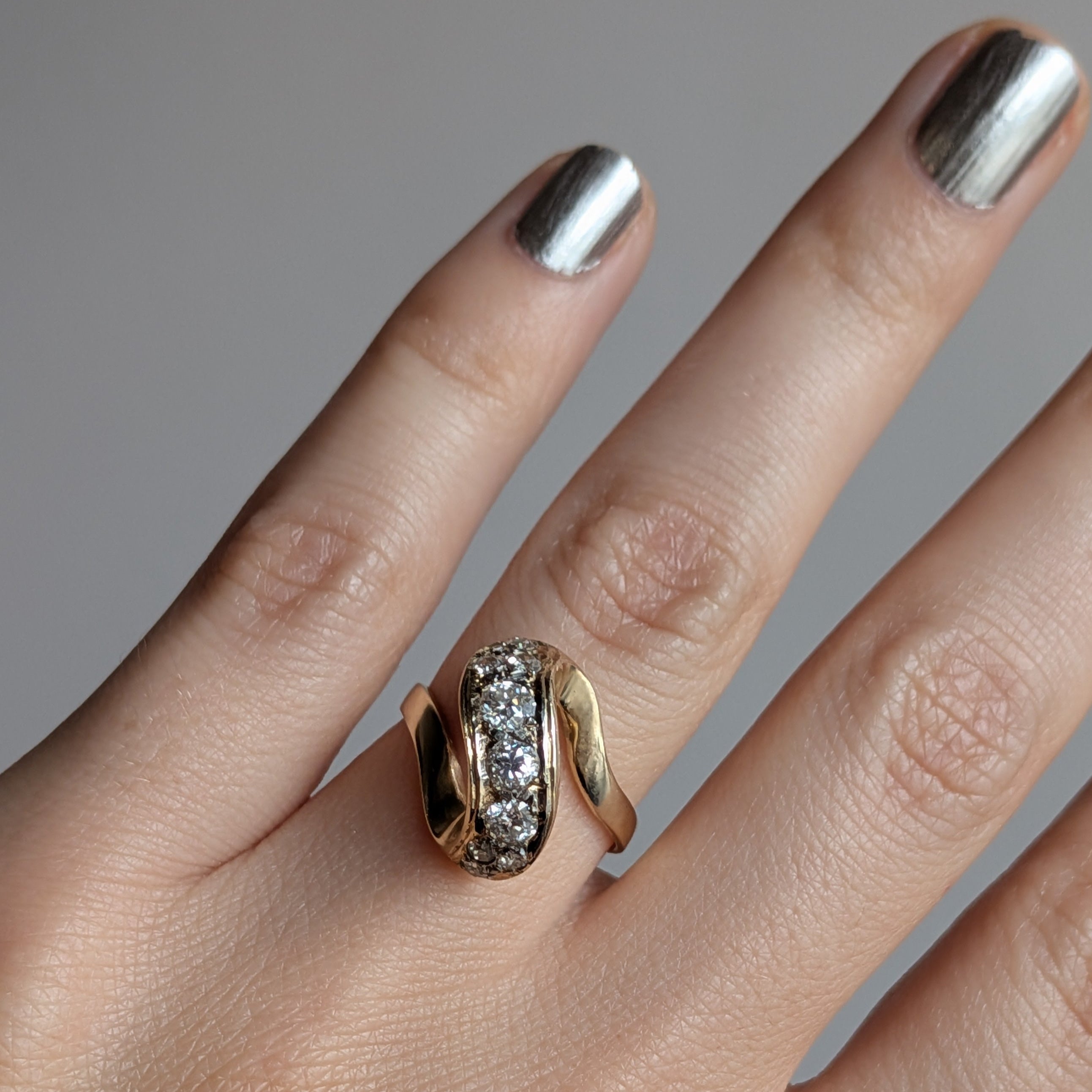Vintage 14K yellow gold wave ring featuring pave-set single-cut and round-cut natural diamonds accenting the undulating gestures of the gold.