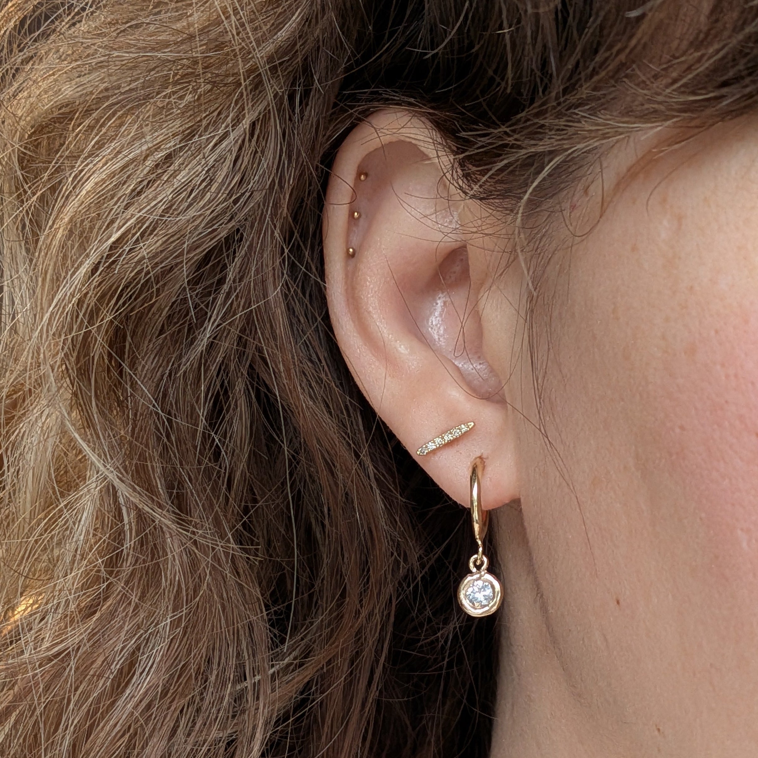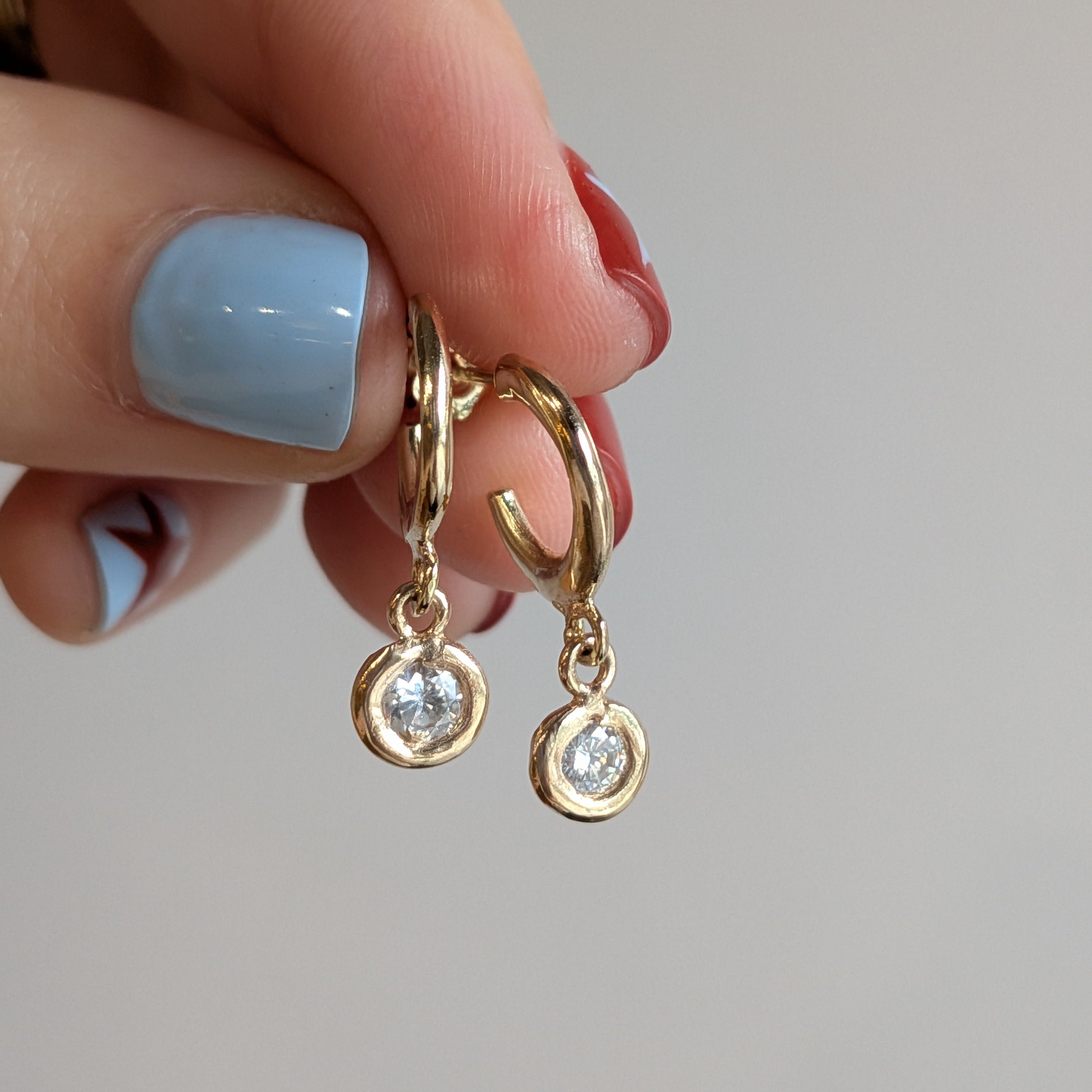 A classic pair of gold hoops bedecked with diamond dangles. The drops are crafted using cast in place technique, which offers an unexpected, organic finish, with the stones appearing to be embedded into the metal.