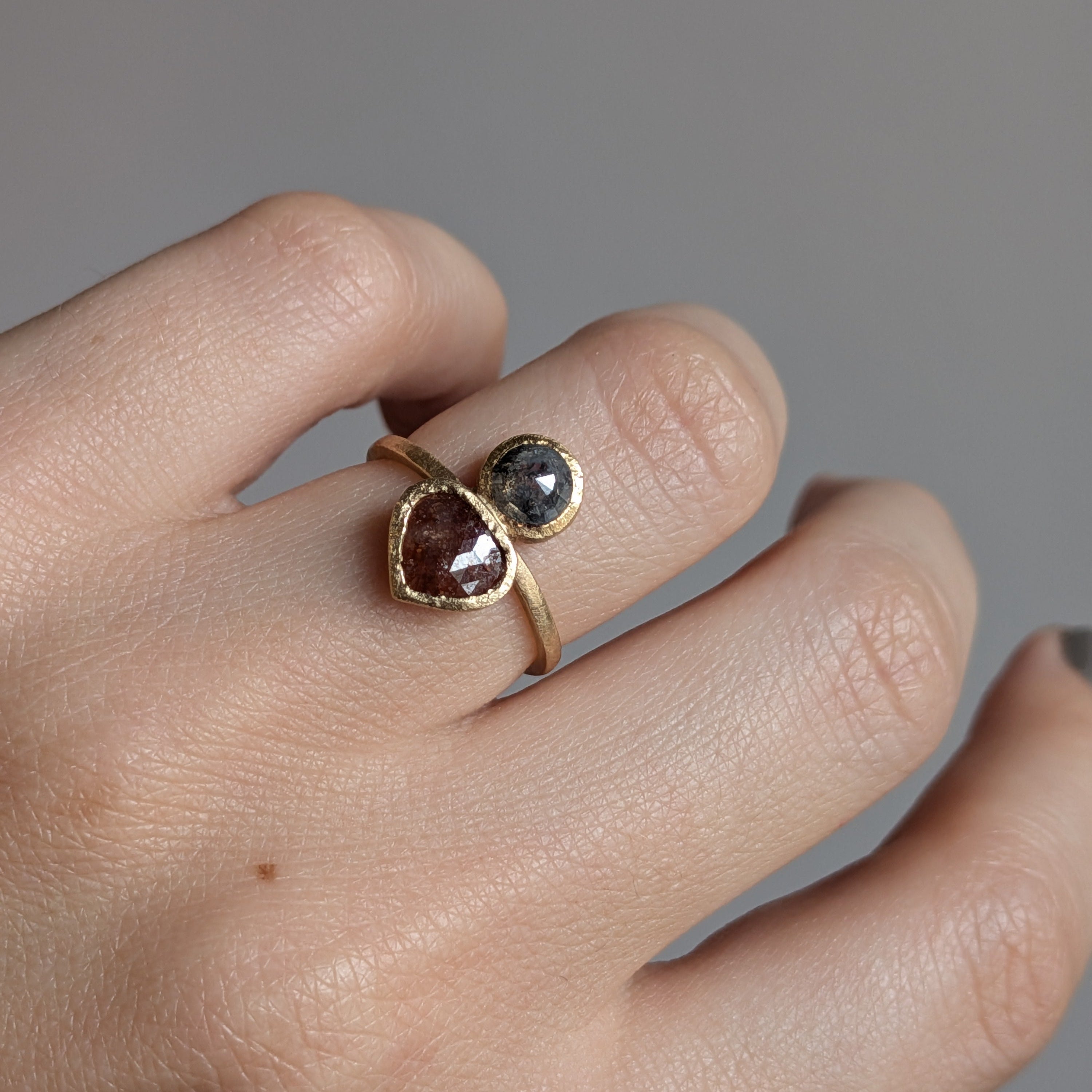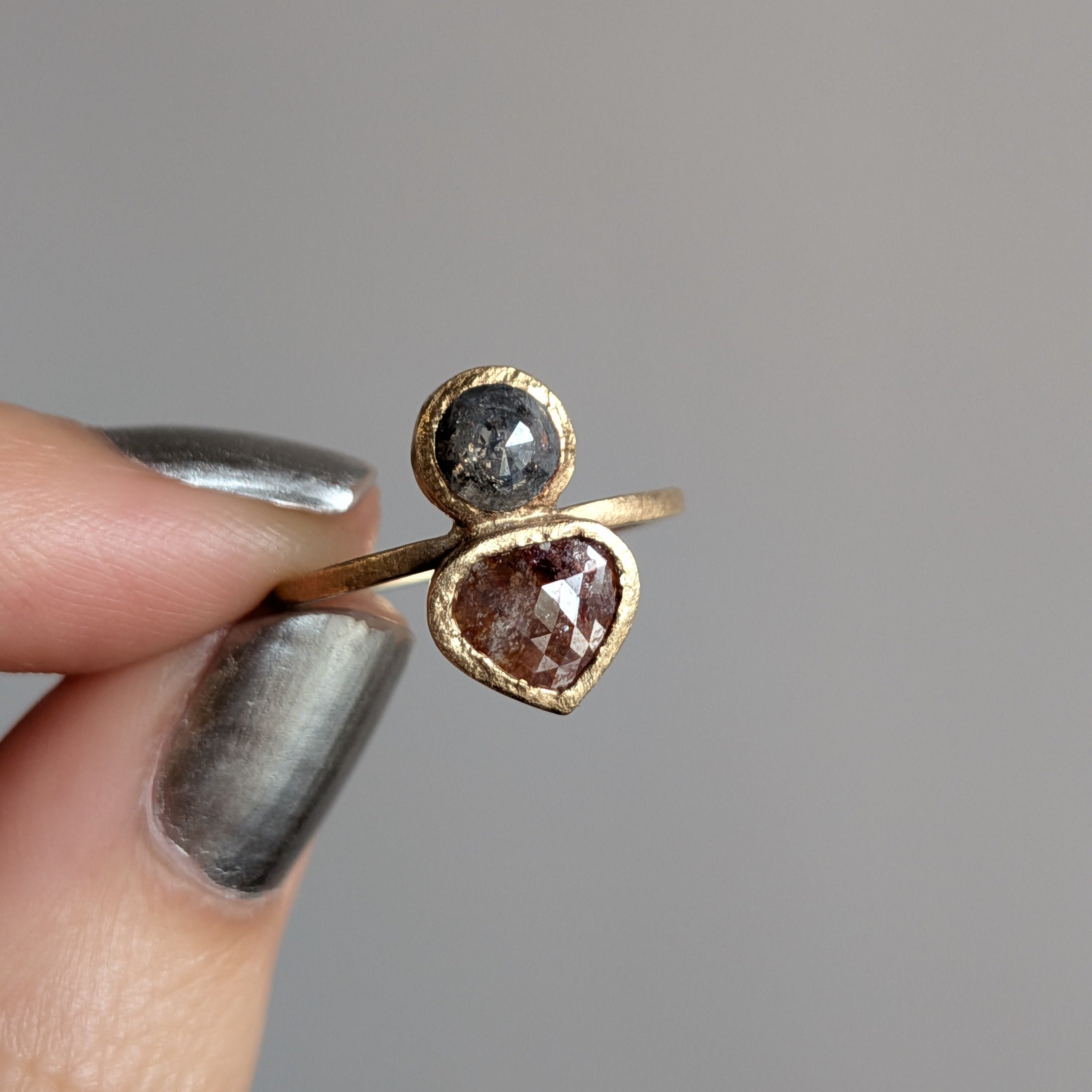 14k yellow gold ring with round gray rosecut diamond and brown pear shaped rosecut diamond. Bezel set in a rustic textured setting.