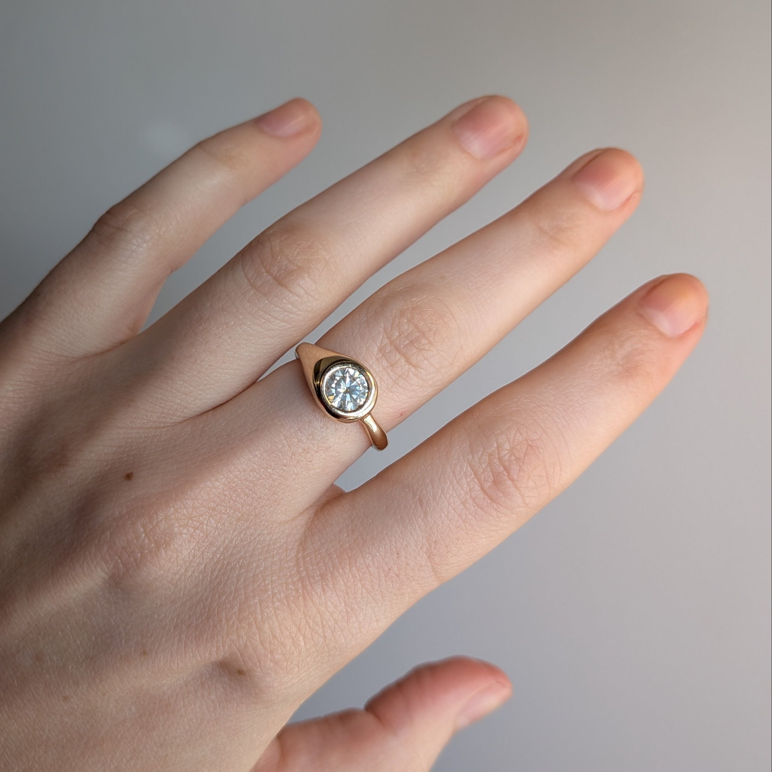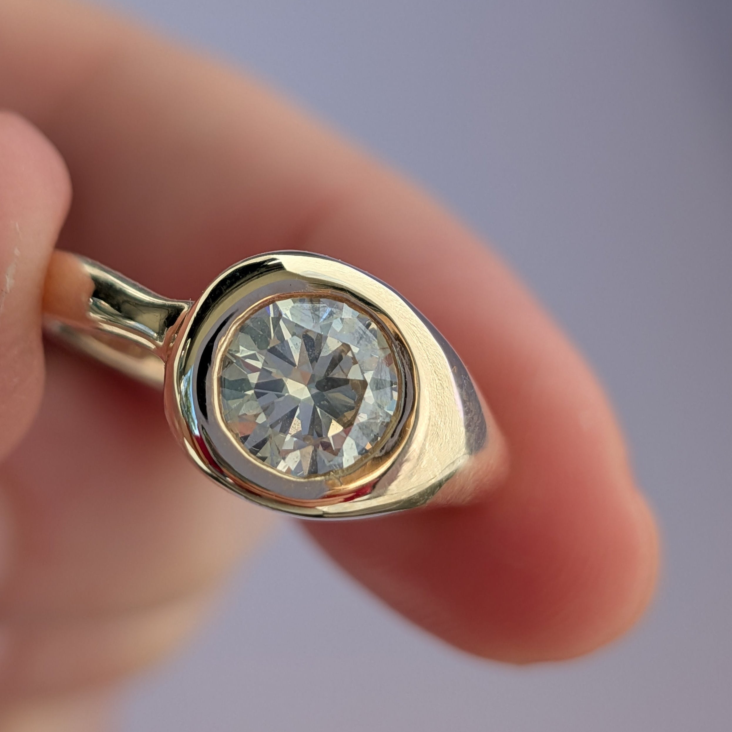 Soft and smooth gold hugs this warmly hued diamond (a recycled S-T color SI2 1.03 ct brilliant cut) in a curvy, asymmetrical setting.