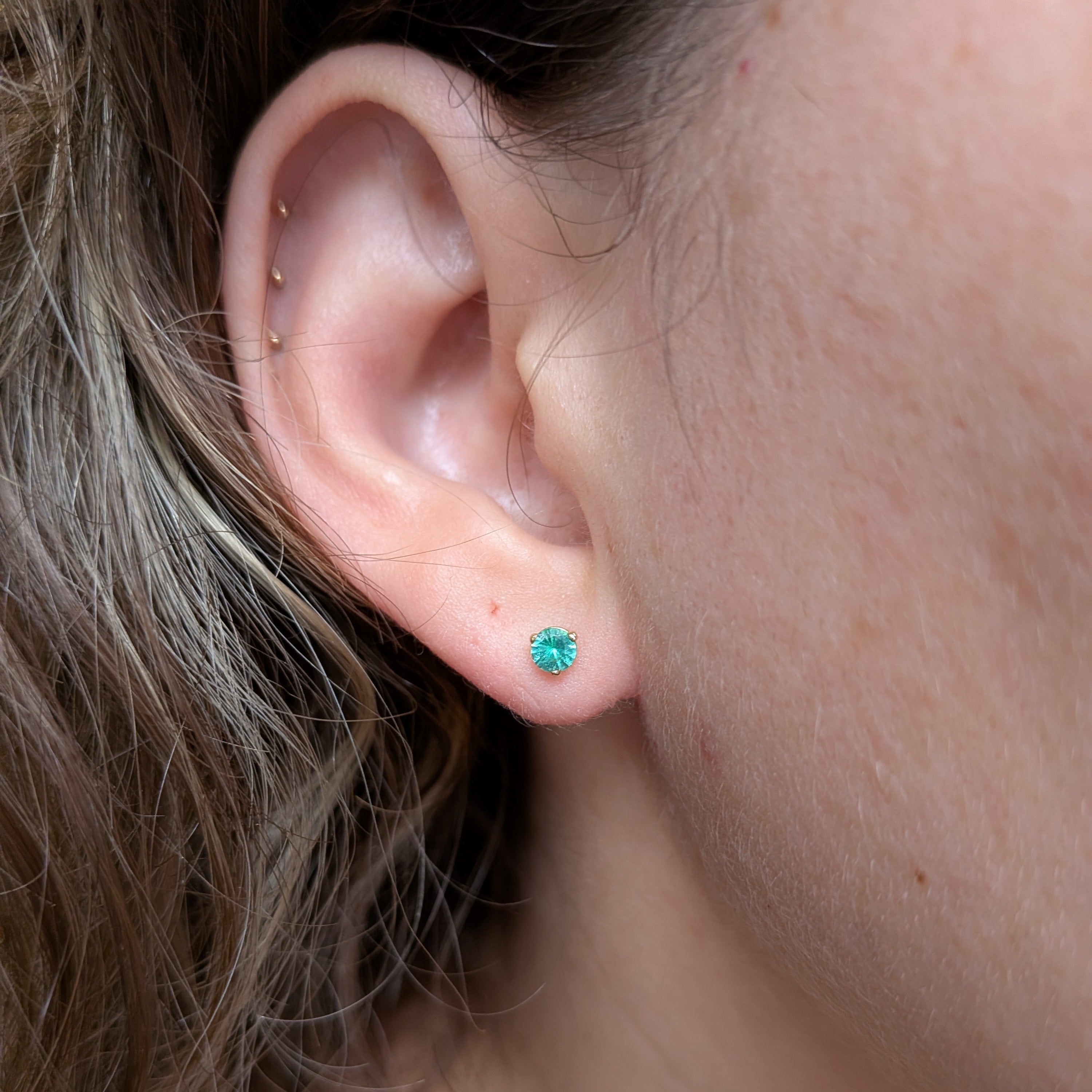 3.5mm brilliant cut emeralds set in 14k yellow gold 3-prong studs.