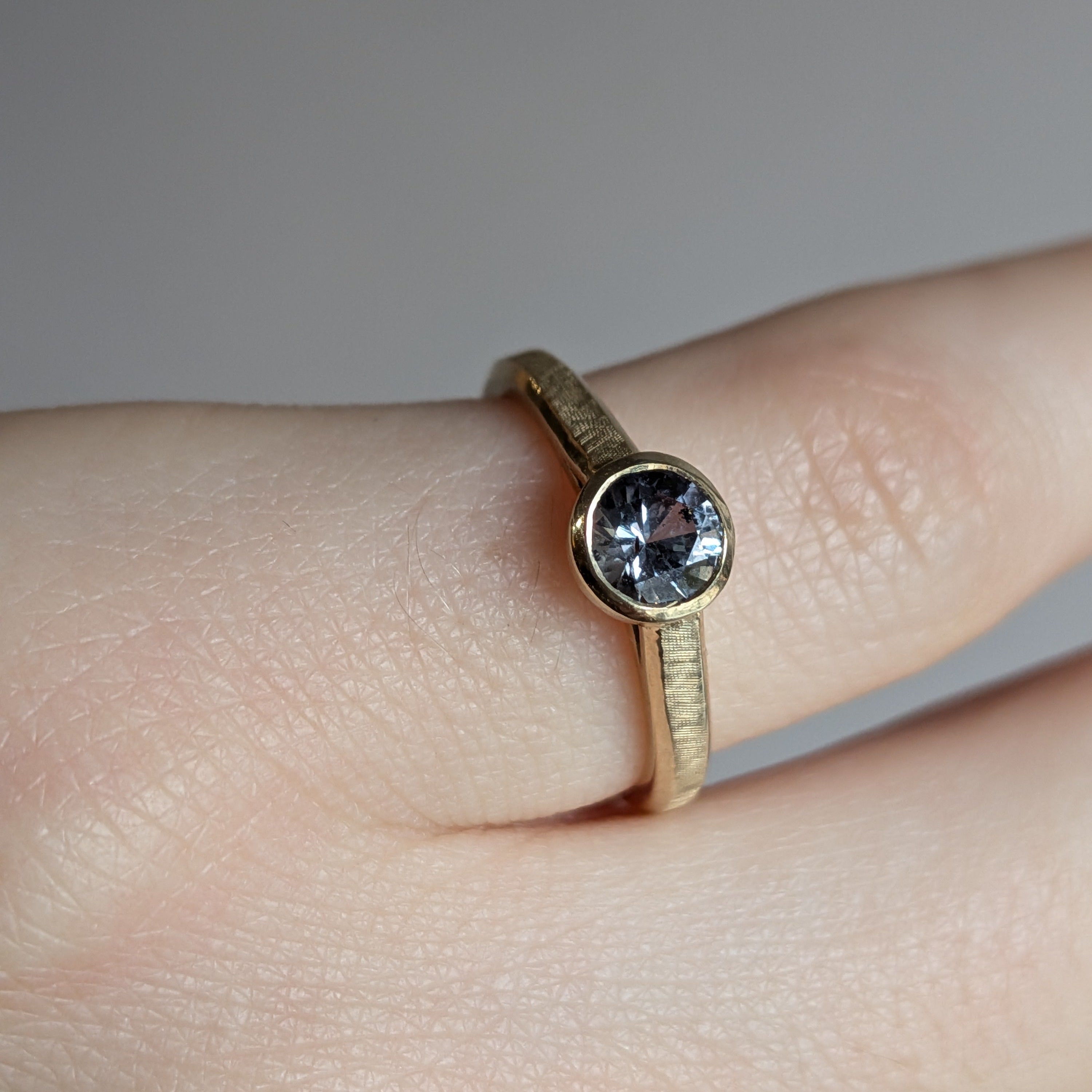 Kima'a Orpheum solitaire with a bezel set 0.59ct Tanzanian sapphire and Florentine finish.