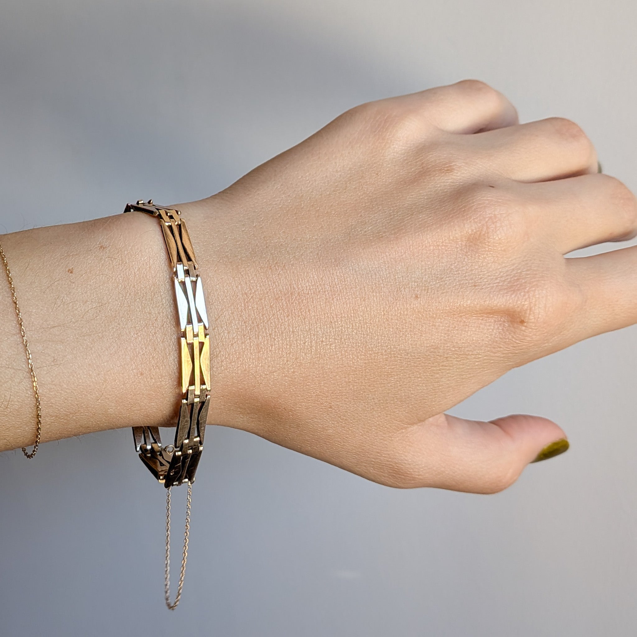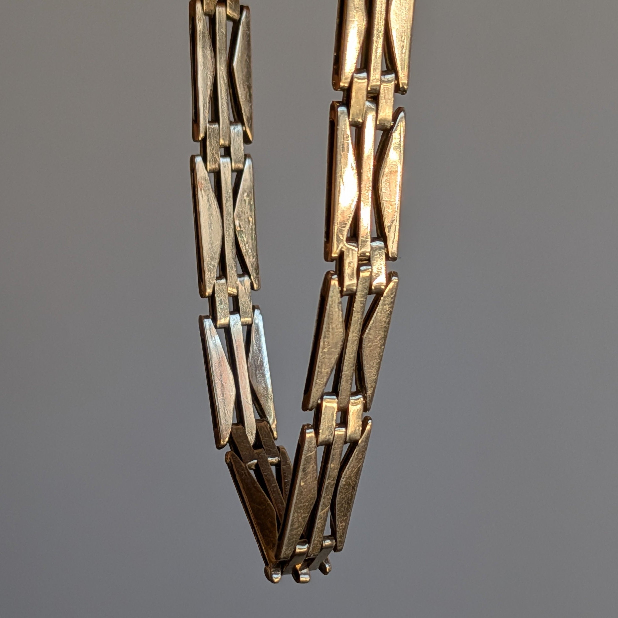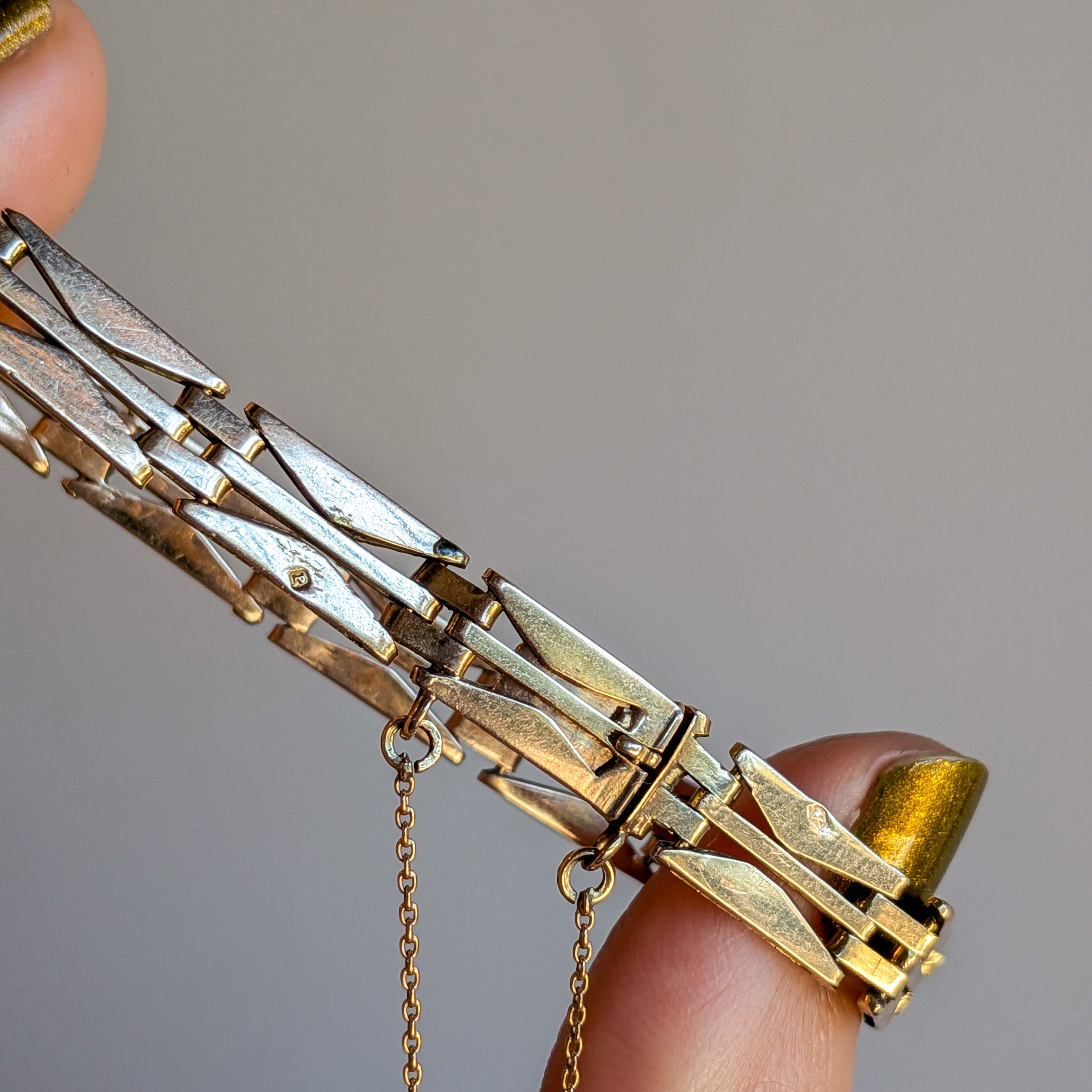 This vintage gate bracelet is composed of interlocking geometric links reminiscent of Deco and Mid Century motifs.