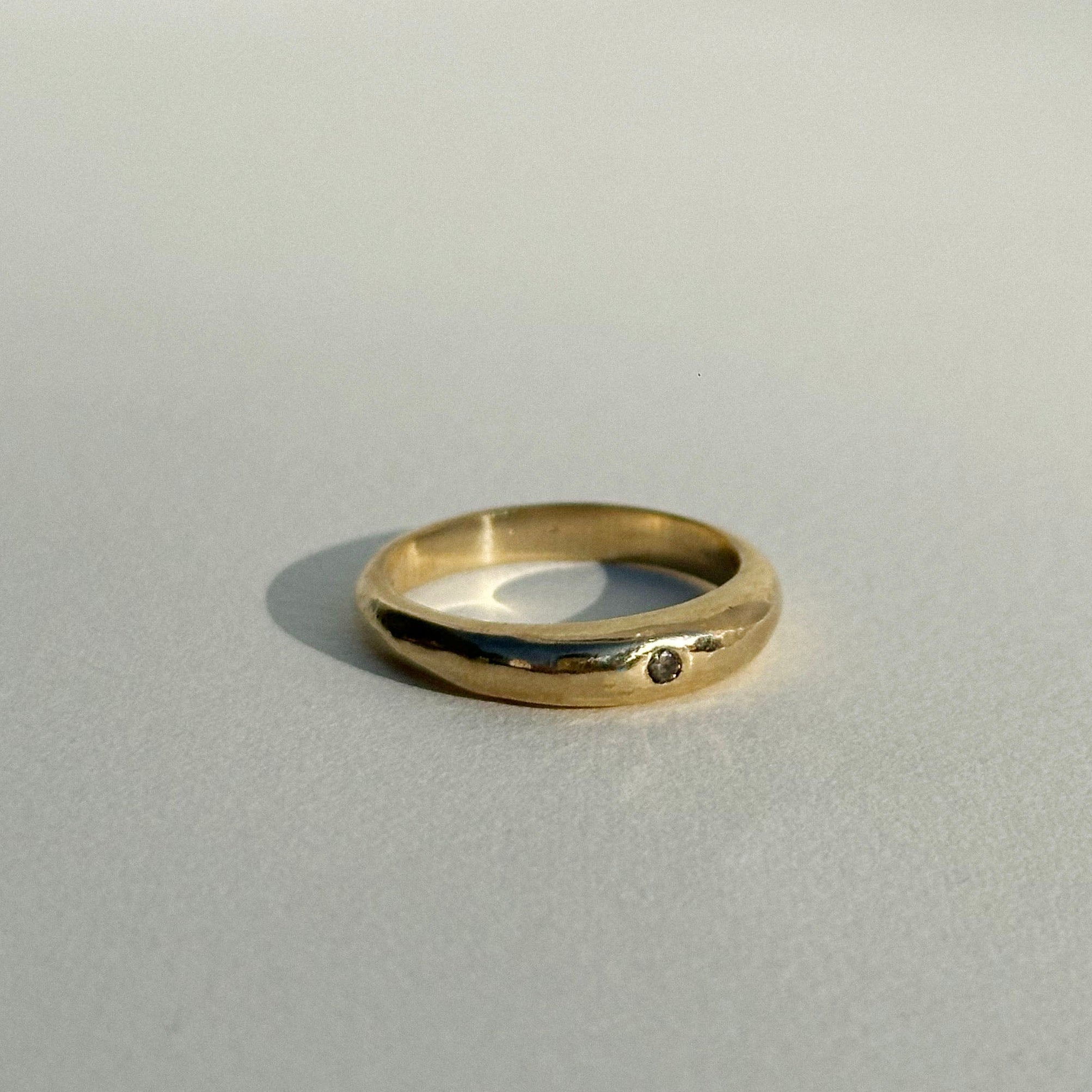 A soft domed ring featuring a 2mm flush set champagne diamond. Handcrafted from solid 14k yellow gold with a shiny polished finish. Great worn alone or stacked with other rings.