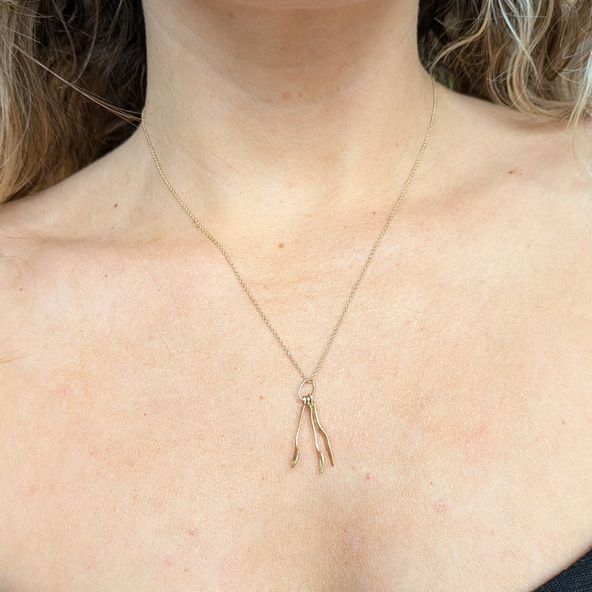 Tiny utensils for your on the go snacking needs. A 14k yellow gold decorated fork, spoon, and knife set hangs as one jangly cluster on a shared jump ring.