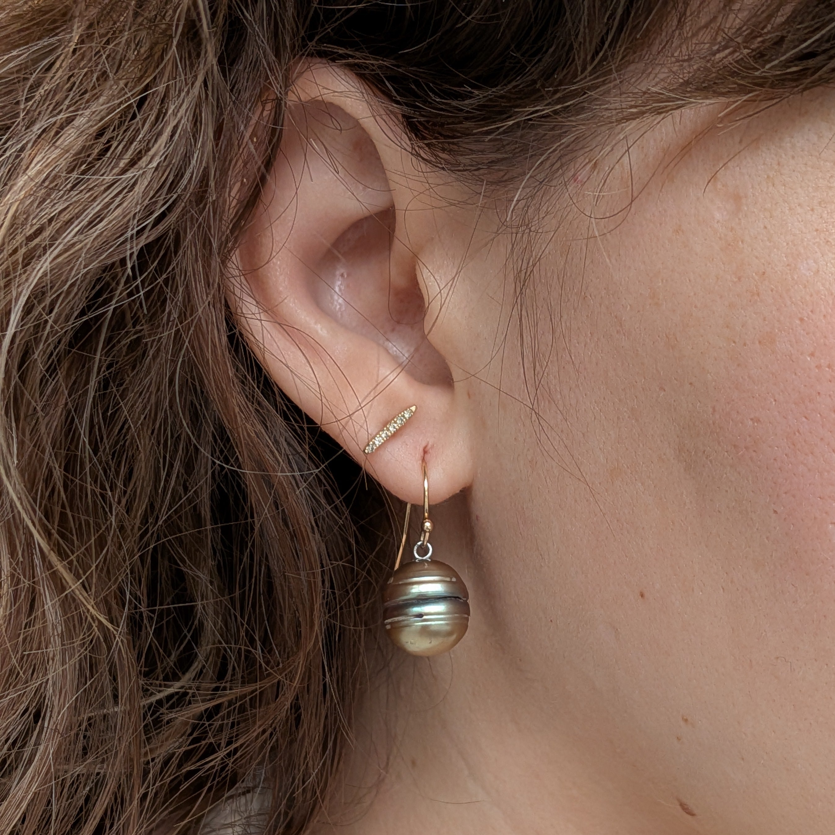 Beautiful organic shaped green pearls on a 14k drop ear wire.