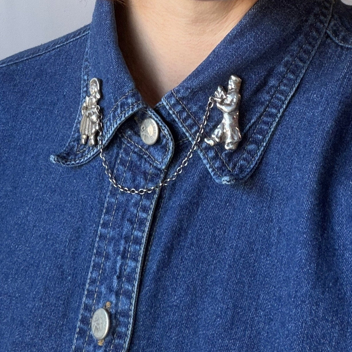 Equal parts adorable and spooky. These clips can attach to your collar tips for a drapey addition to a button-down, or they can secure a scarf, cardigan. We think they'd be fun to style on an oversized T-shirt as well, the possibilities are endless with these two little weirdos.