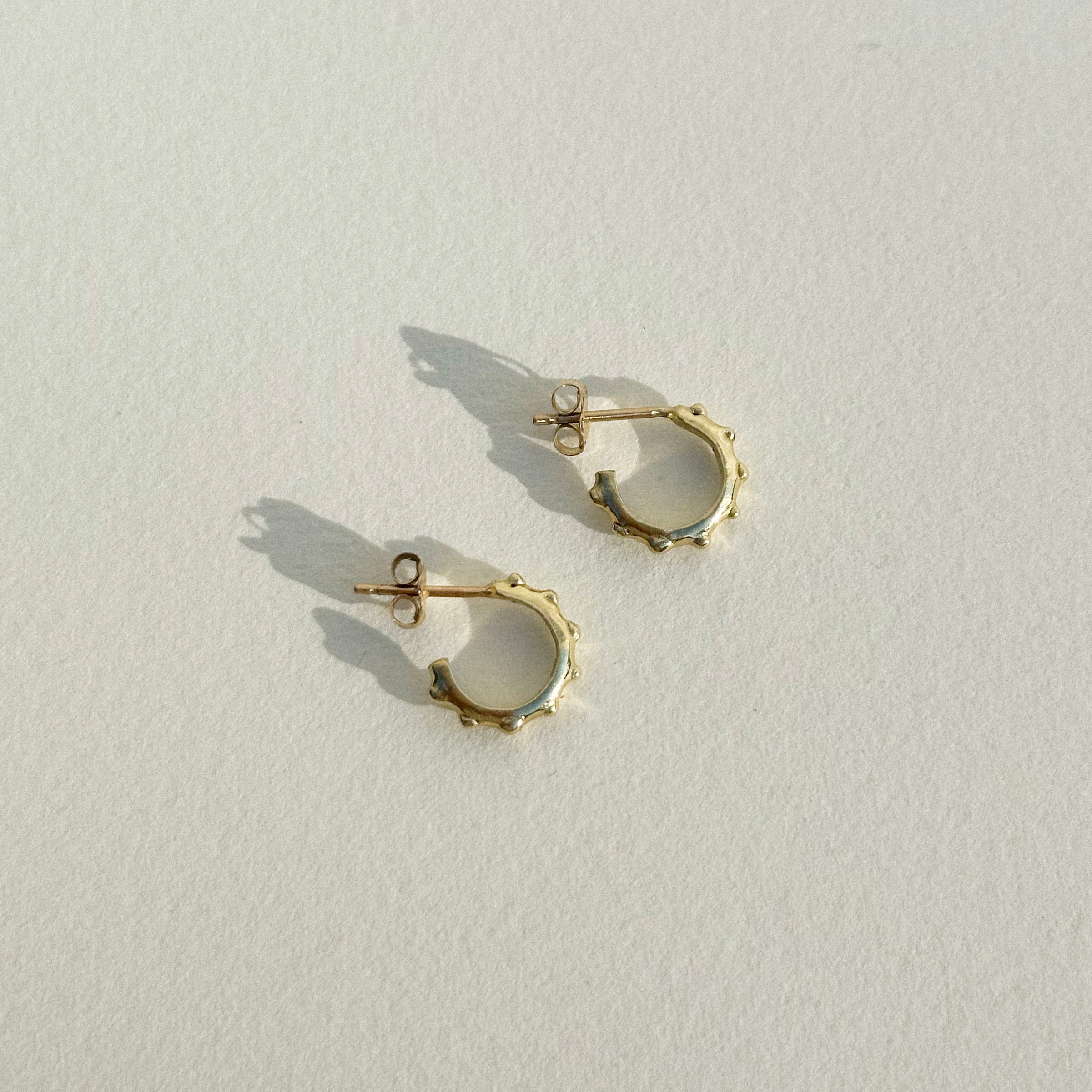 An everyday essential crafted in 14k yellow gold, these textural studded earrings embody a mood- their tactile surface gives an interesting edge. Designed to hug the ear with effortless comfort.