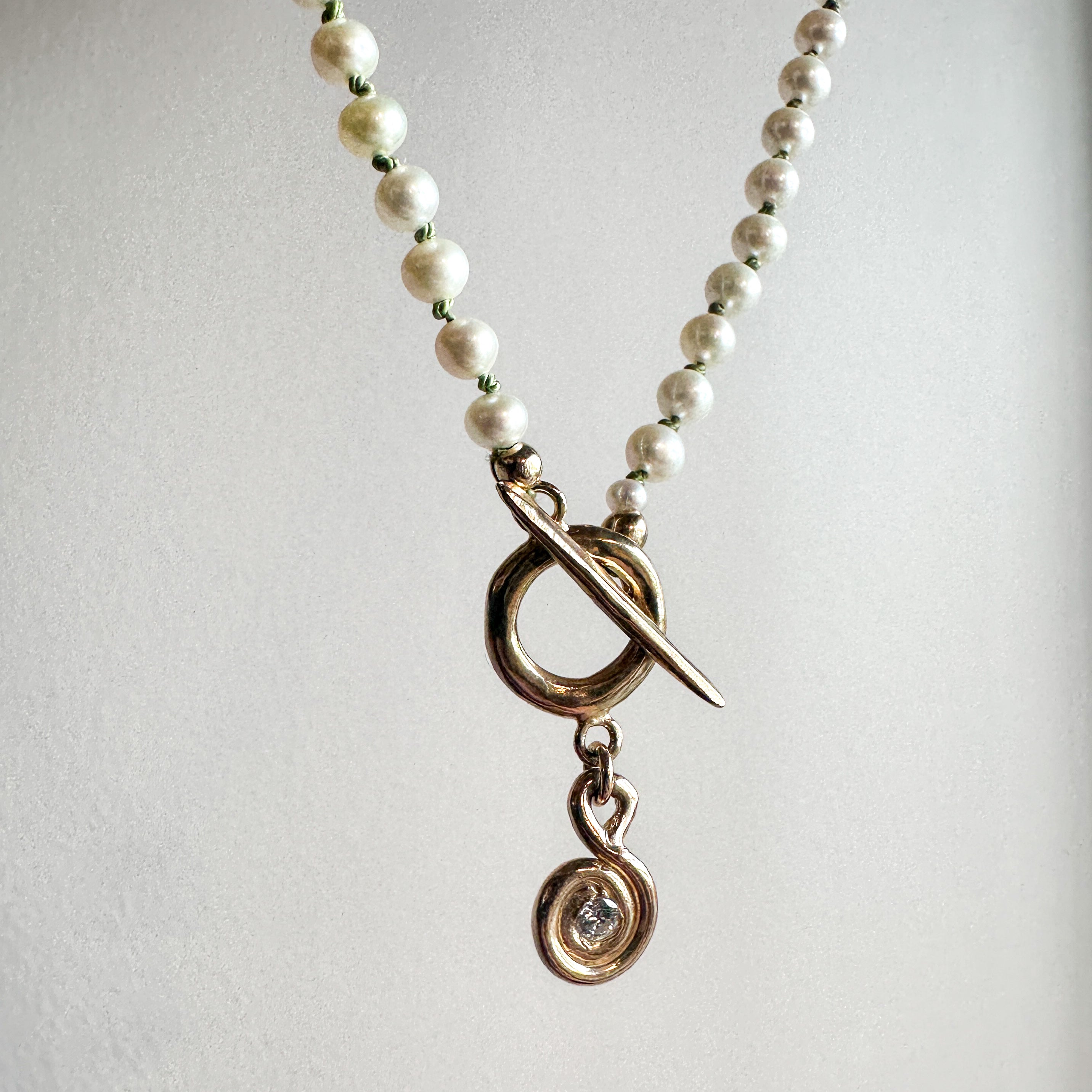 Knotted Pearl Toggle Necklace with Diamond Spiral Charm