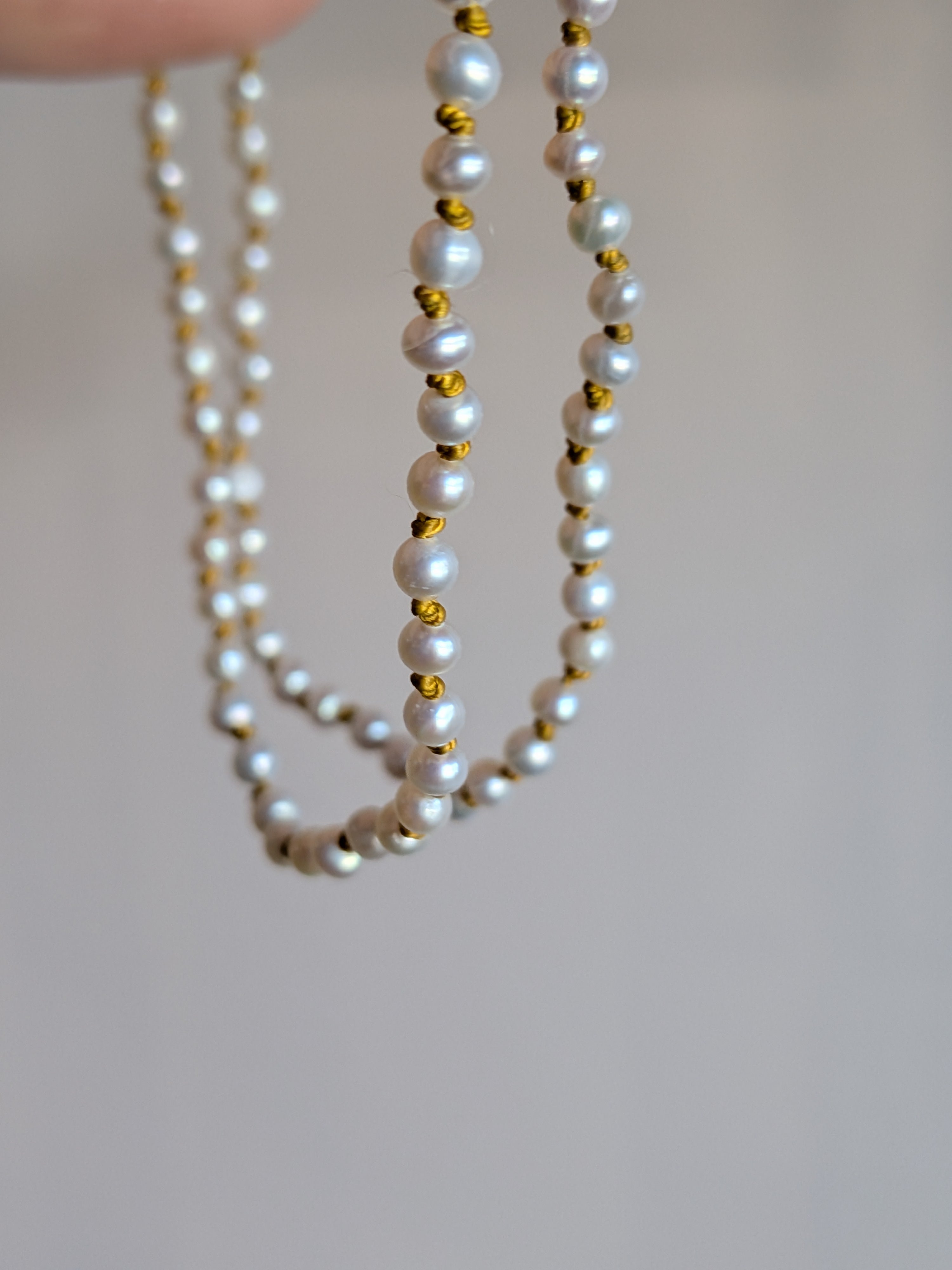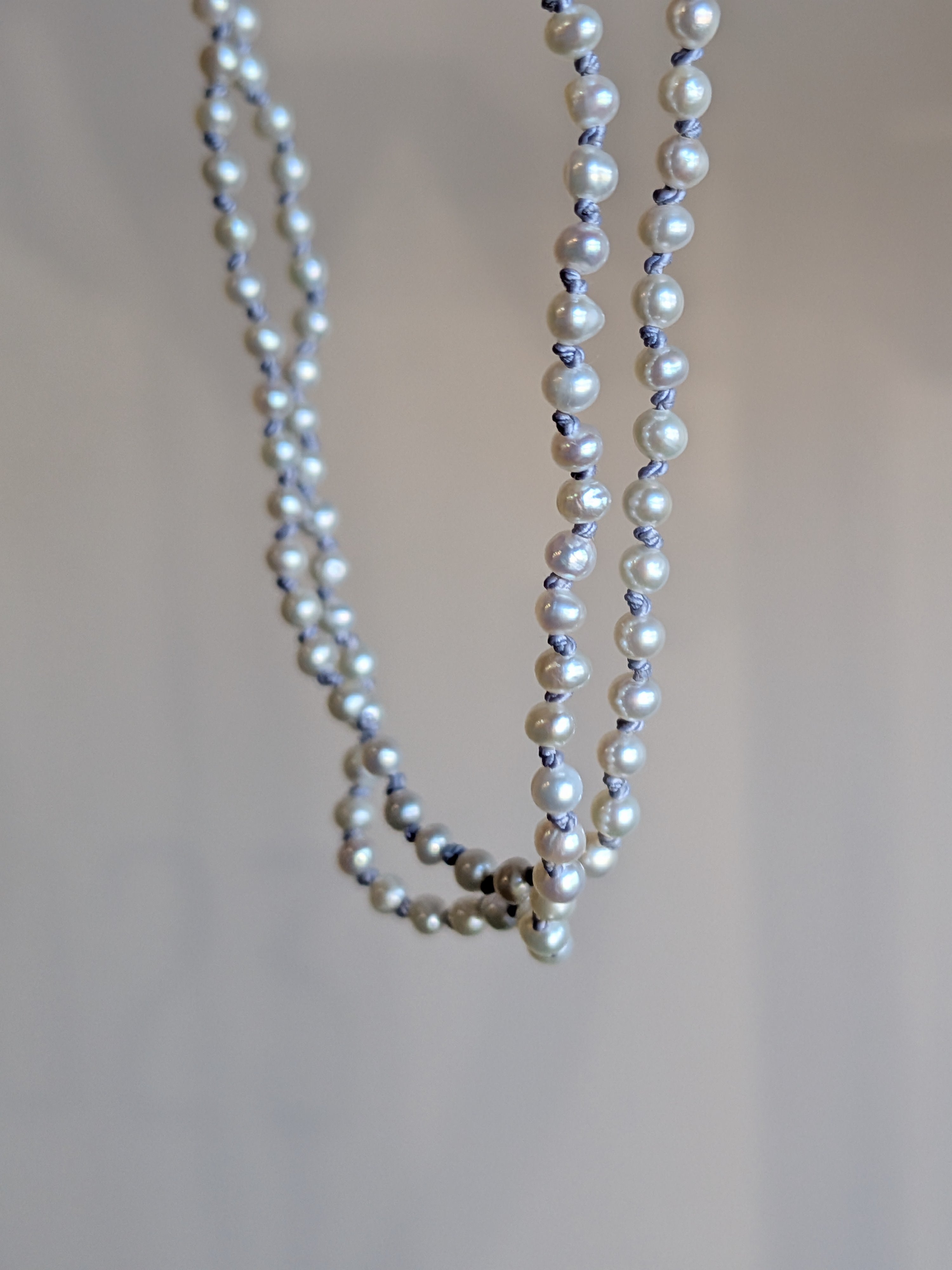 A hand knotted pearl necklace boldly updated with brightly colored silk thread. Includes one lapis and one carnelian bead on either side of gold lobster clasp.
