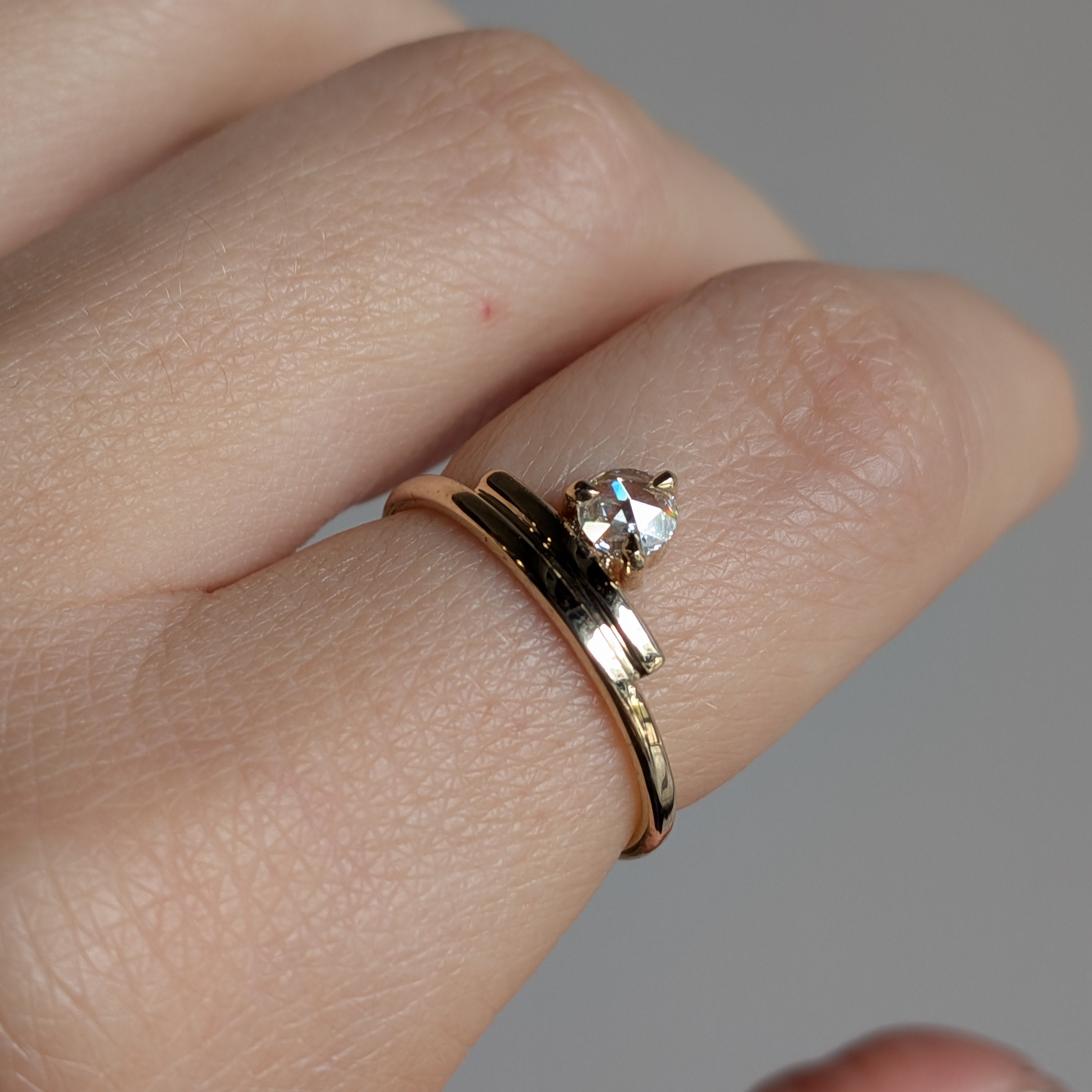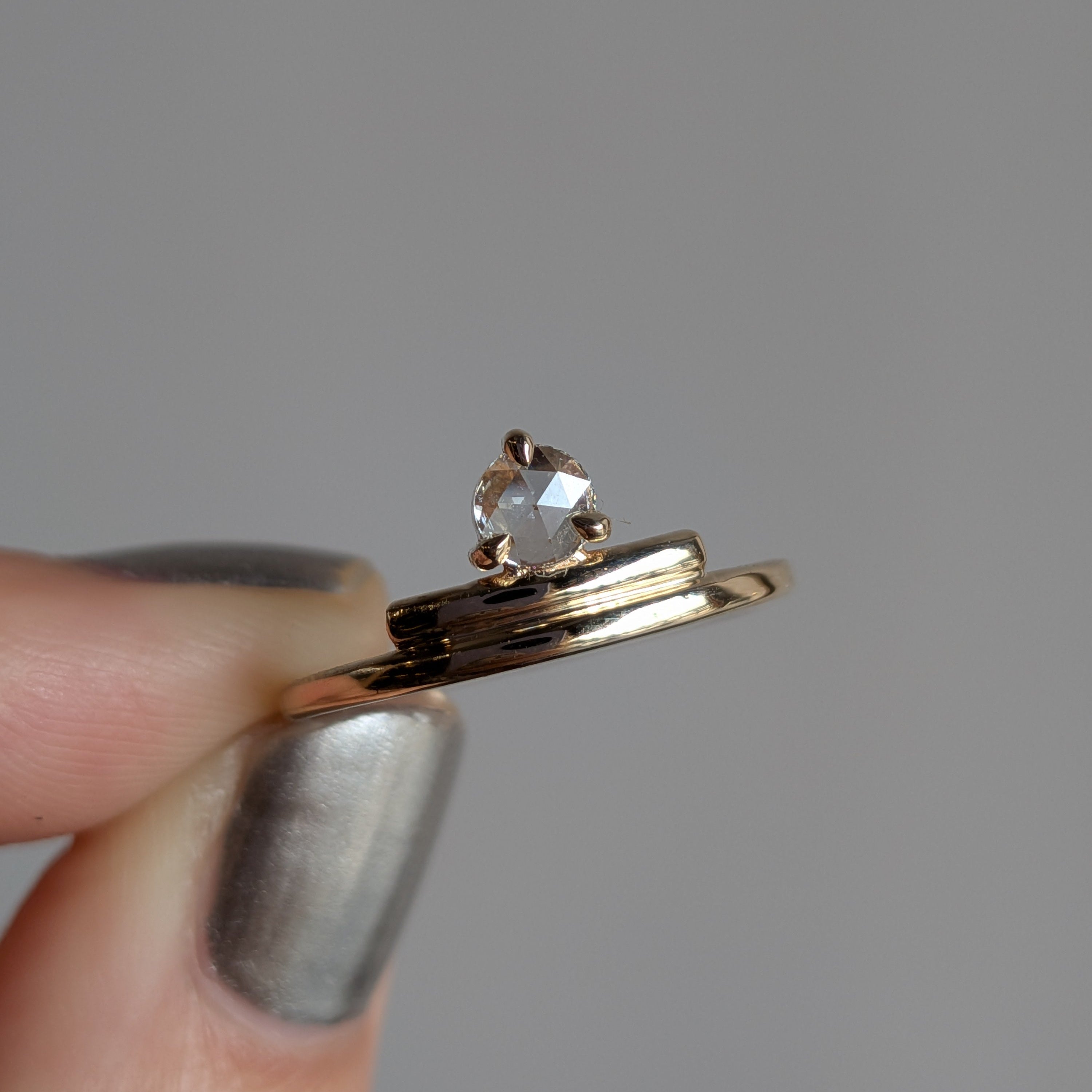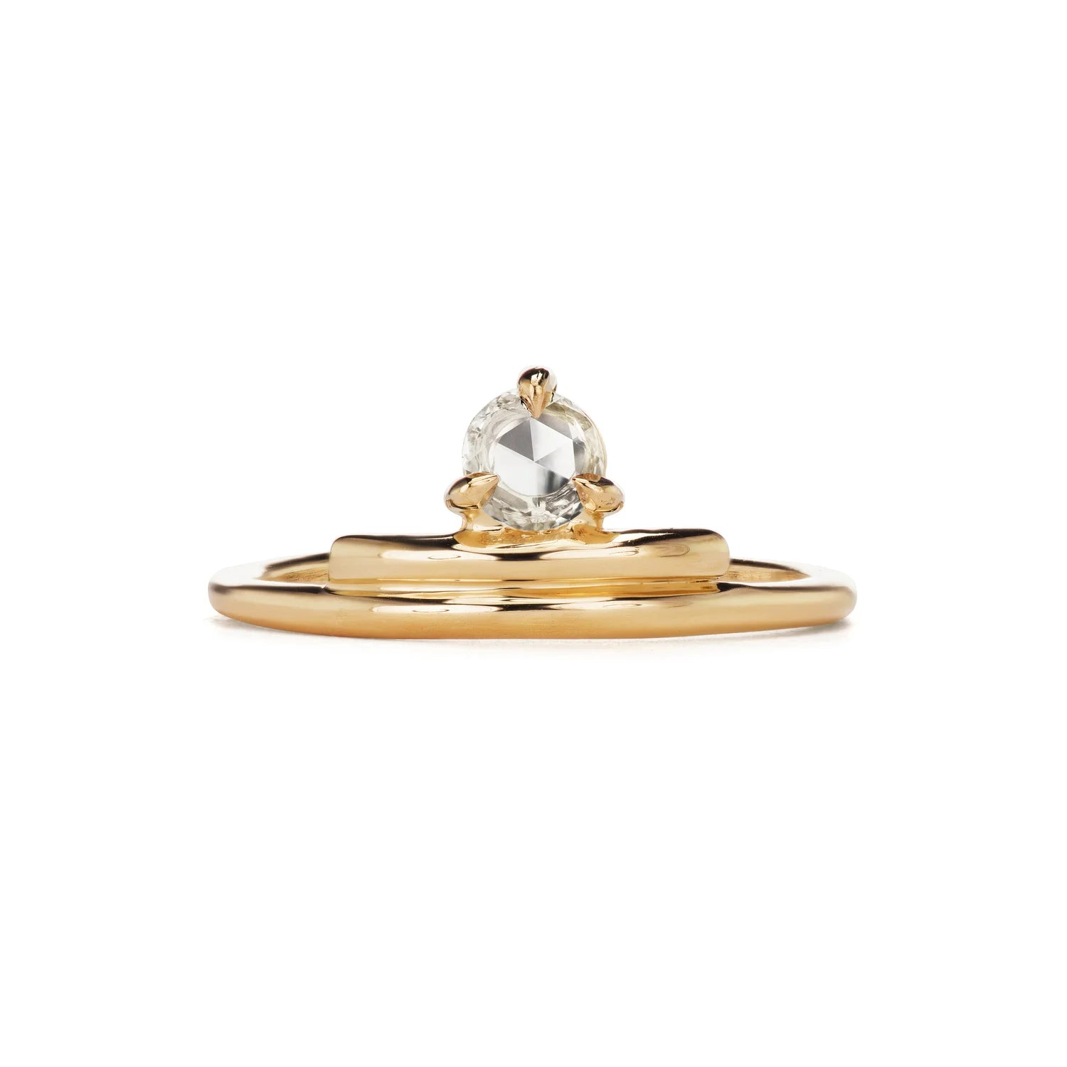 With a soft, sparkling white rose cut diamond, this solitaire sits flush with the finger for a truly easy and effortless wear.