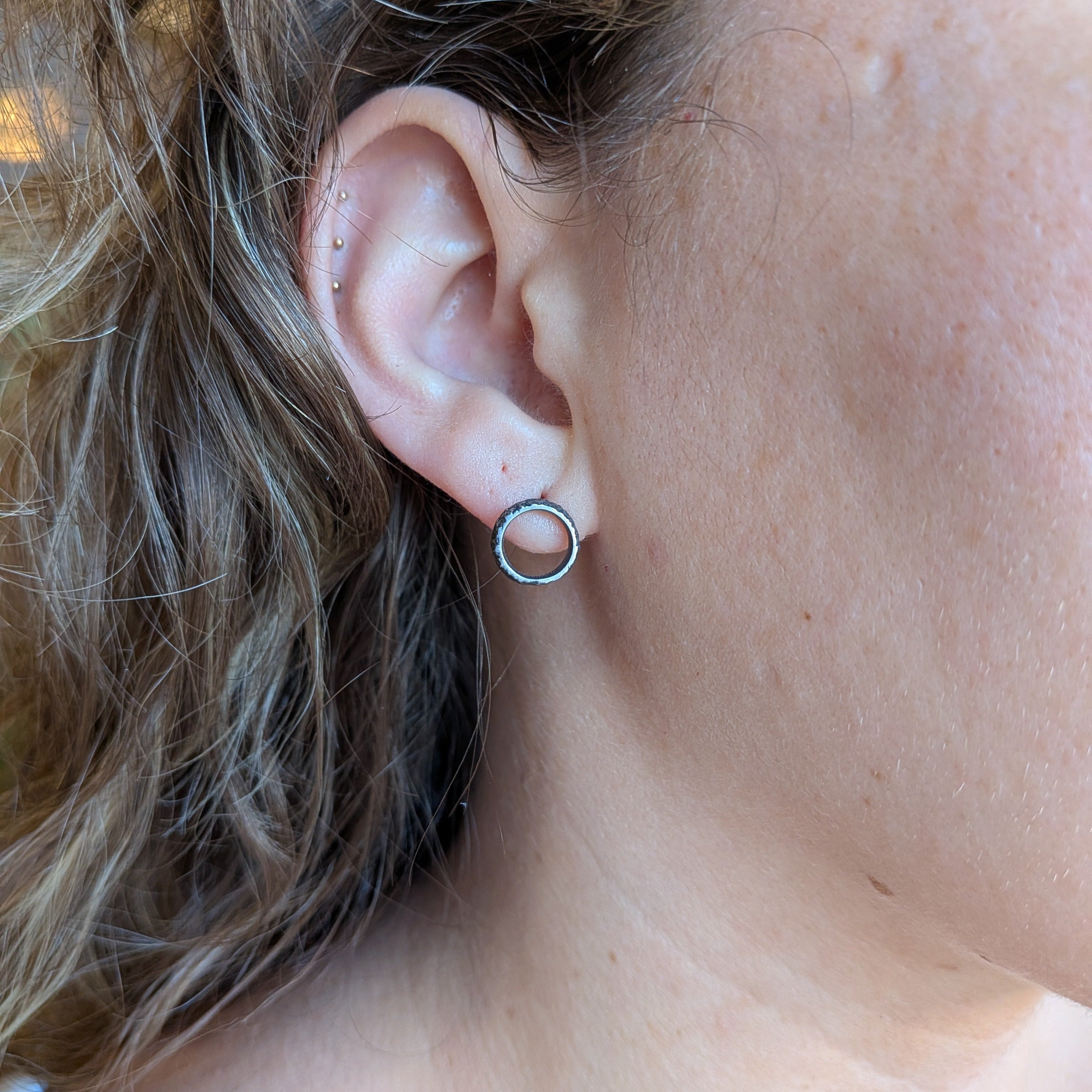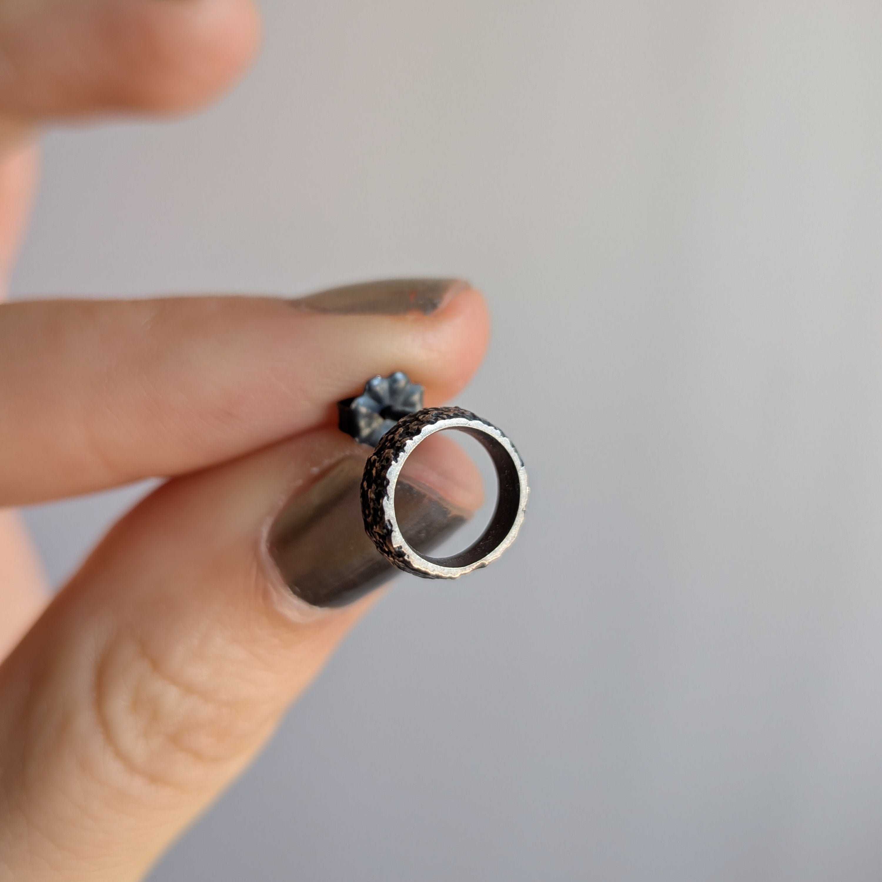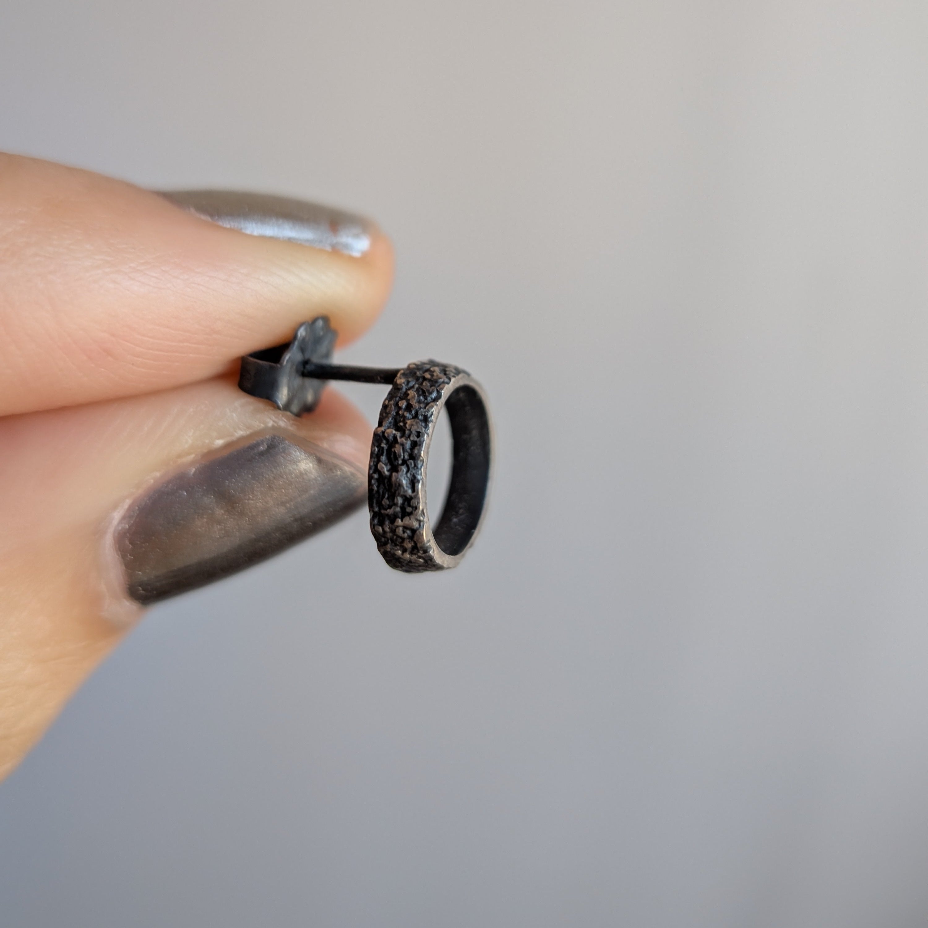 These oxidized silver earrings are cast with the texture of Northern California beach sand and formed into open circles. The recesses in this texture are matte, while the raised parts are shiny, giving you a subtle sparkle.