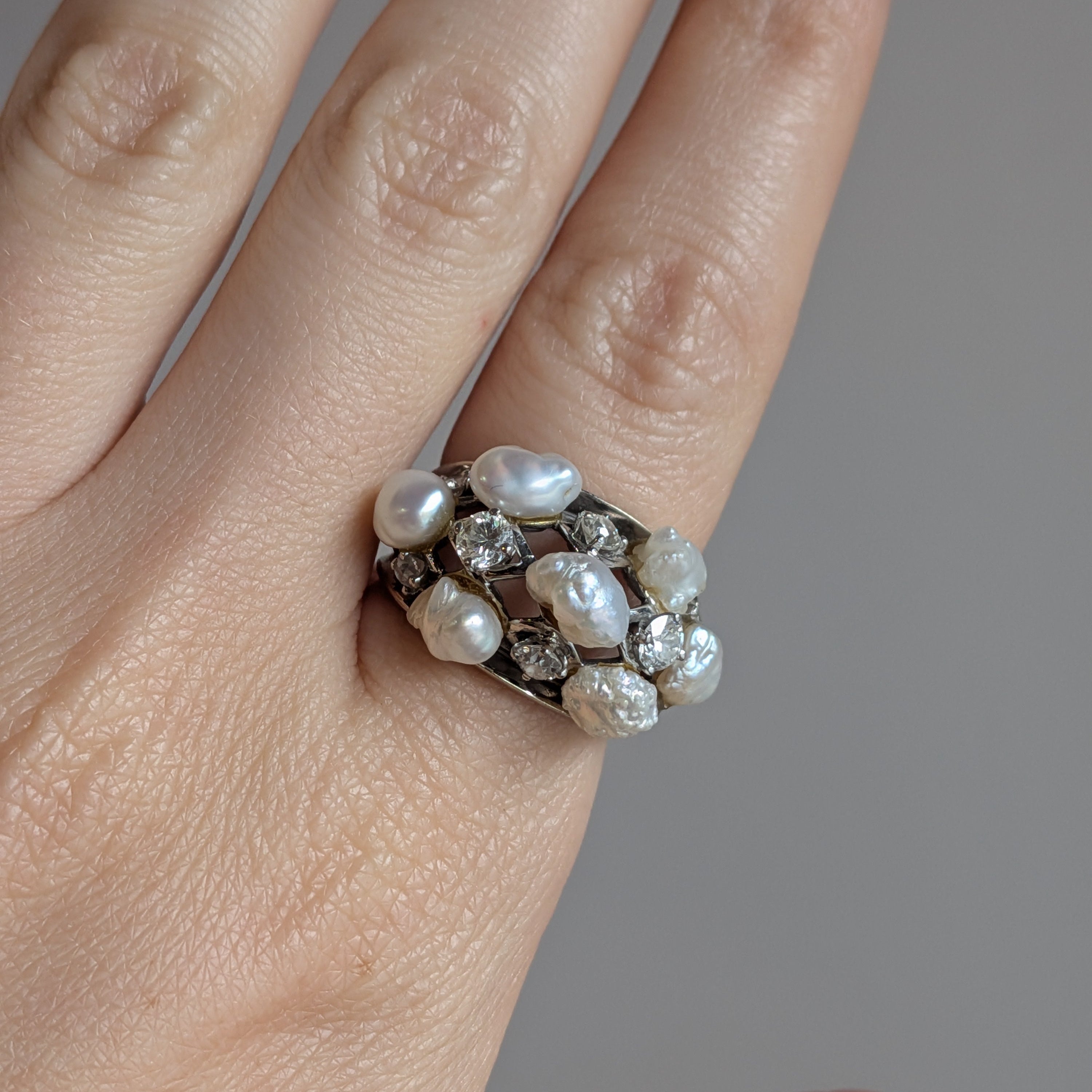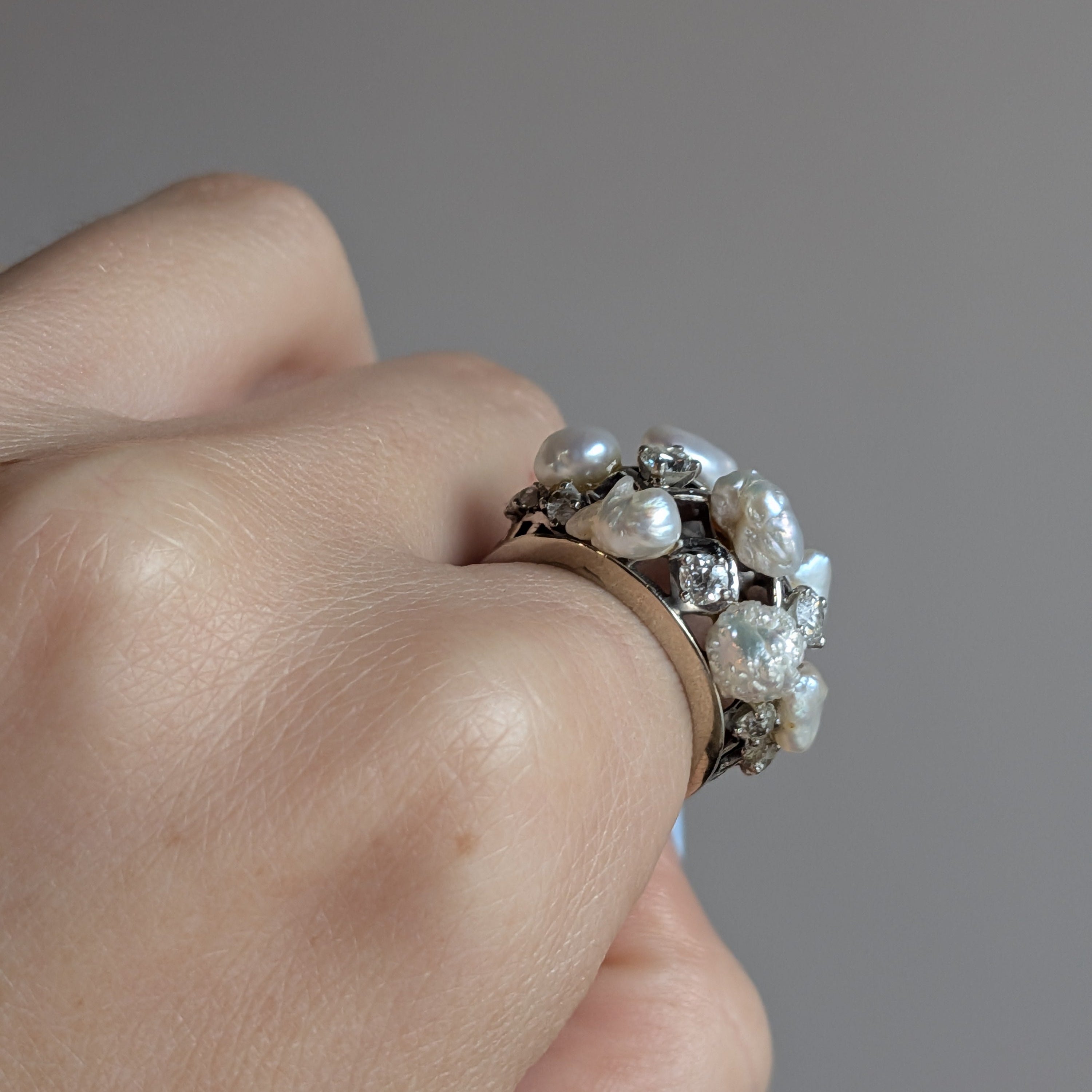 White gold mermaid ring featuring 7 baroque river pearls and 10 old euro diamonds and brilliant cuts