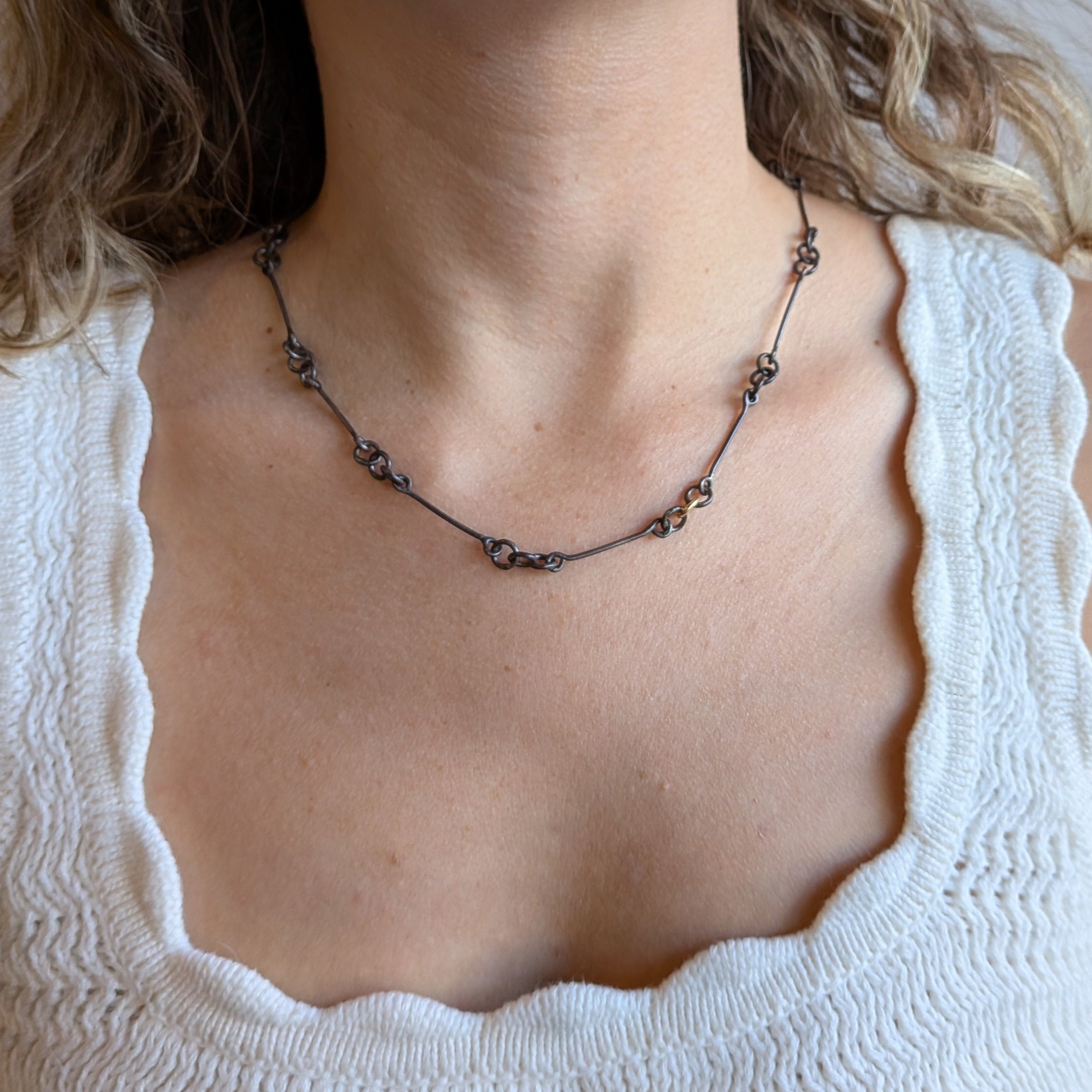 Oxidized silver handmade bar link chain with one 14k yellow gold link and hook clasp.