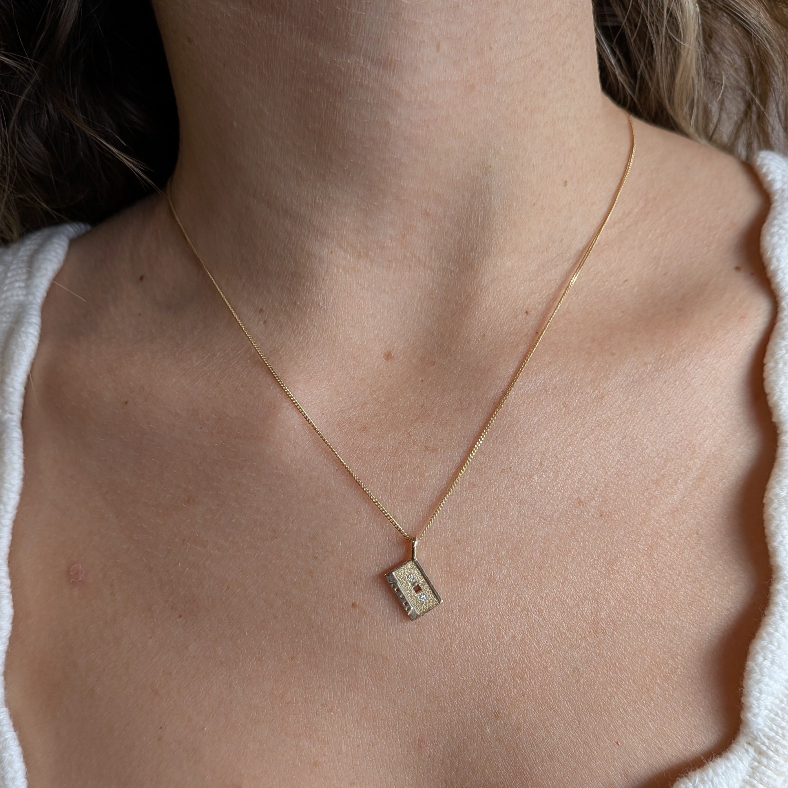 A tiny bit of musical nostalgia to adorn you, or a perfect gift for anyone with music as their love language - this cassette tape in solid 14k gold features two flush set diamonds and holographic stippling on an 18" gold chain.