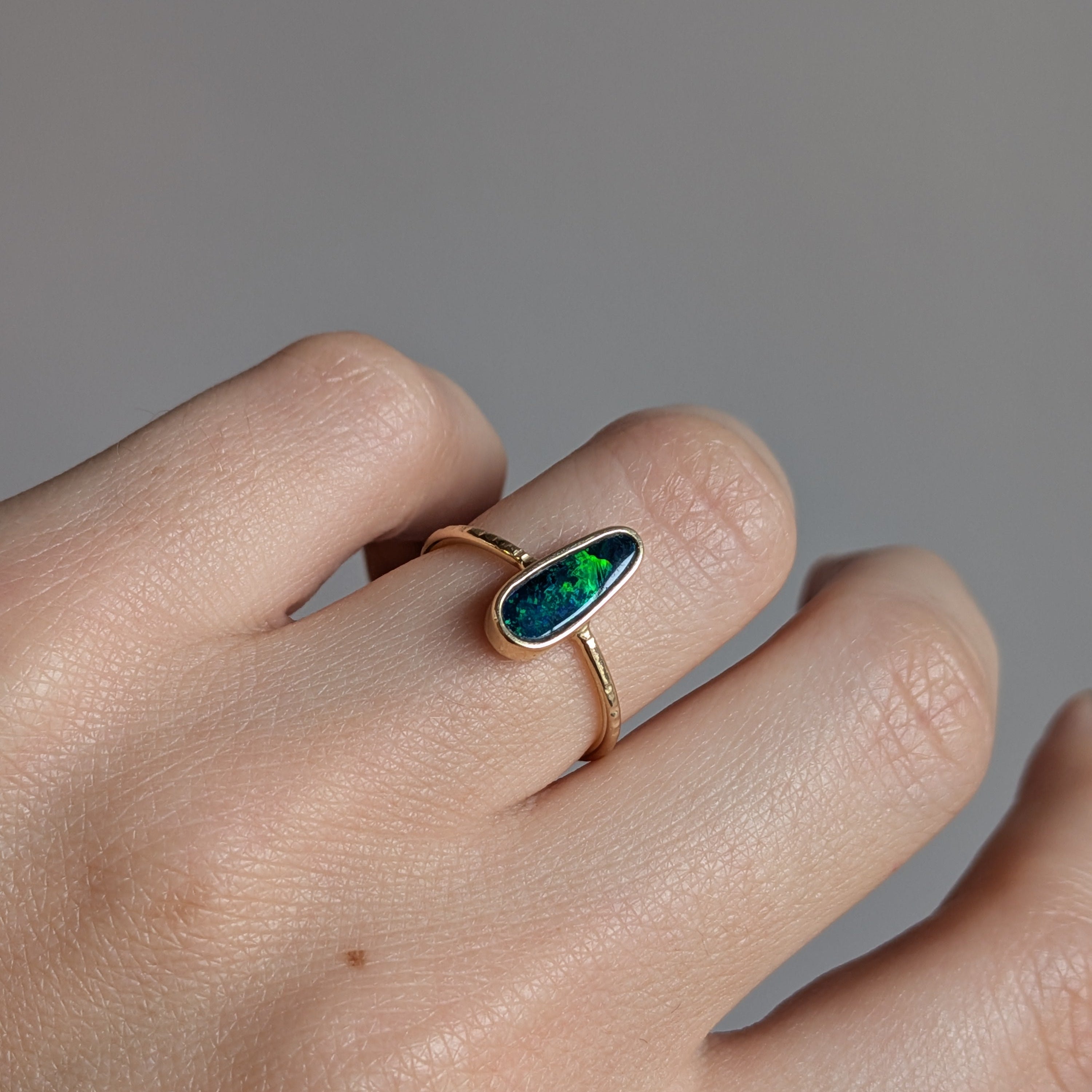 14k yellow gold opal ring. Bezel set with hammered finish on either side of the center stone.