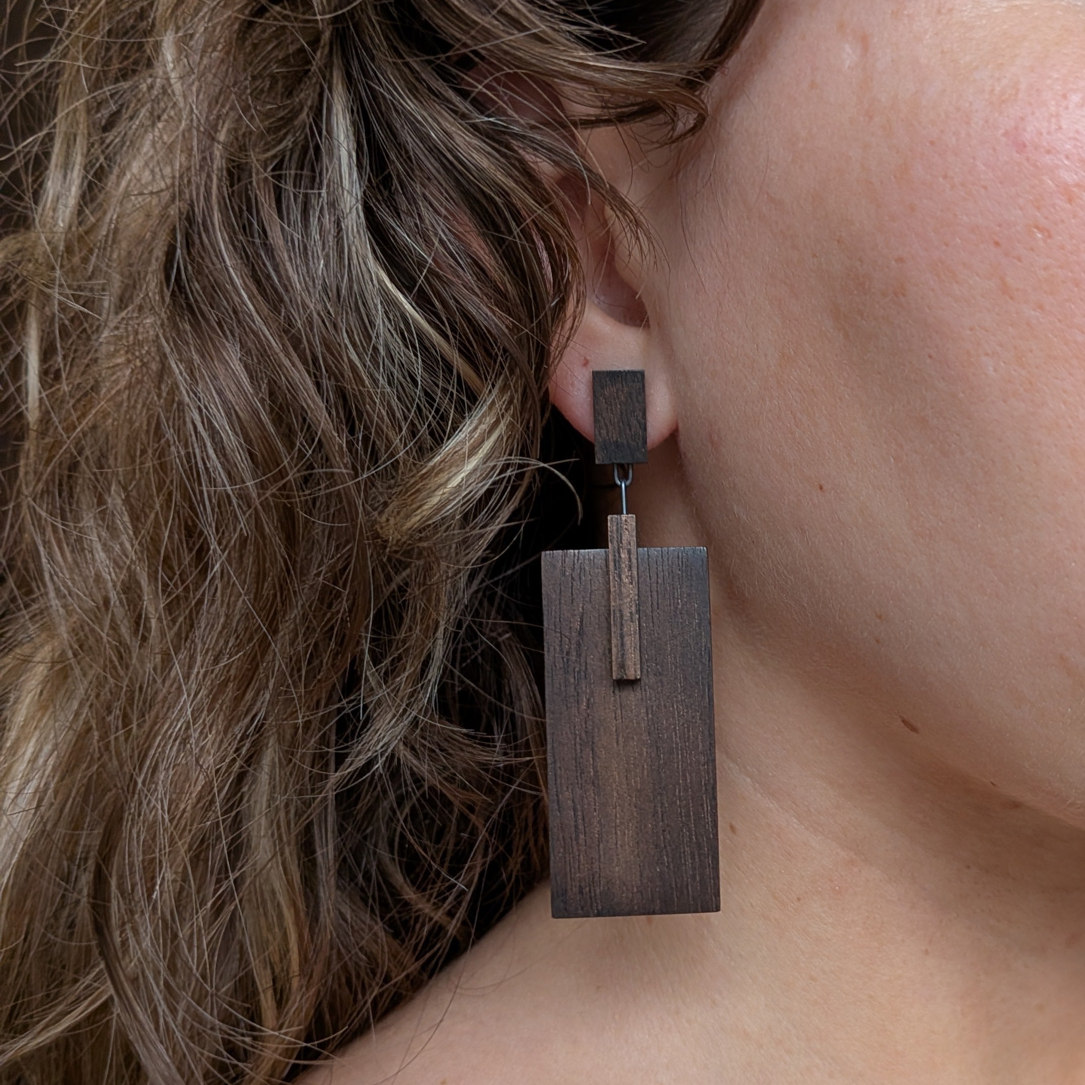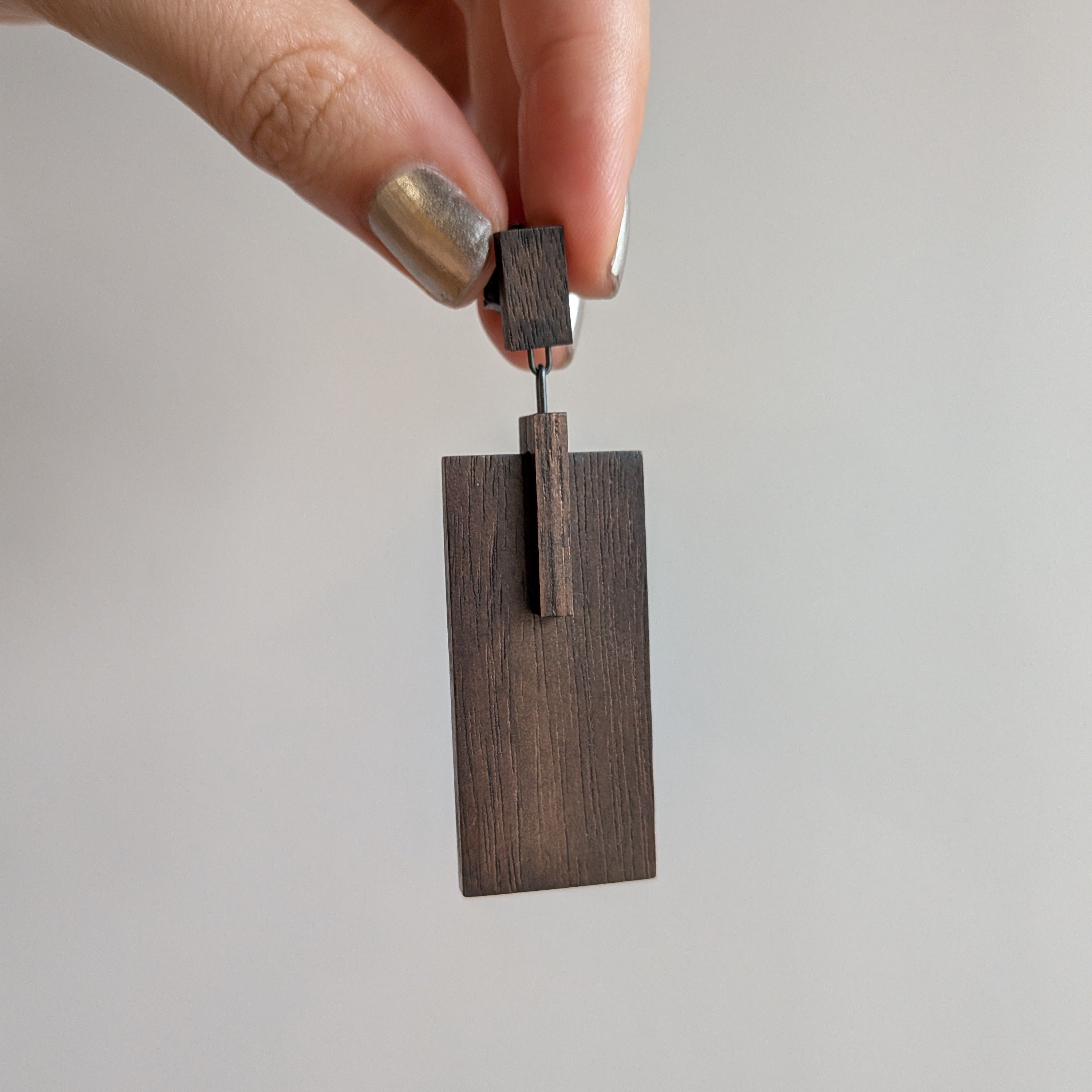 Long rectangular wooden earrings: walnut, oxidized sterling silver.