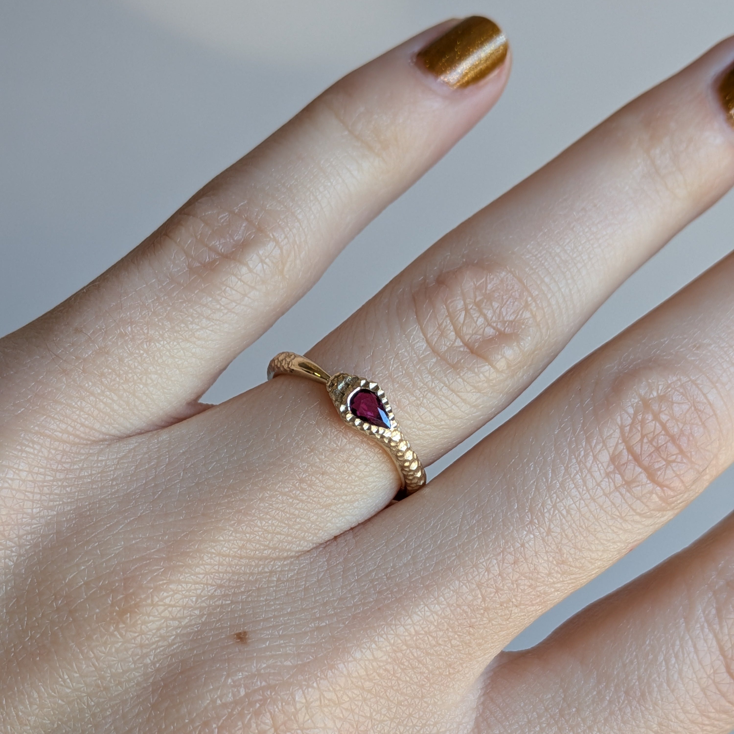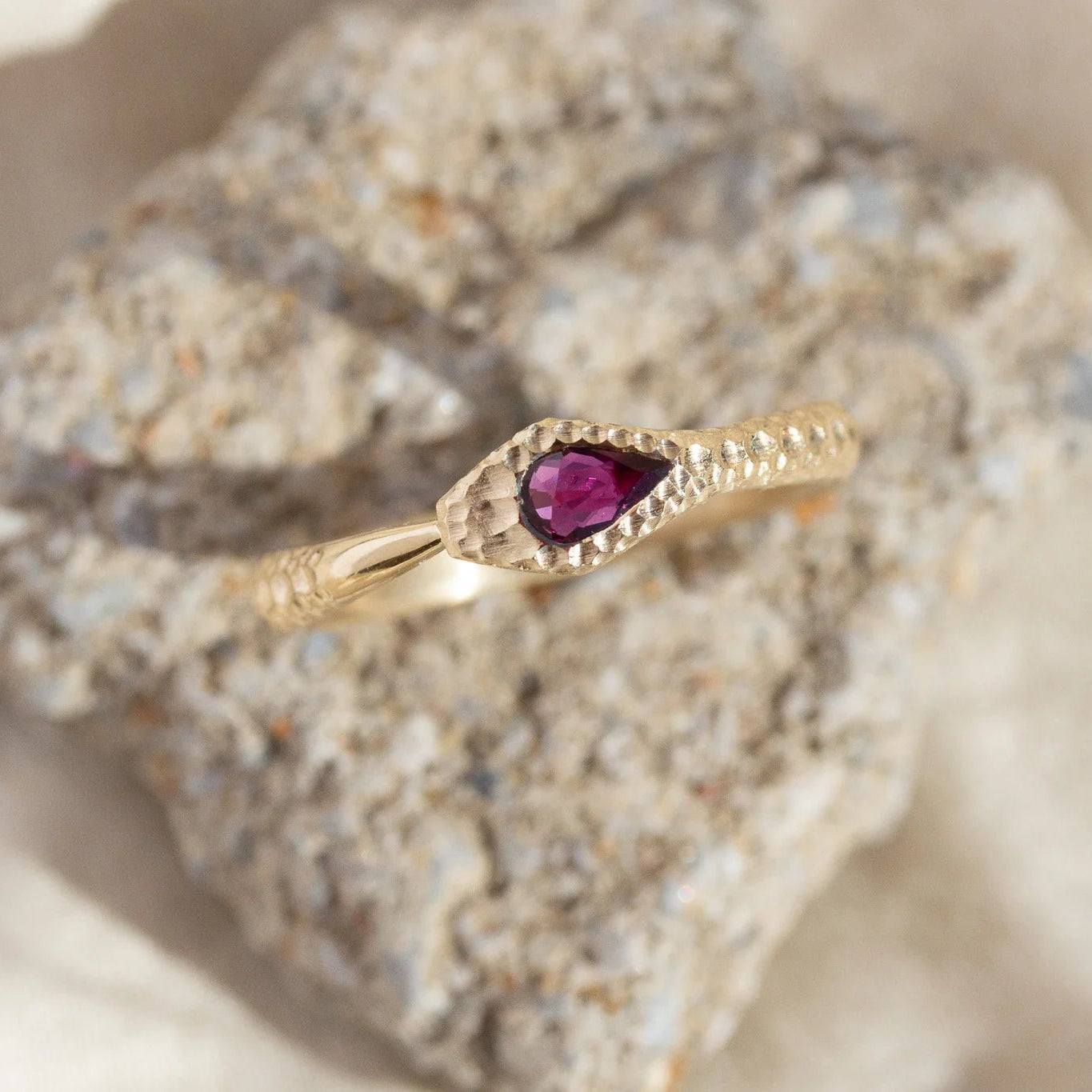 Leili's representation of the ouroboros motif. First carved in wax and cast in gold. Adorned with a pear cut ruby and a hand-hewn texture.