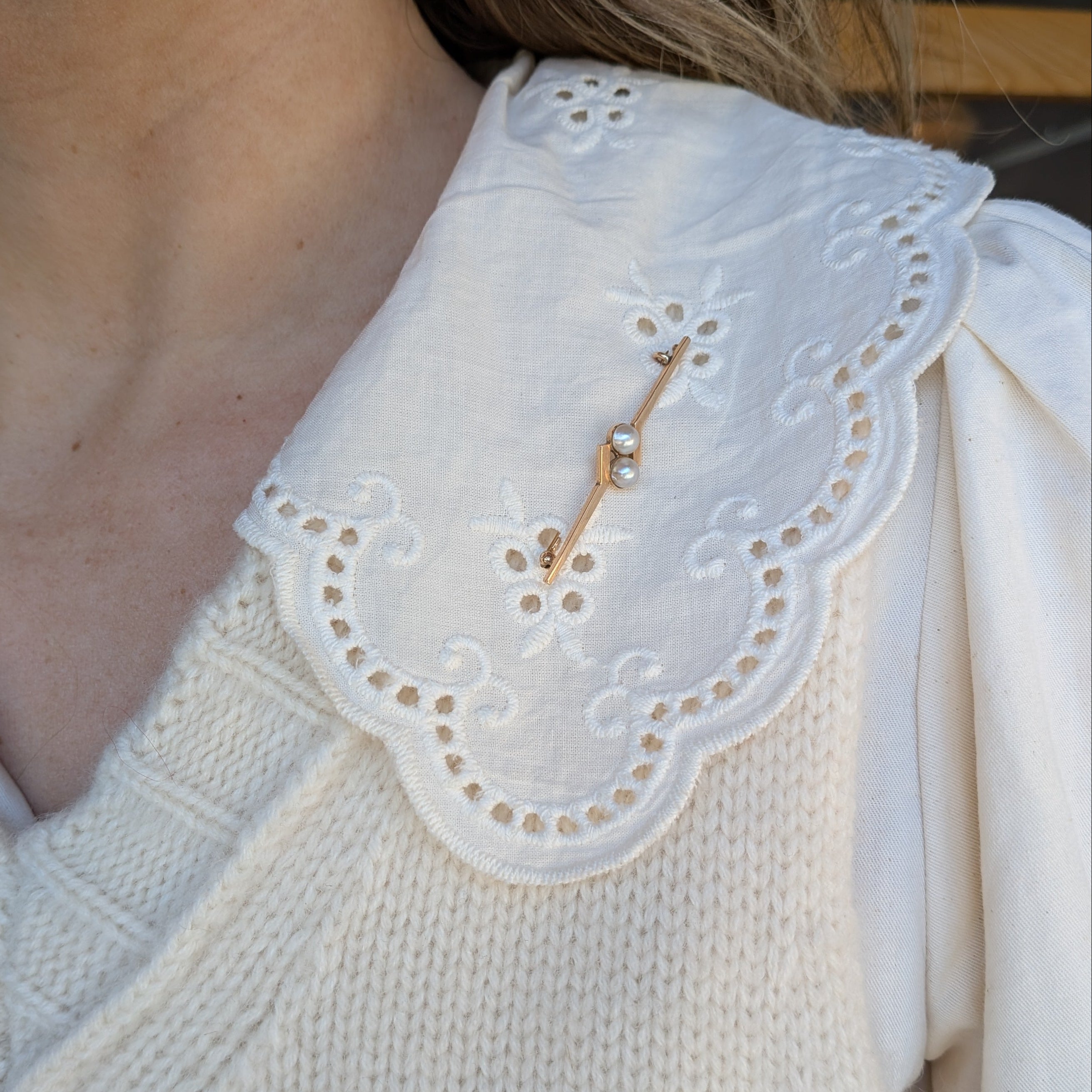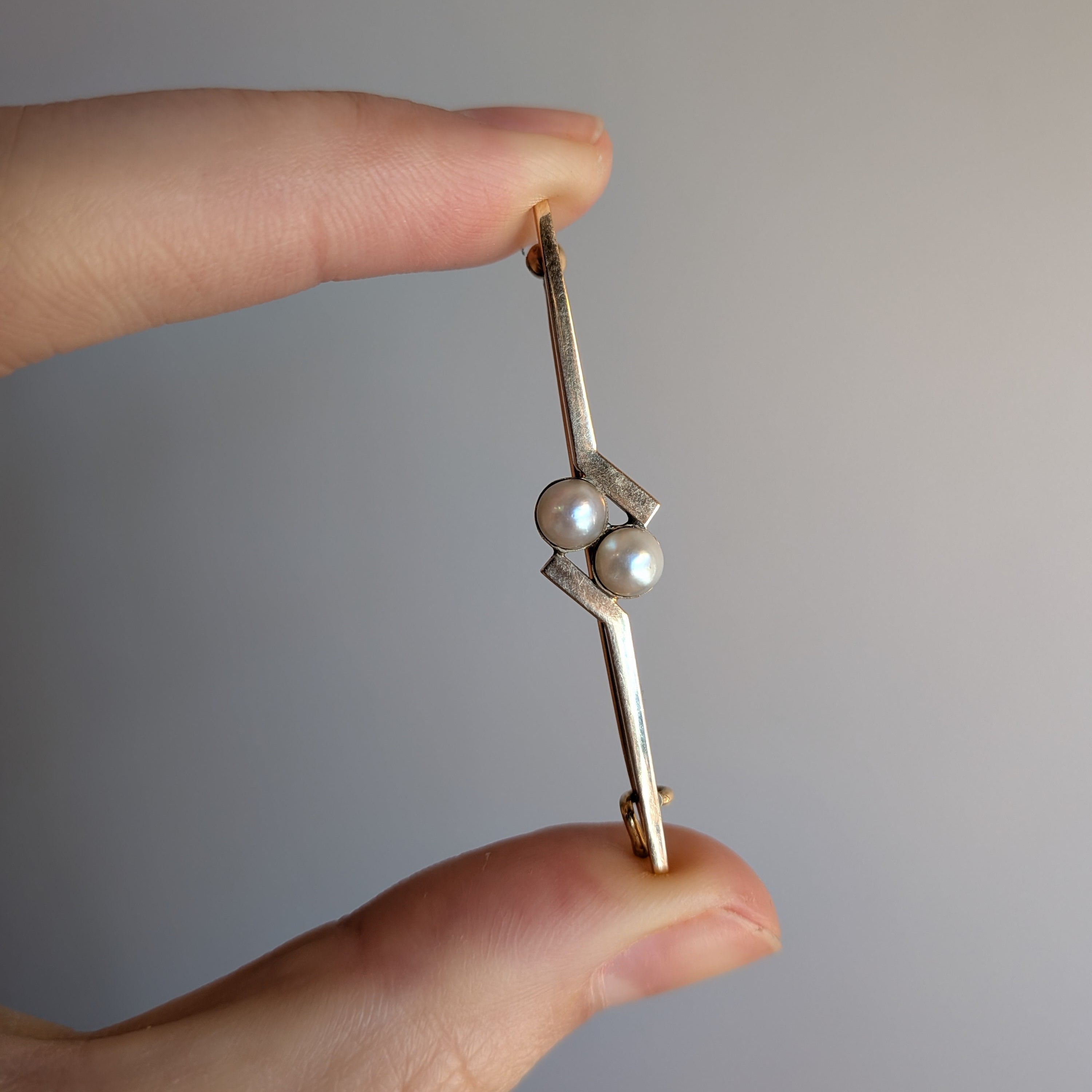A vintage pin featuring two pearls nestled in 14k yellow gold bars.