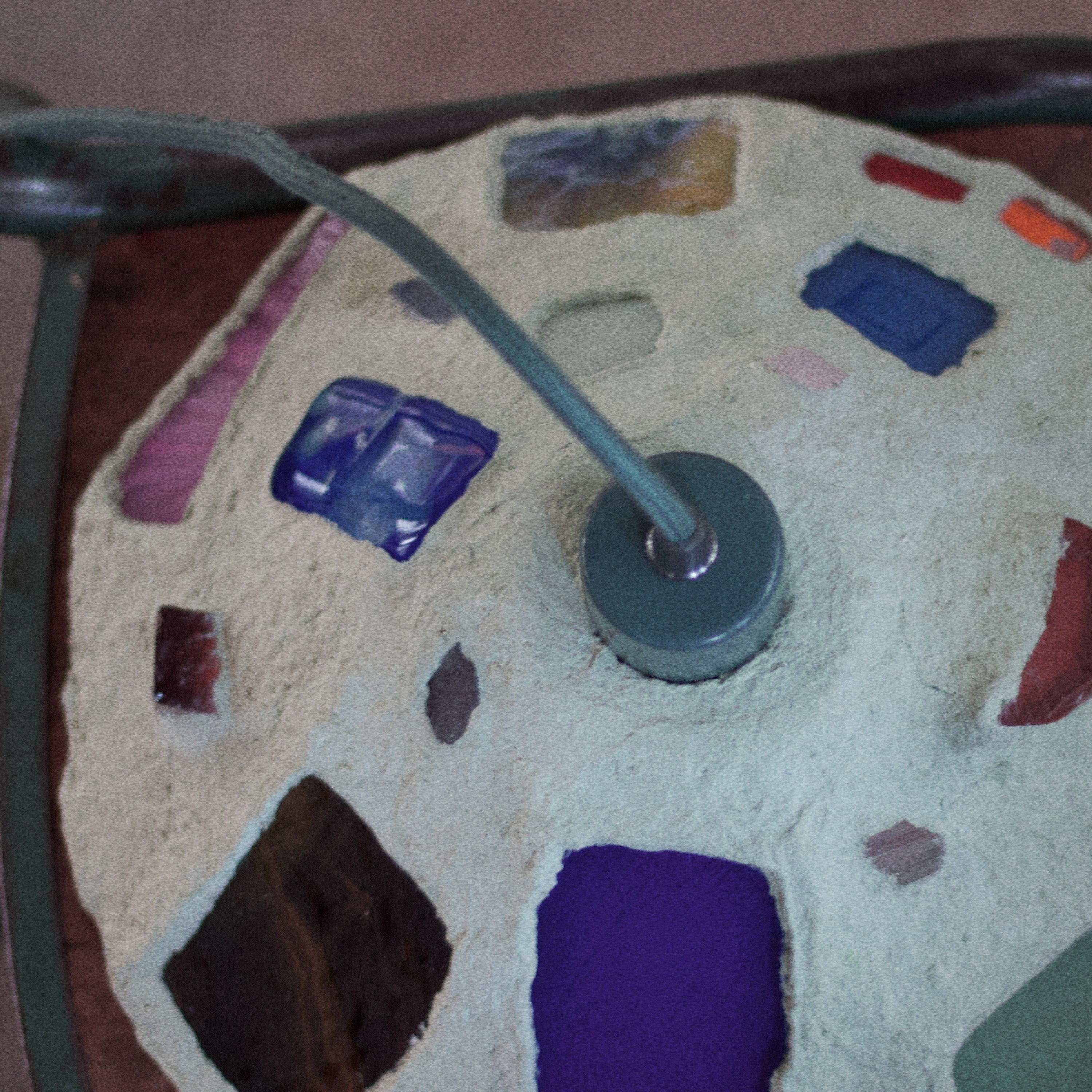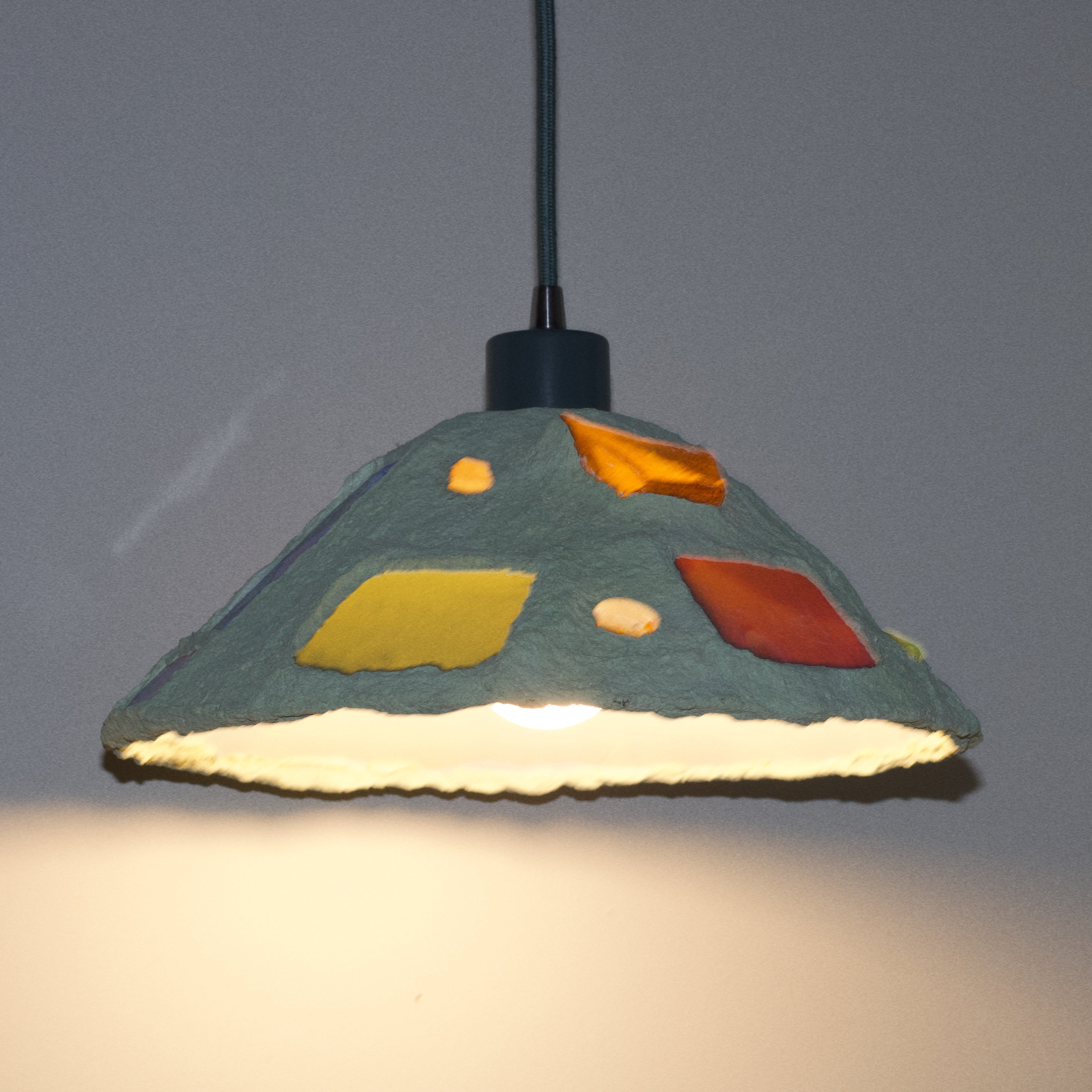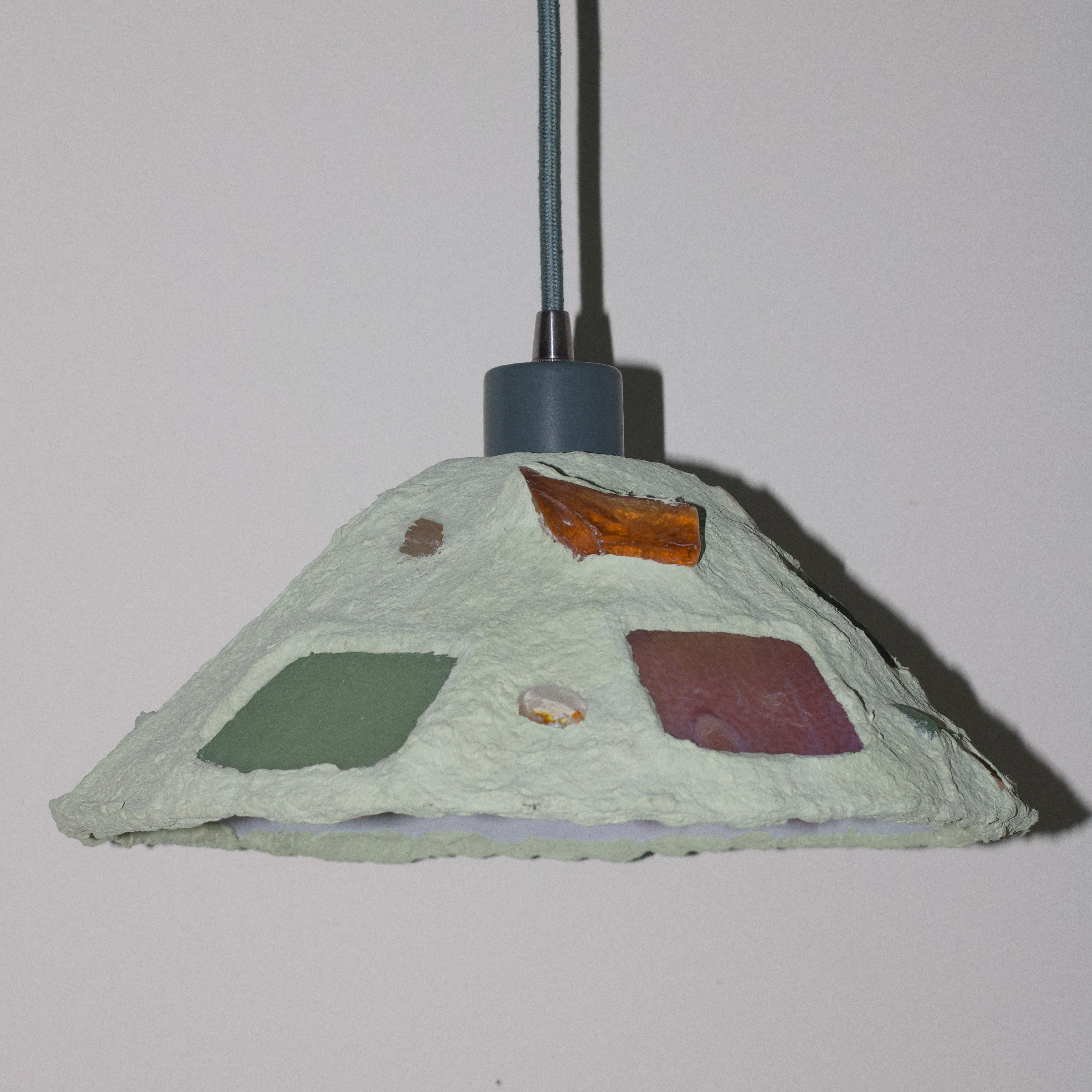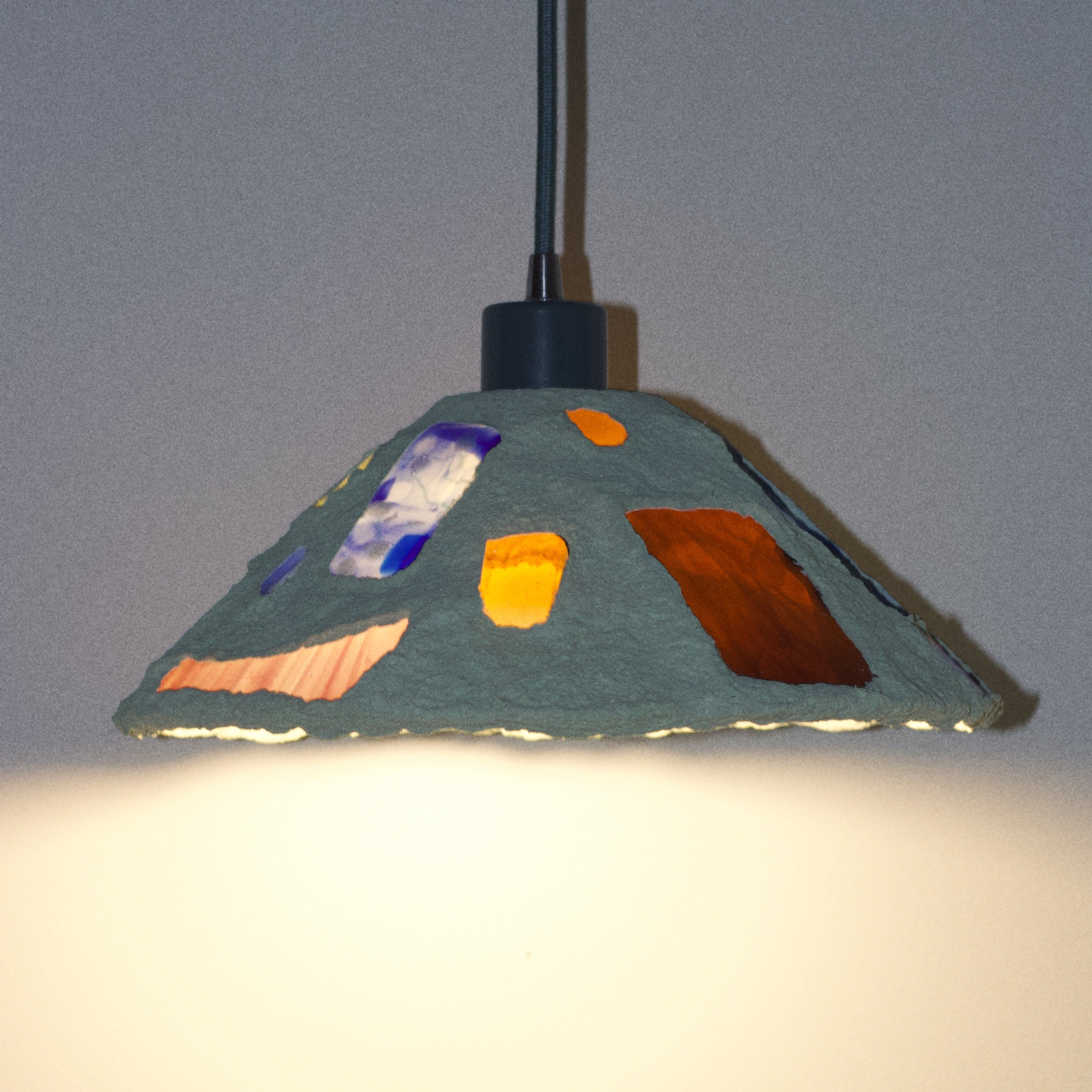 These pendant light shades are made with existing (sometimes reused) glass shades with additional colorful glass and sculptural elementsencapsulated in paper clay that is made with recycled paper pulp. Each shade is handmade, unique and delightful from every angle illuminated or not.