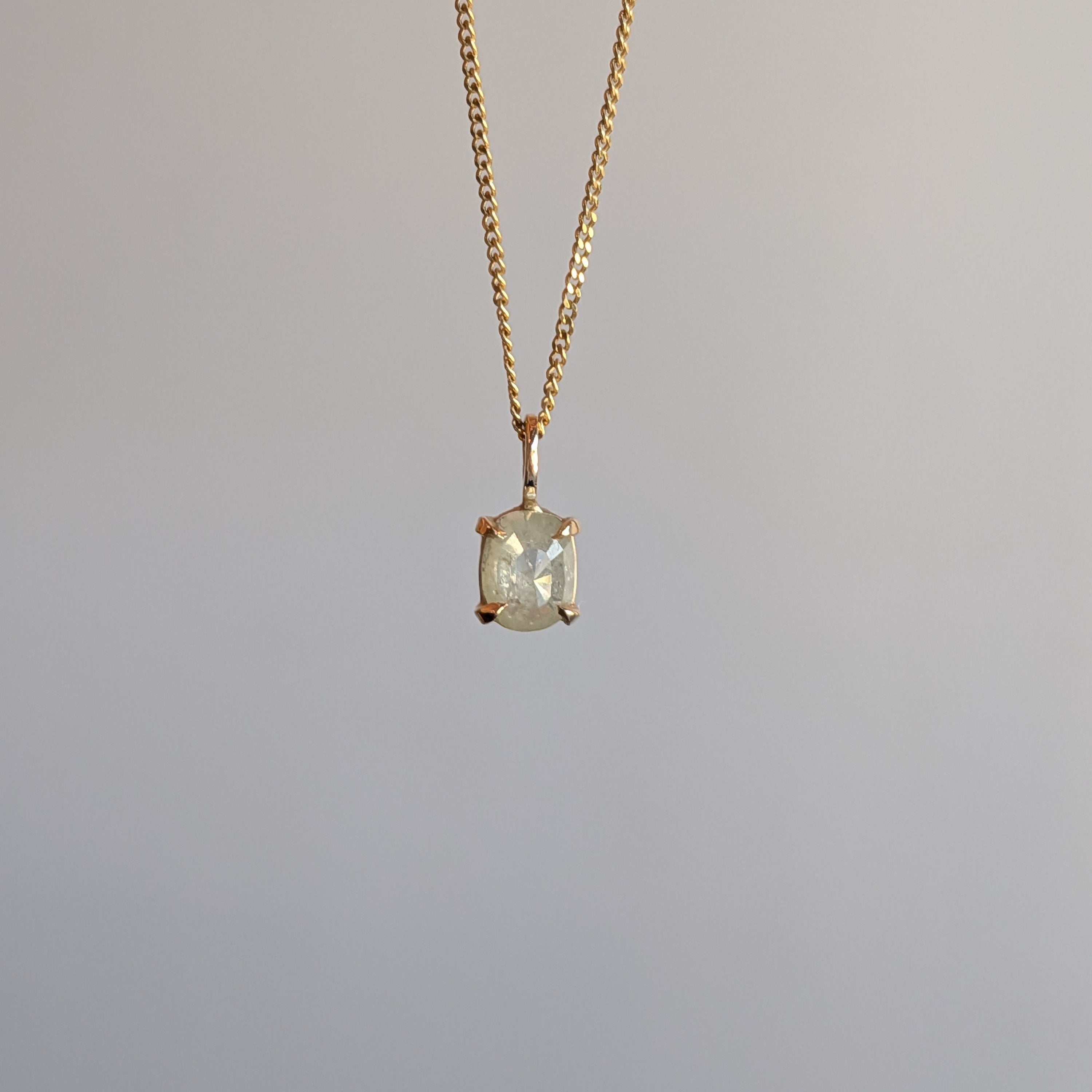 14k yellow gold prong setting with oval green/gray diamond. Suspended form a 14k yellow gold curb chain.