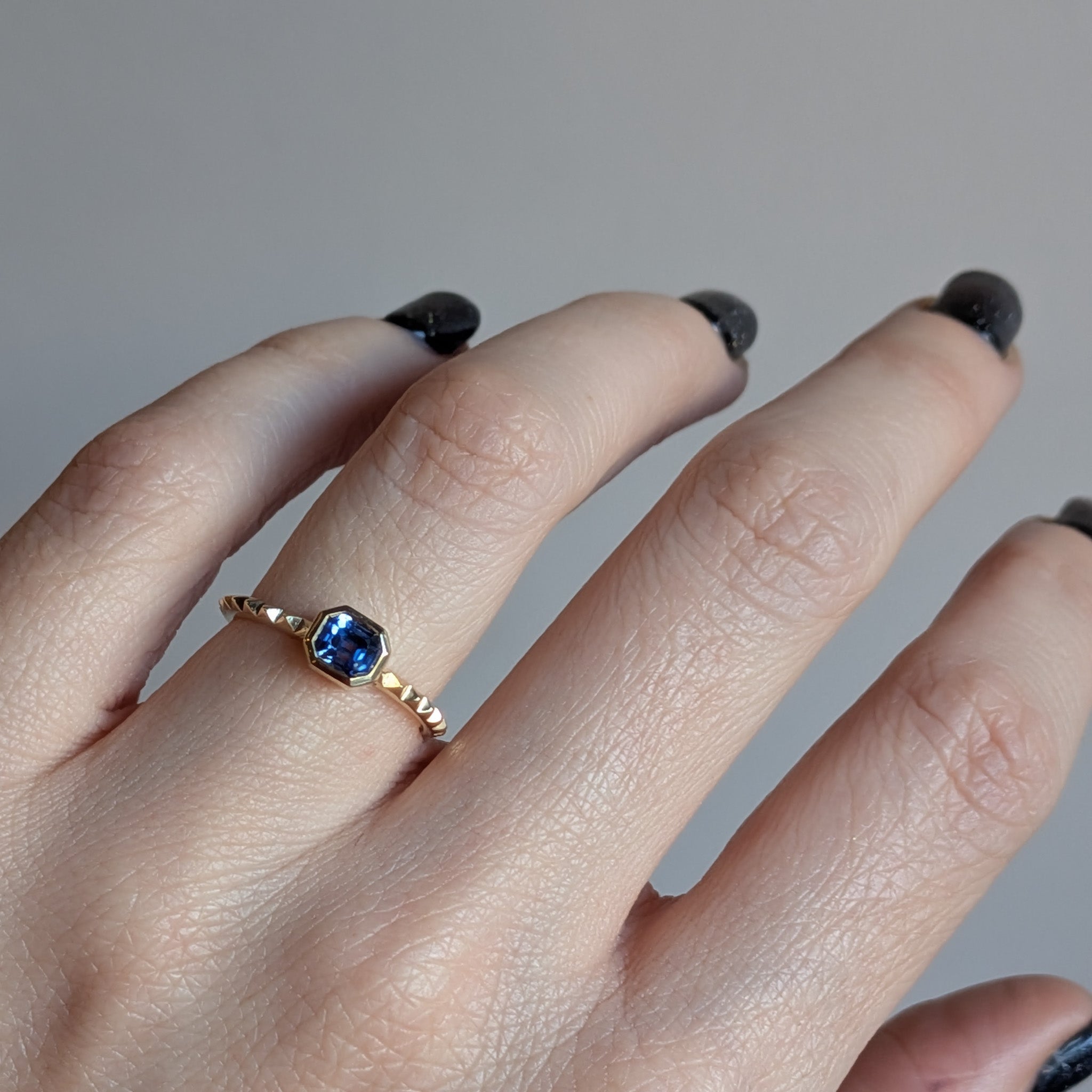 Kima's signature pyramid band makes for an unexpected anchor for a classic bezel-set asscher cut deep blue sapphire. A perfect comfortable ring for stacking or daily wear, and a lovely alternative choice for an engagement ring.