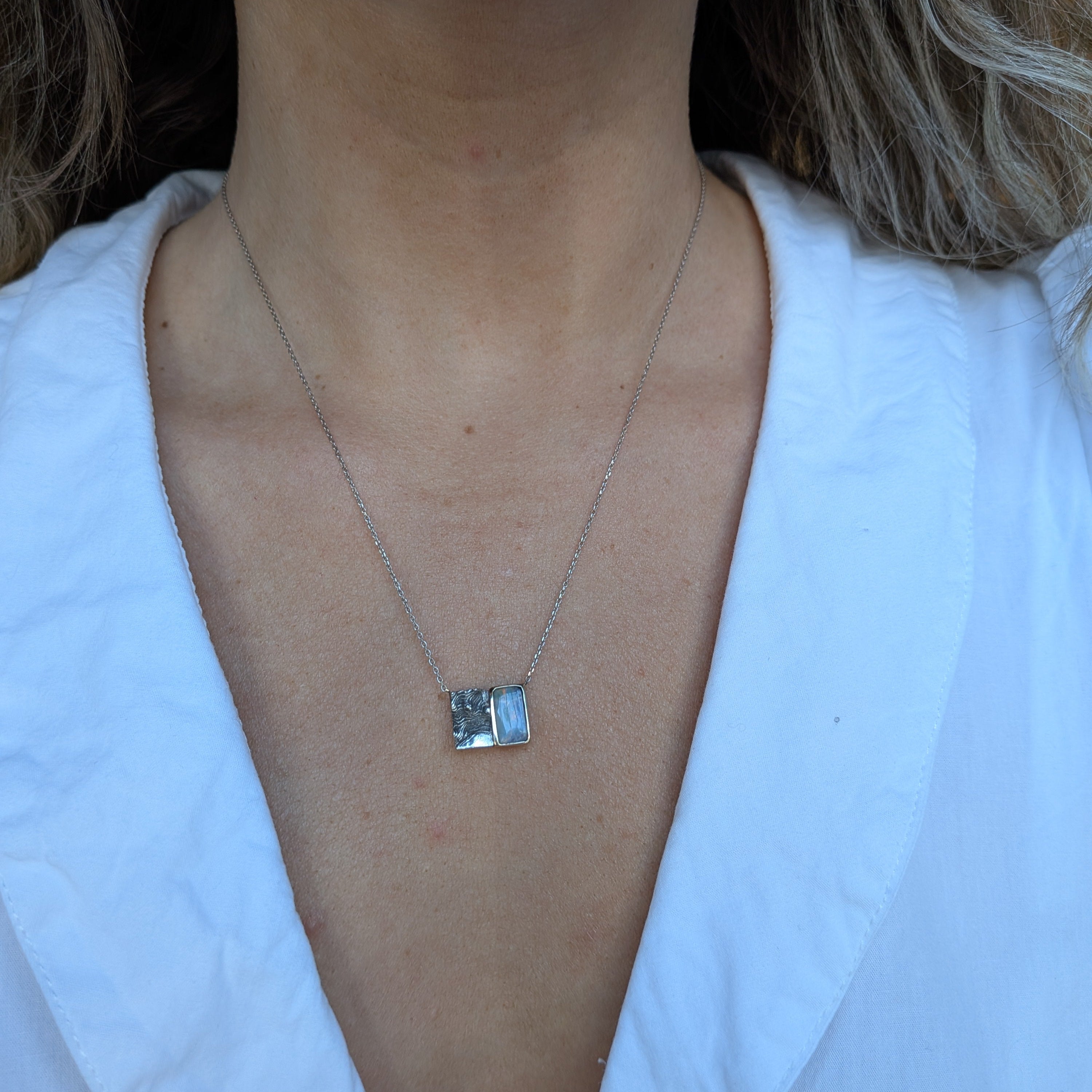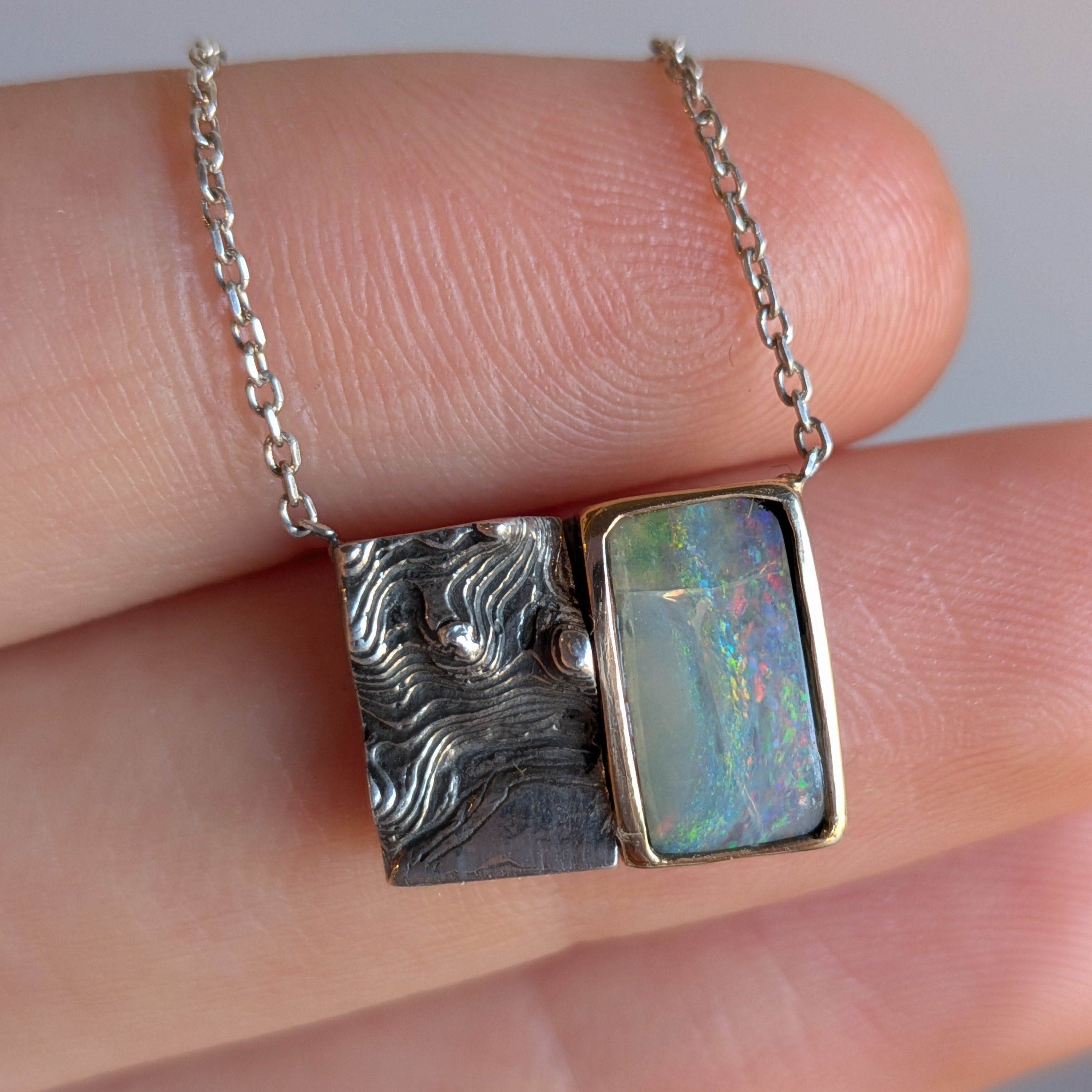 Sterling silver pendant with topographically accurate detail of Reykhavik, nestled next to a boulder opal set in 14k yellow gold bezel.