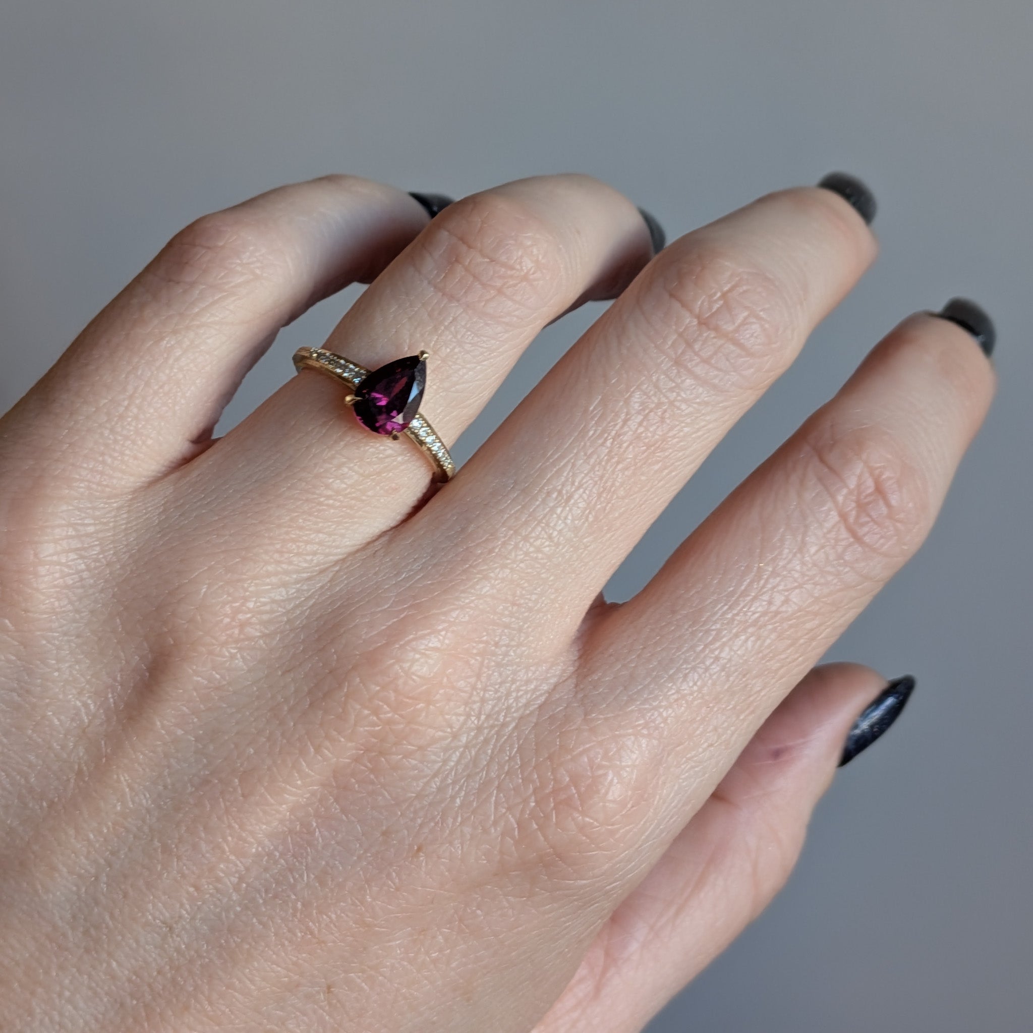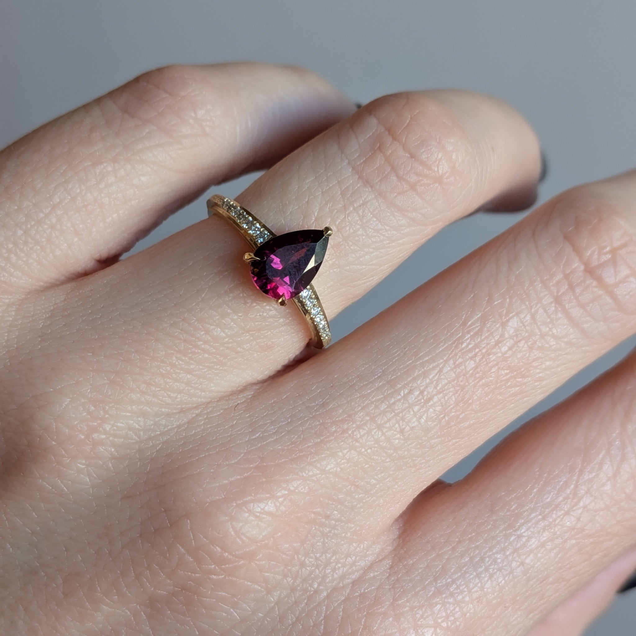 A glamorous twist on a classic solitaire. The Rhodalite Monaco features berry-sweet rhodalite garnet pear with white diamond pavé along the stepped band. Set in a low profile, solid 14k gold setting, this piece exudes Old Hollywood charm.