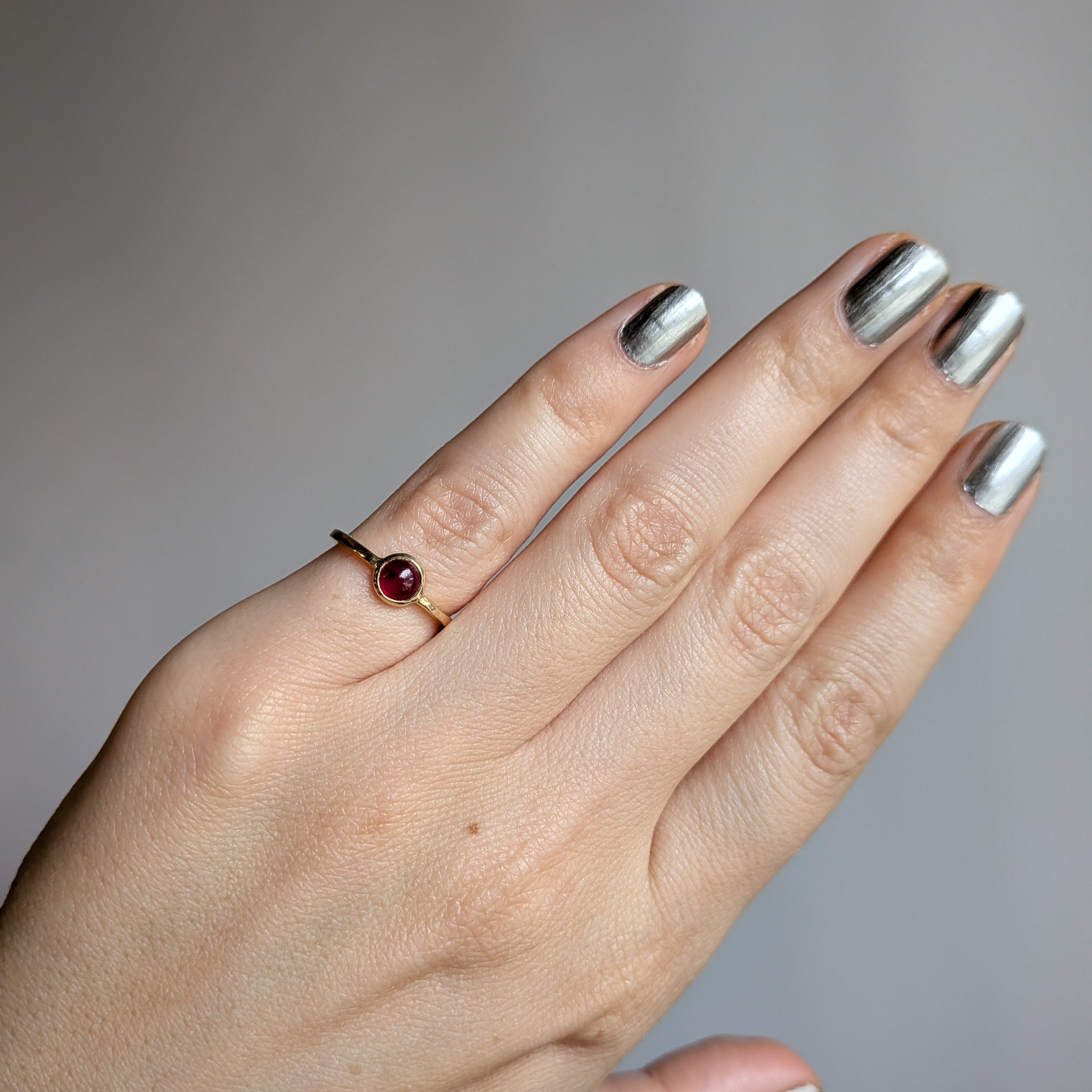 14k yellow gold solitaire ring with bezel set ruby cabochon.