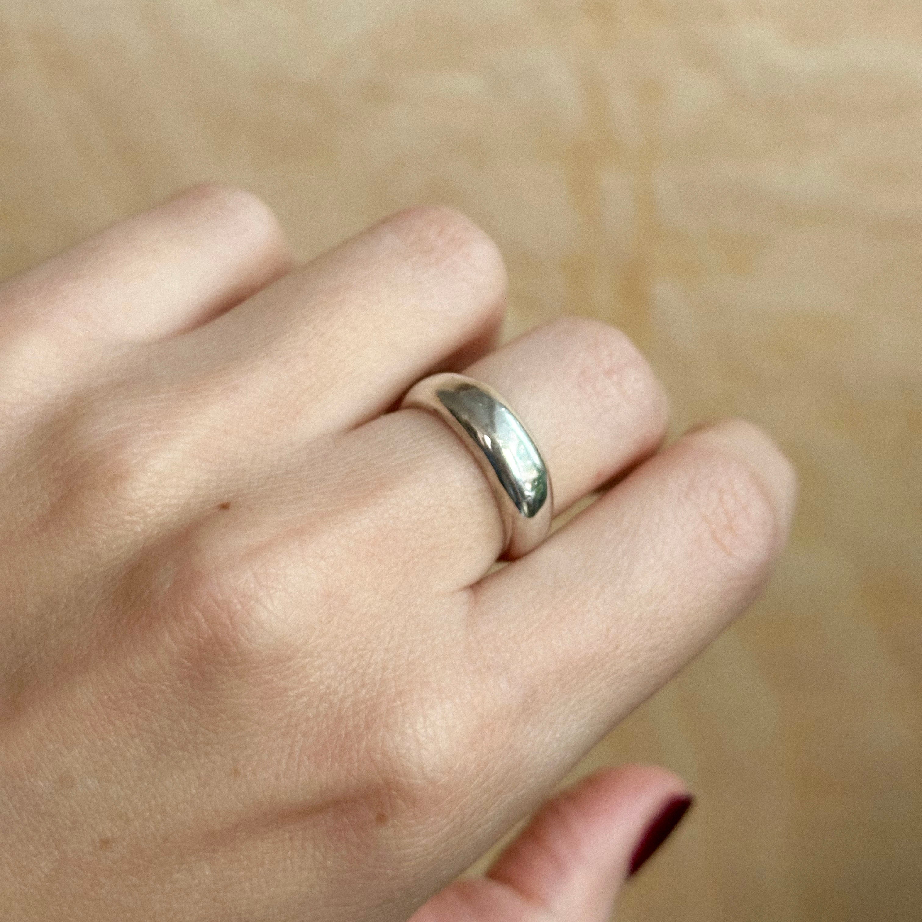A study in light and form. This ring features a smooth, rounded dome of bright sterling silver — cool, reflective, and weighty in all the right ways. A sculptural statement piece that elevates the everyday.