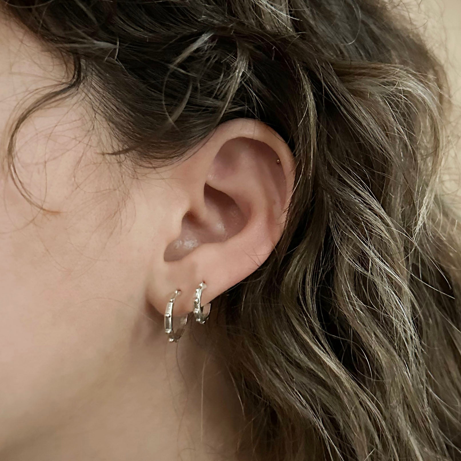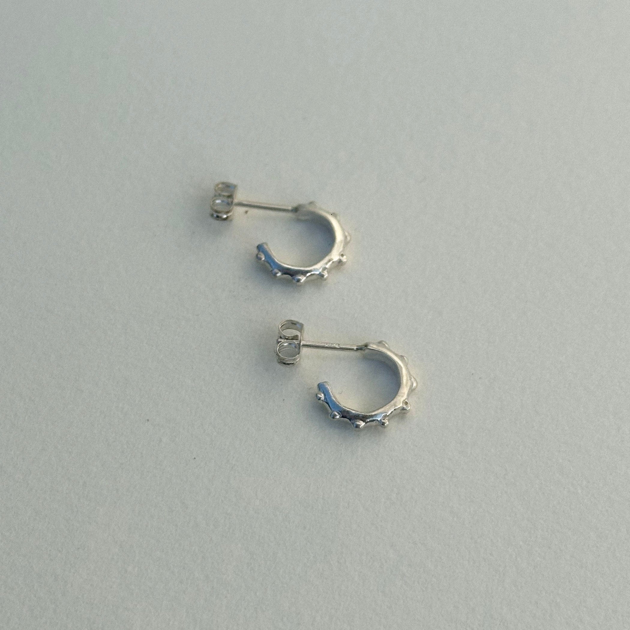 An everyday essential crafted in sterling silver, these textural studded earrings embody a mood- their tactile surface gives an interesting edge. Designed to hug the ear with effortless comfort.