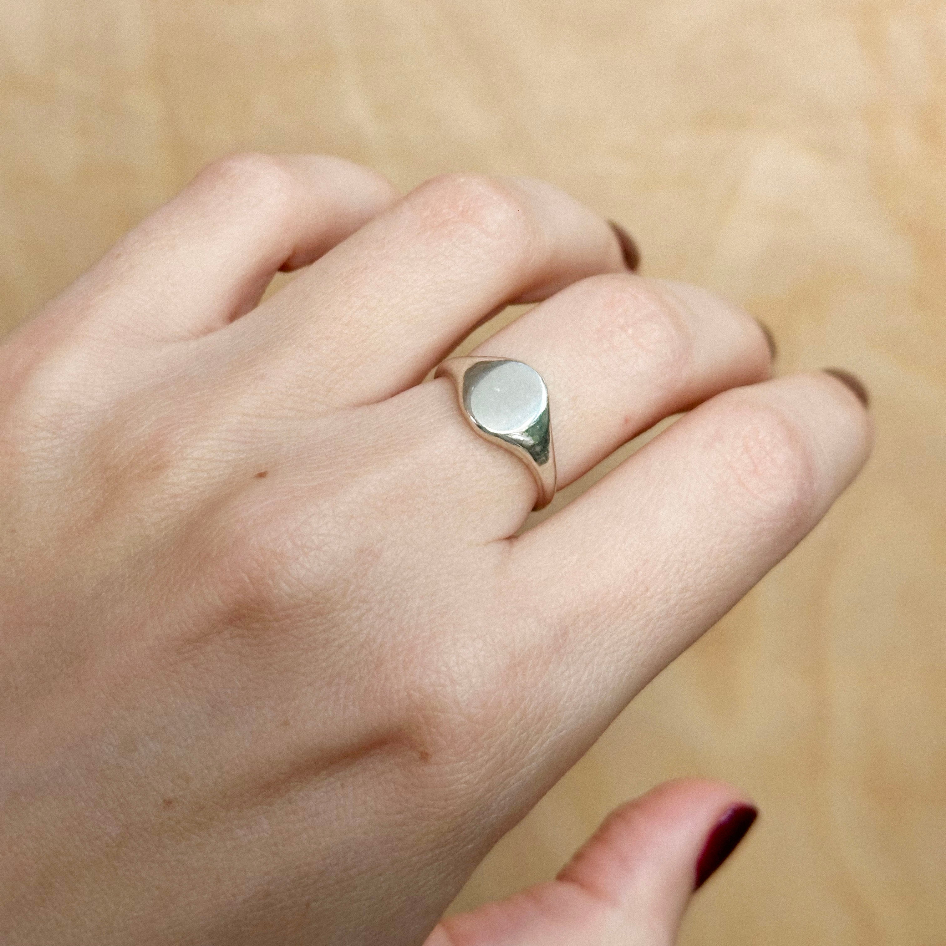 Hand carved signet ring in sterling silver. Curvy, classic, and perfect for any finger.
