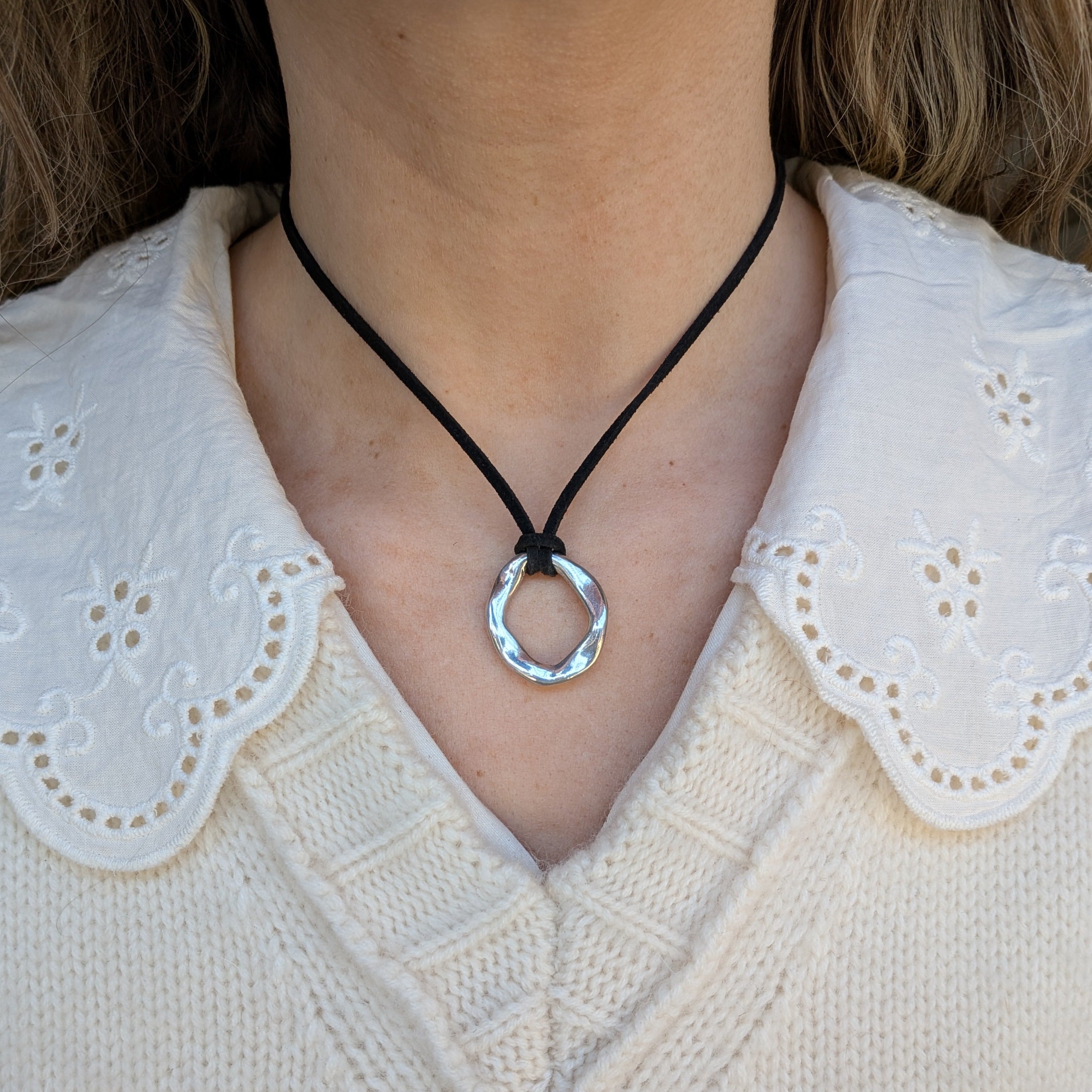 Ladha's signature "maji" motif is an organic, fluid oval shape shown here in sterling silver. Suspended from a black cord, finished with silver end caps and a handmade cast silver bead that allows for versatile, adjustable styling.