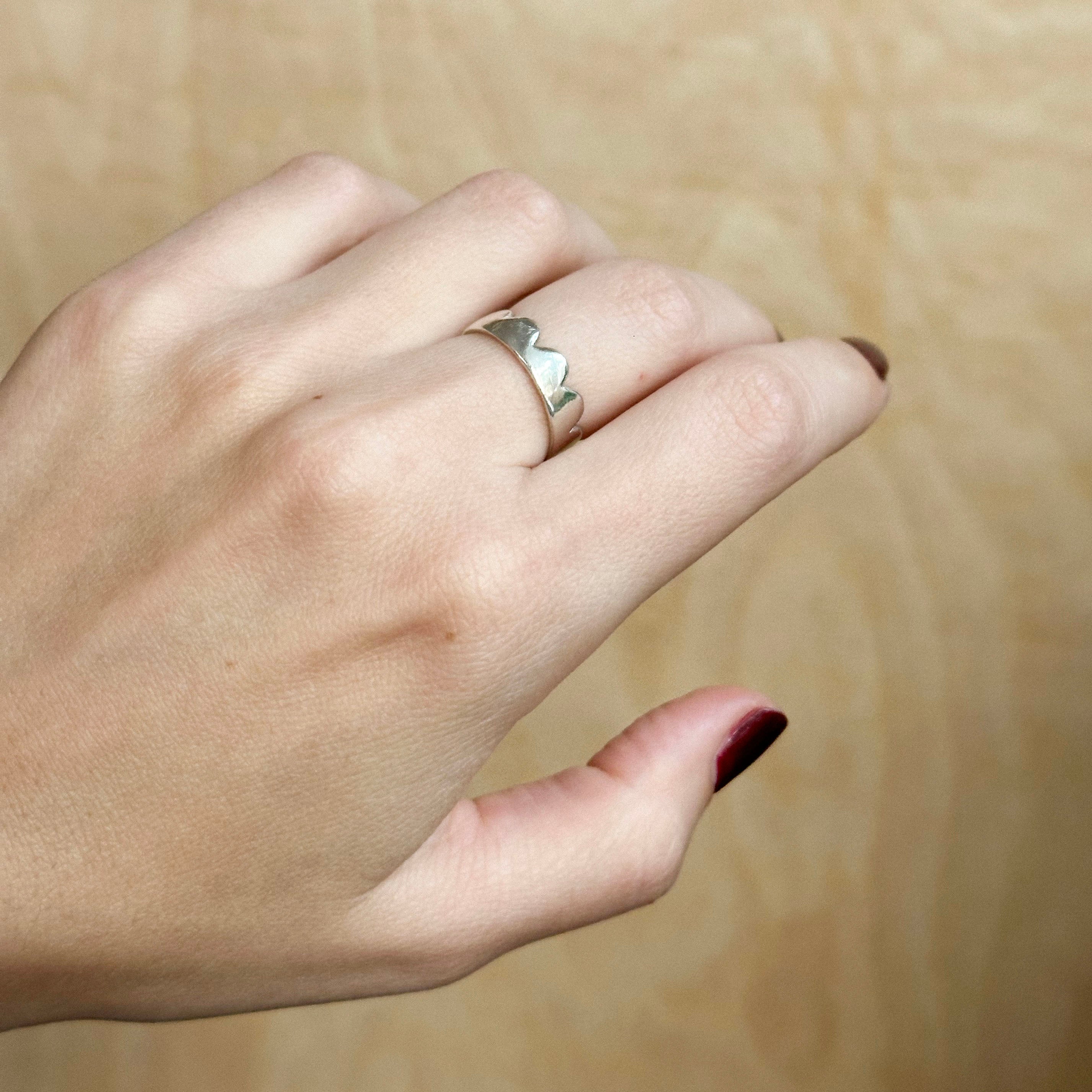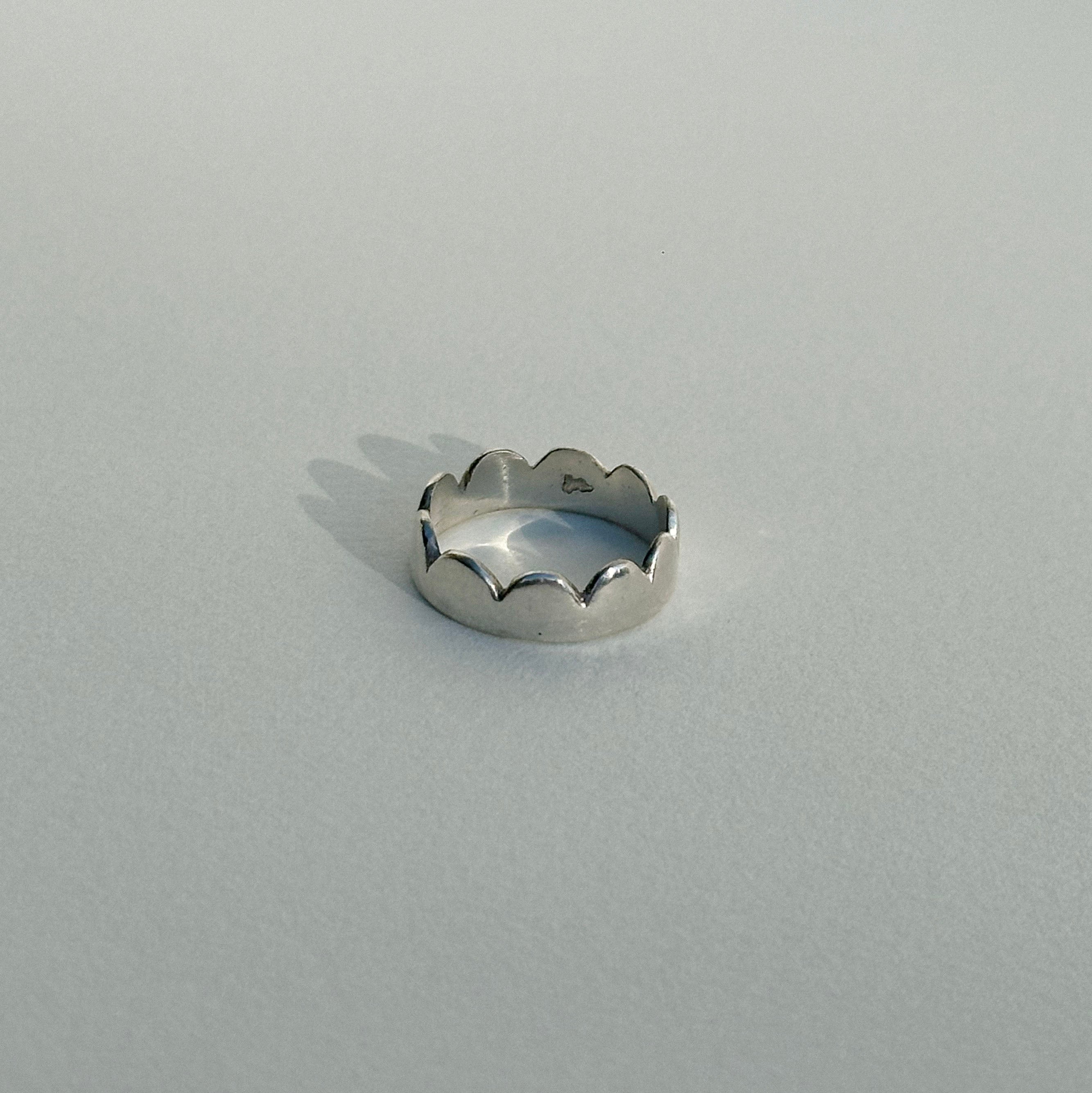 Cast in bright sterling silver, the scalloped edge hints at a crown — understated yet playful. Sculptural and fun to wear alone or stacked with other rings.