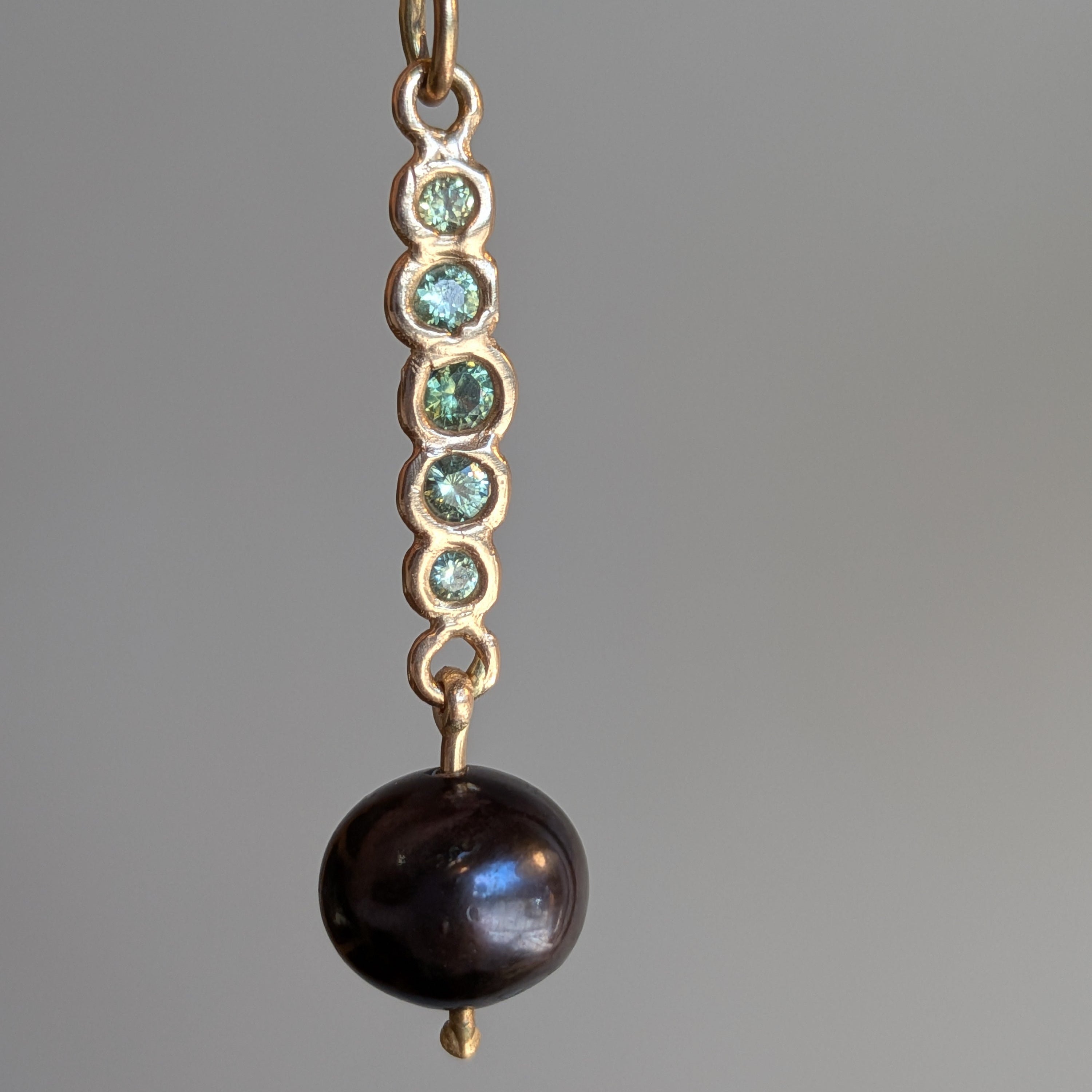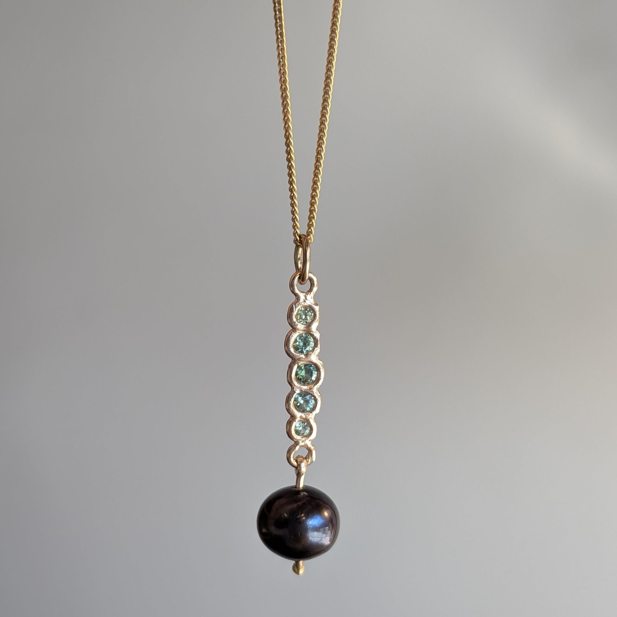 Cast in place green sapphires and black pearl on 14k yellow gold curb chain.