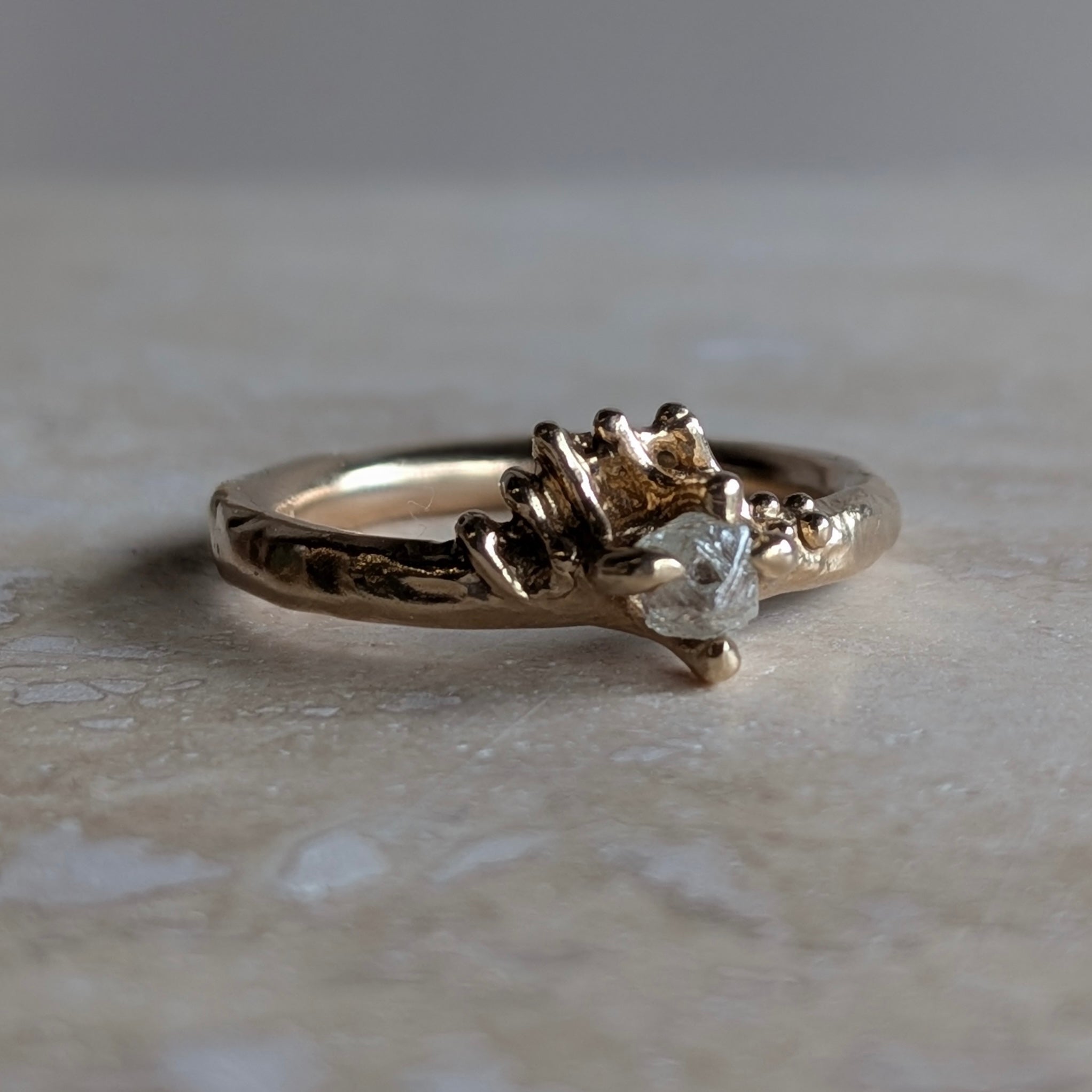 Sustainability and ethical sourcing take center stage with this beauty from Alice Clarke, which features an uncut ocean diamond. Ocean diamonds are sustainably retrieved from the ocean by local, professional divers in South Africa, using small boats and waiting for optimal conditions to minimize seabed disturbance.