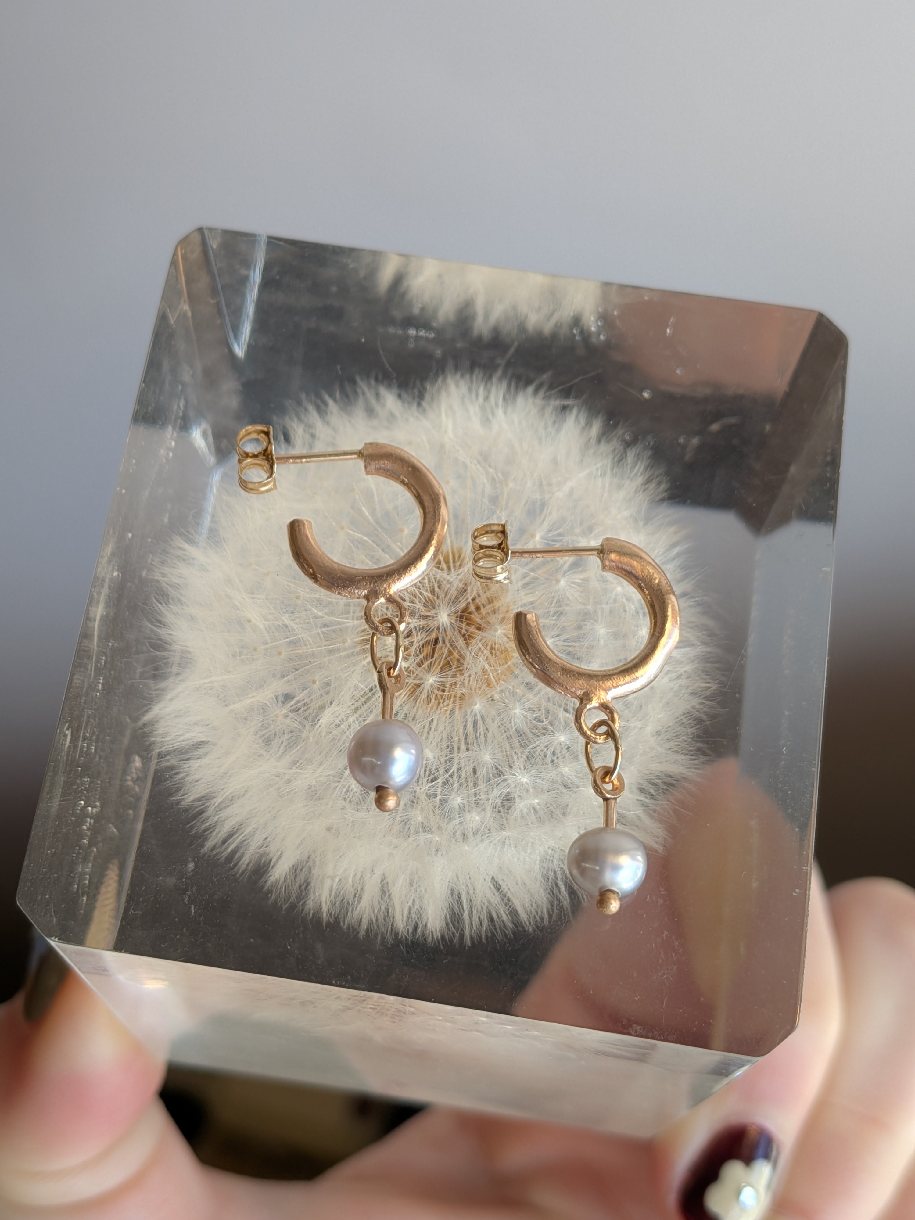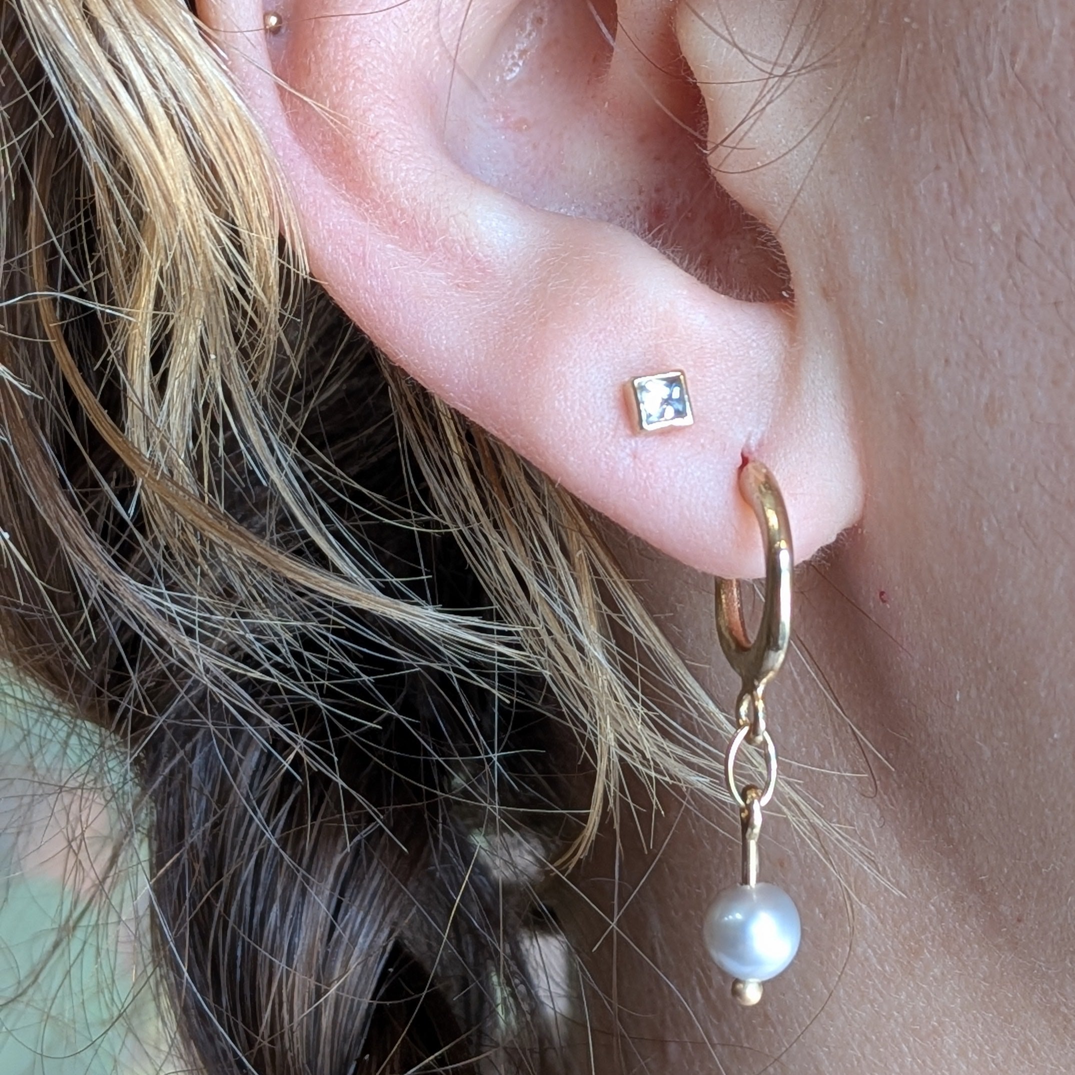 14k yellow huggie hoops with silvery freshwater pearl drops.