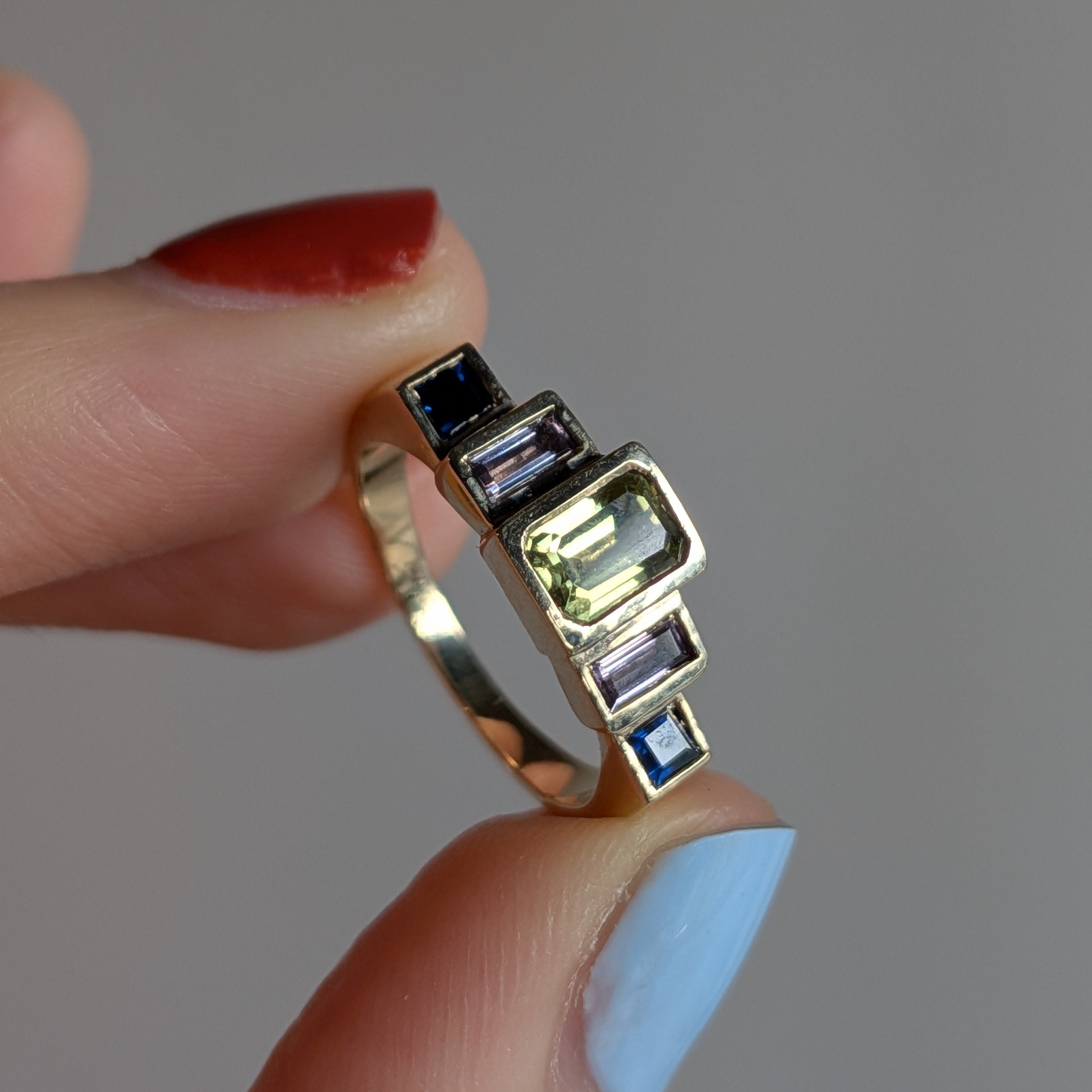 A yellow gold Steppe ring with a gorgeous green sapphire center, flanked by purple spinel baguettes and ocean blue carré cut sapphires.