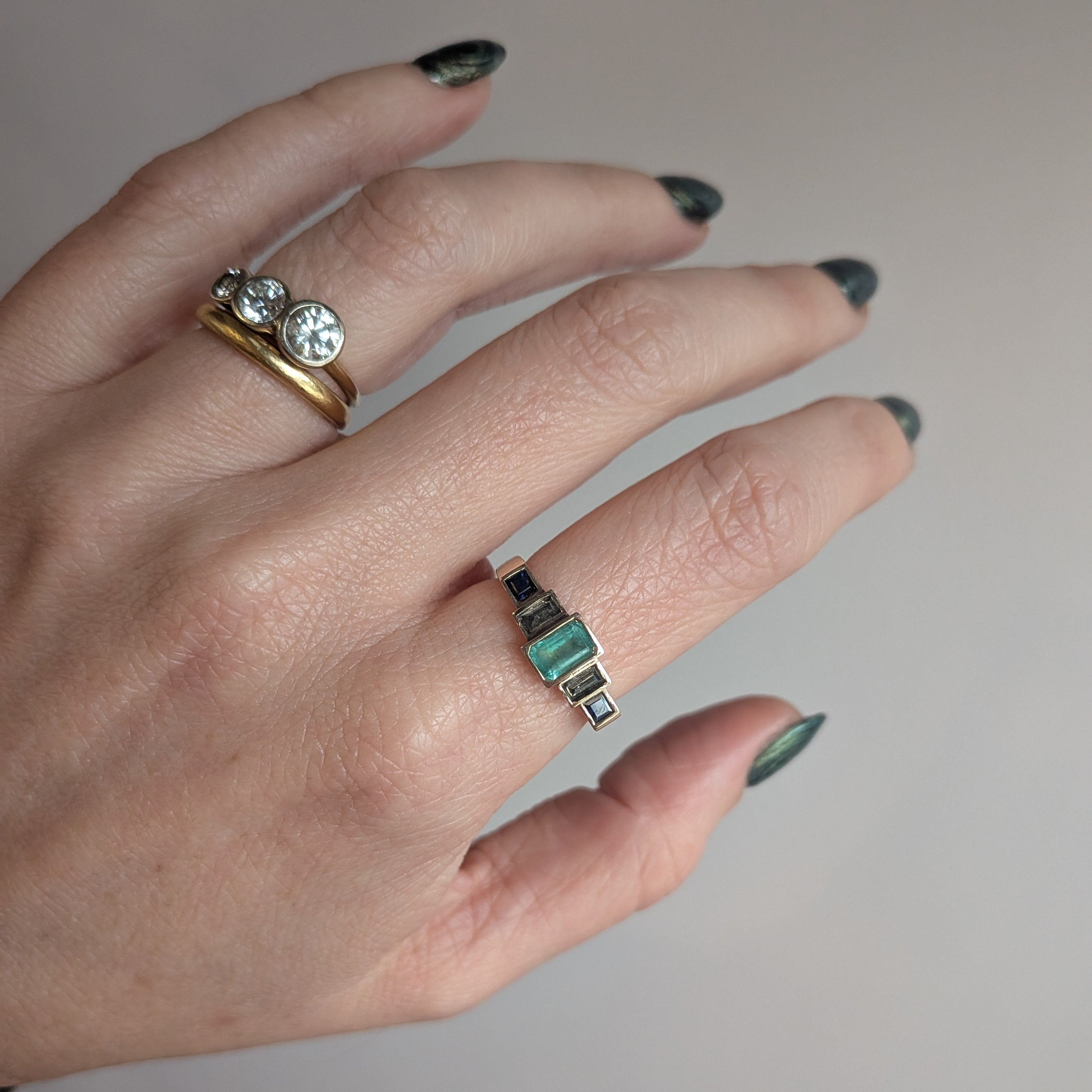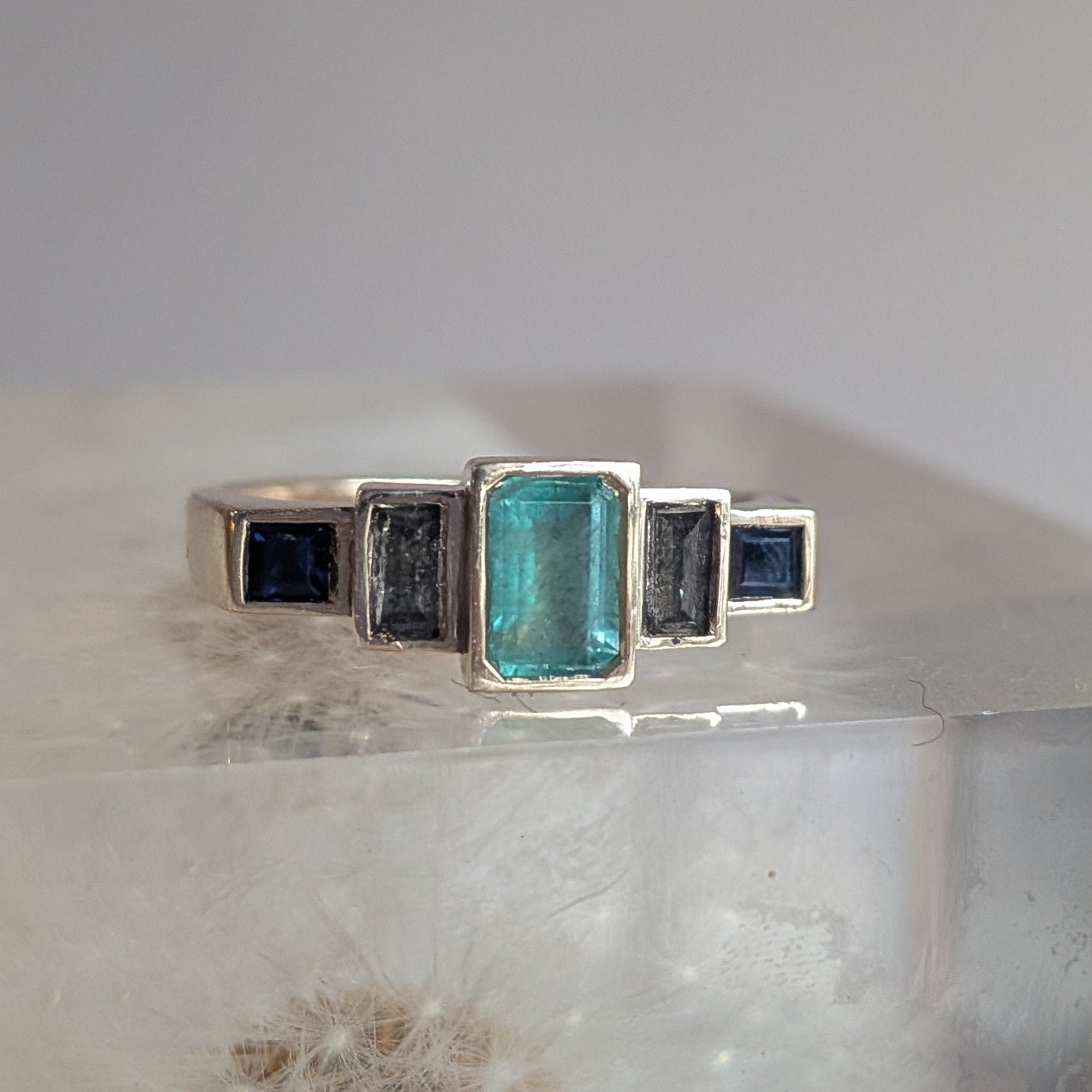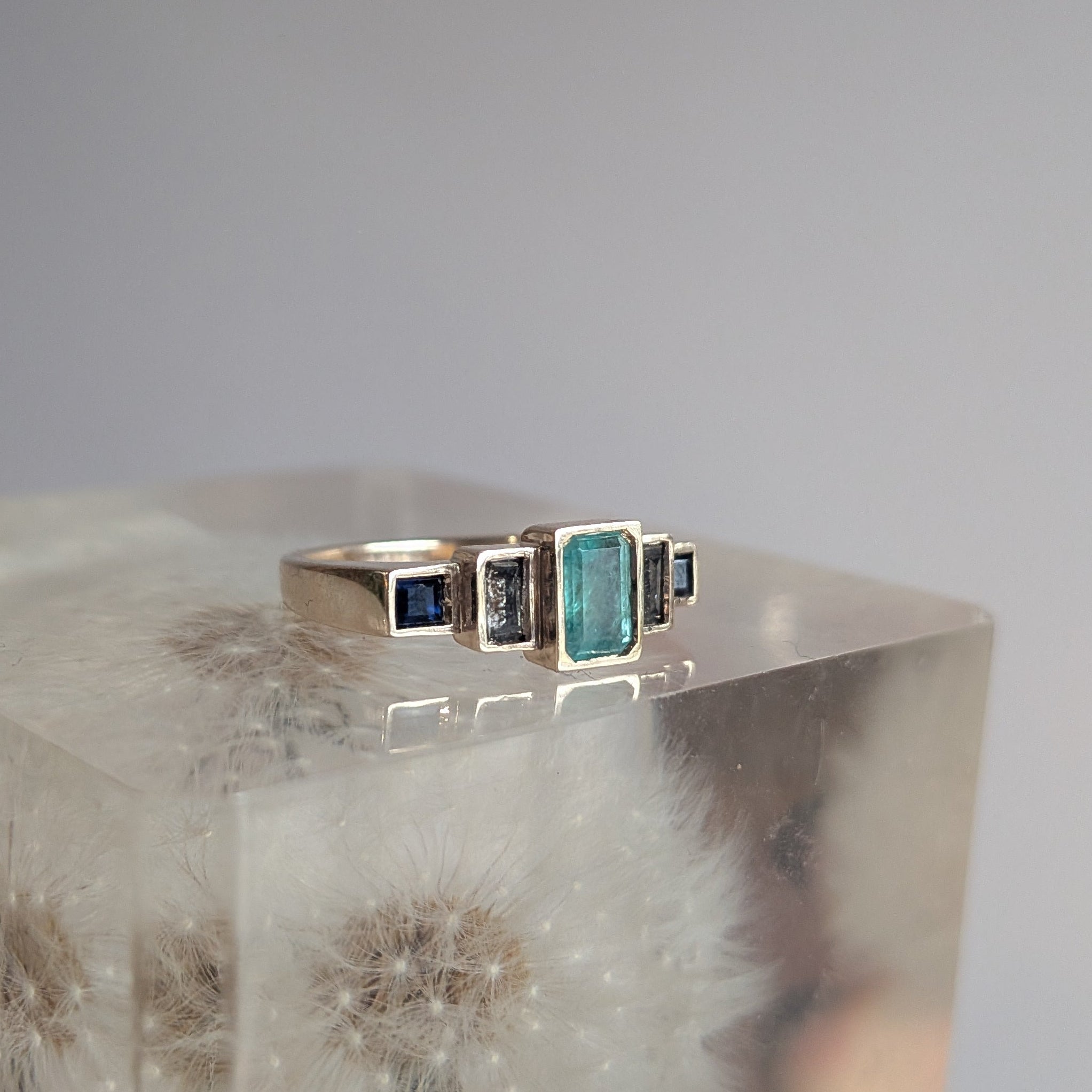 A classic combo of stones with an edgy twist, Adeline's Steppe Ring No. 54 features a richly hued emerald center, salt and pepper diamond baguettes (set upside down!), and deep blue step cut sapphires.